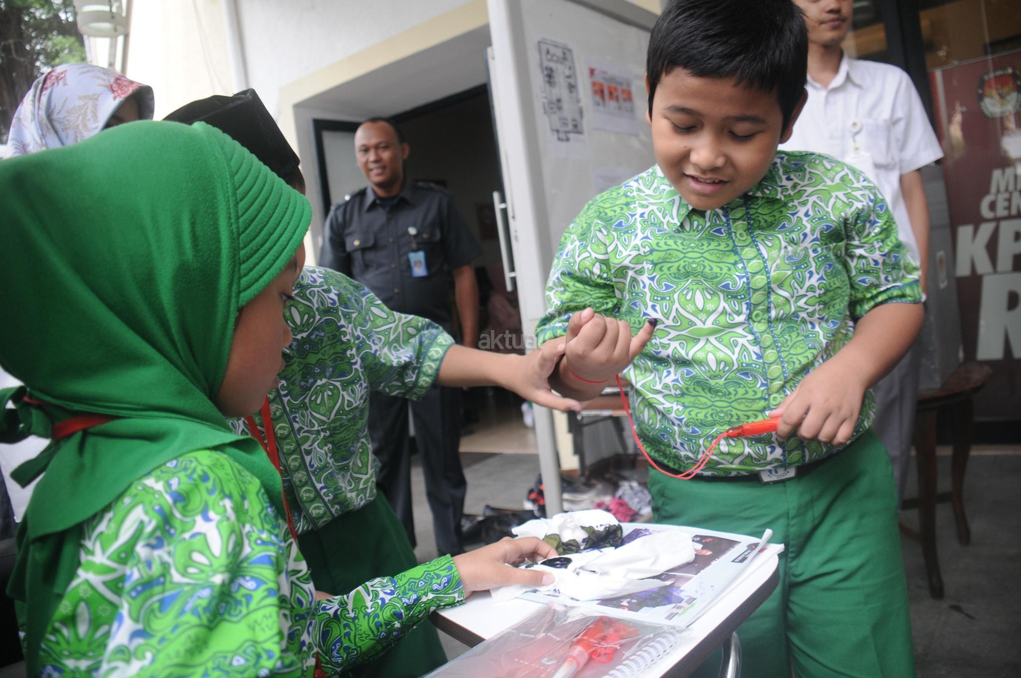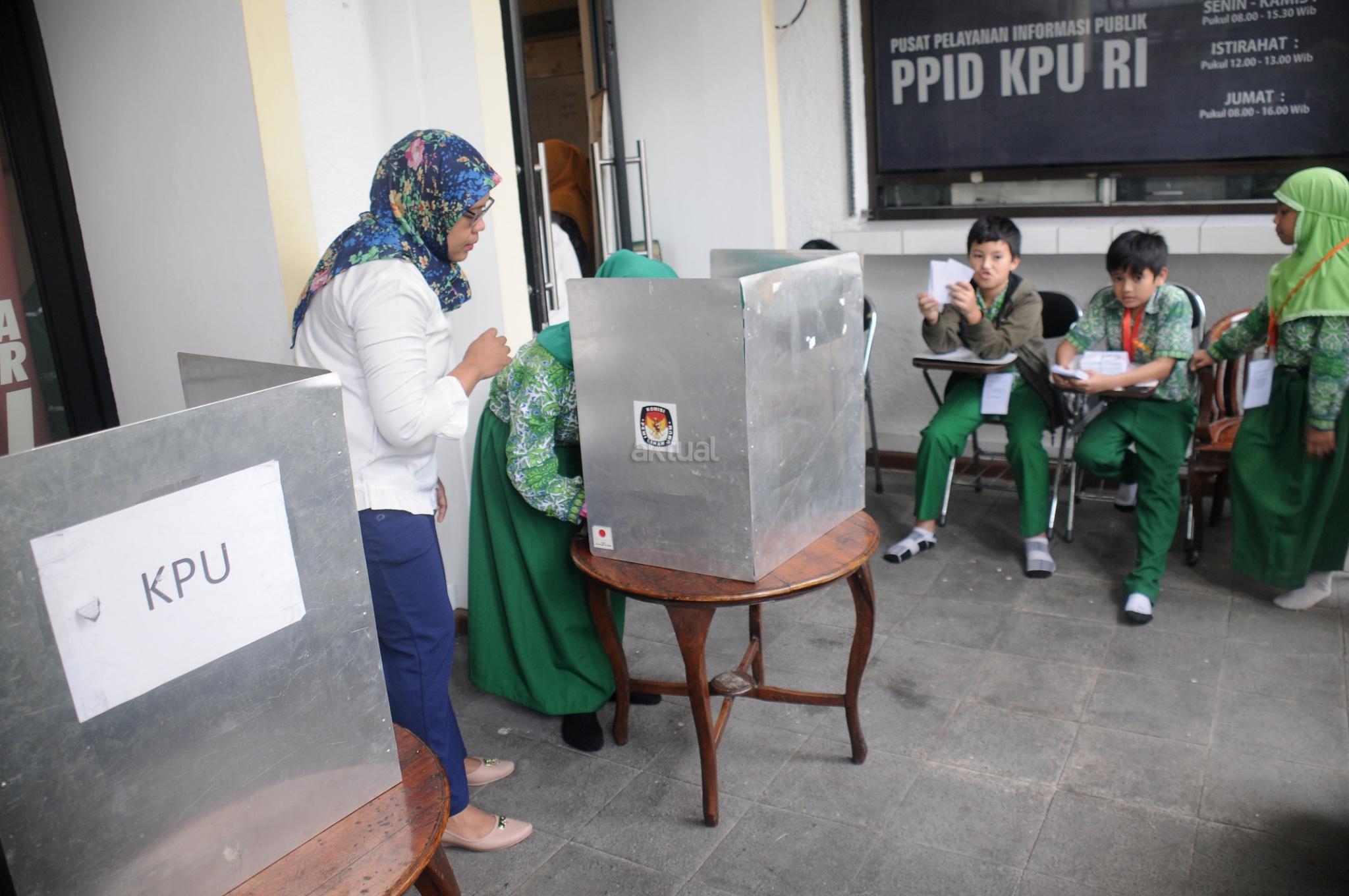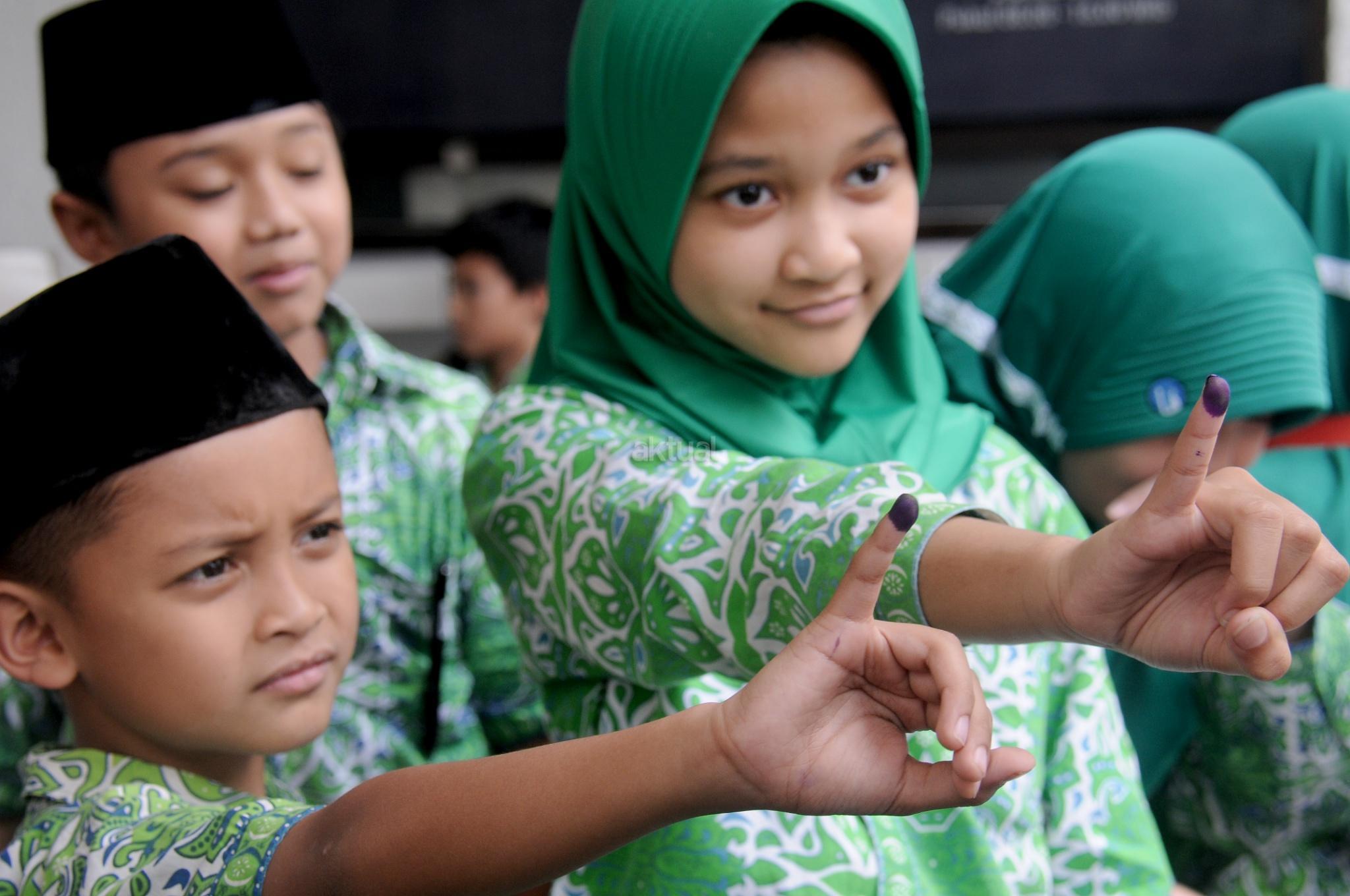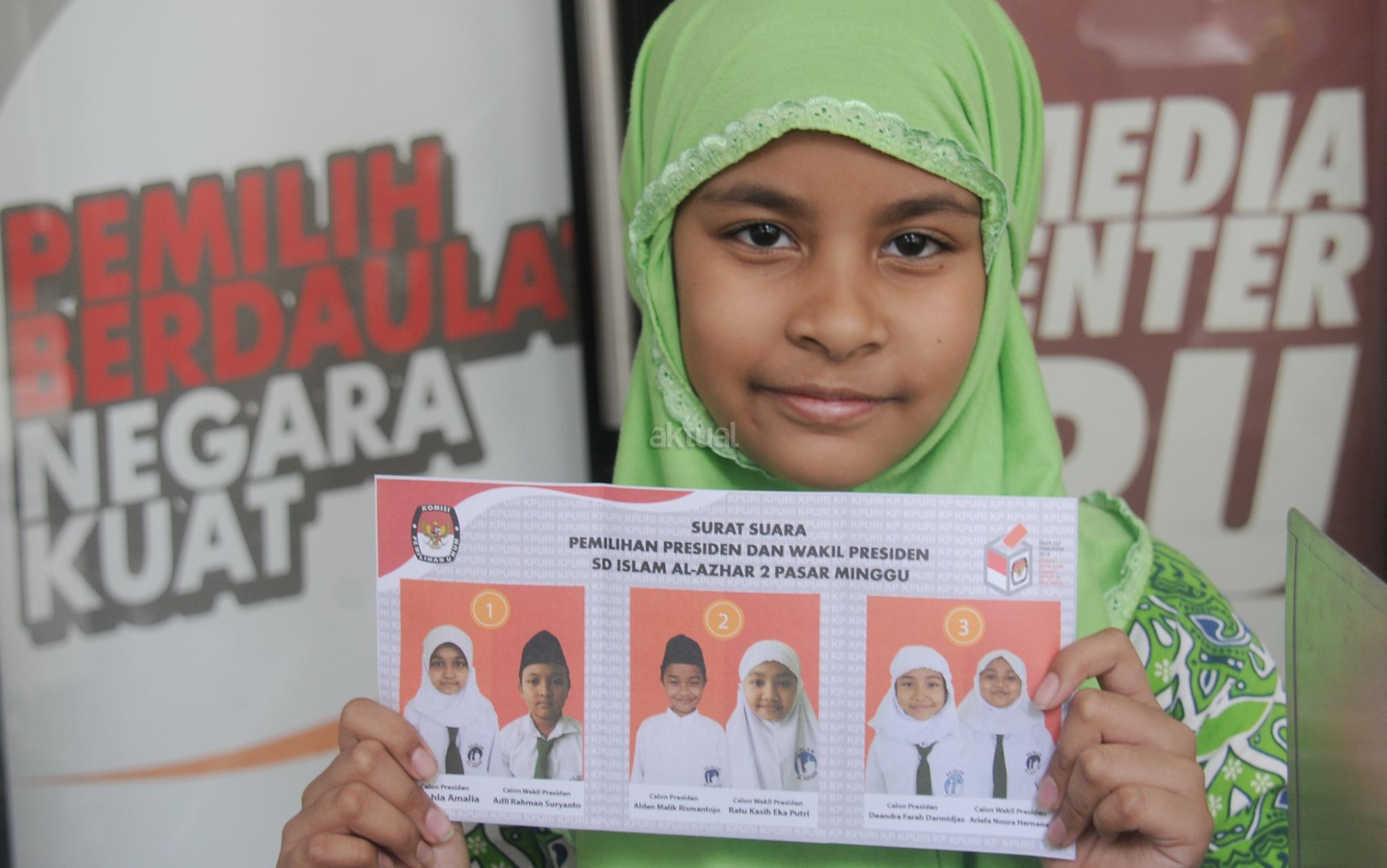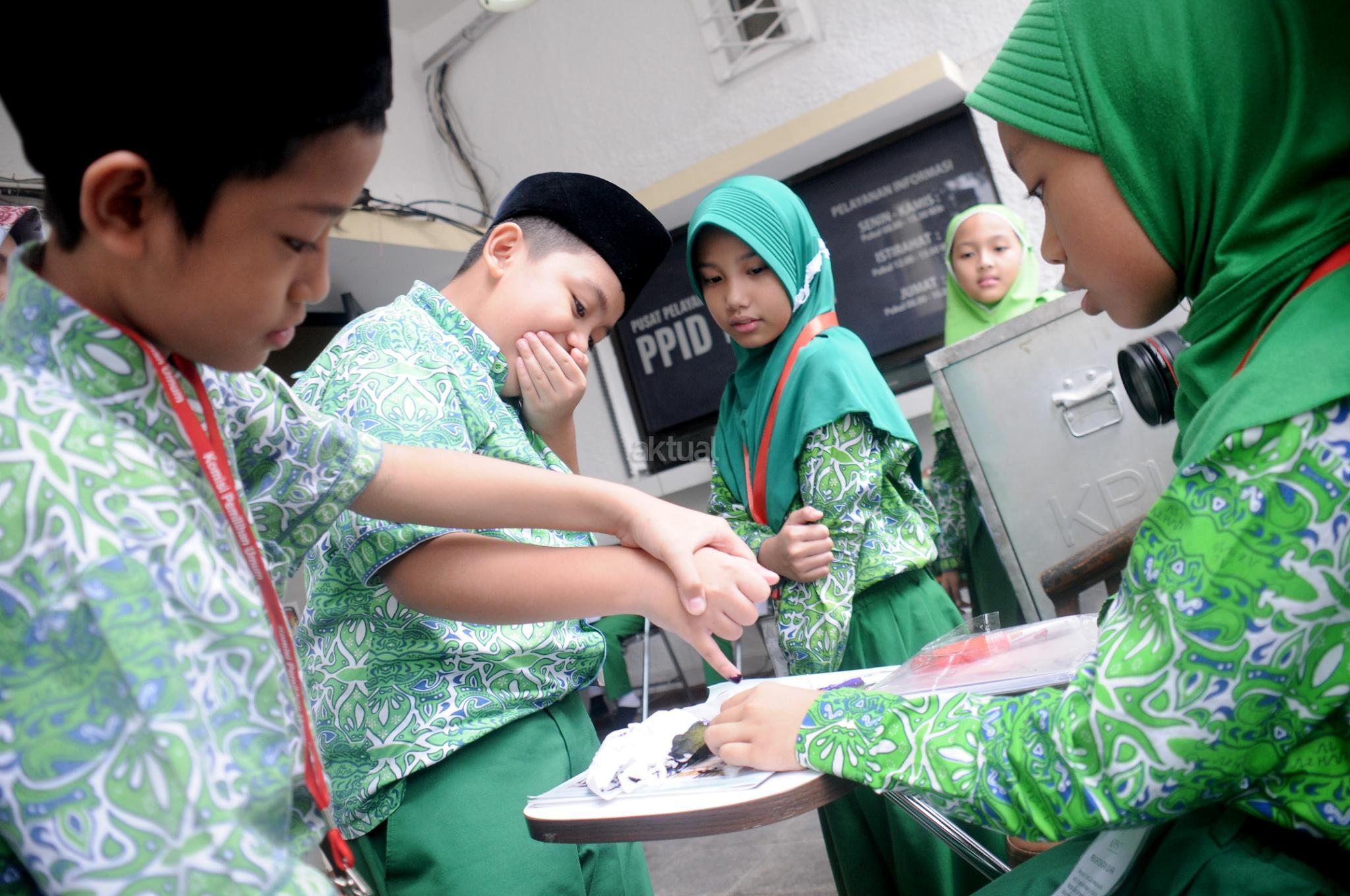 Siswa-siswi sekolah Al Azhar 2 Pasar Minggu Jakarta melakukan simulasi pemilihan umum di Kantor Komisi Pemilihan Umum (KPU), Jakarta, Kamis, (22/3/18). Kegiatan ini untuk mengenalkan sejak dini serta memberikan informasi kepada anak-anak tentang penyelenggaraan dan pentingnya pemilu. AKTUAL/Tino Oktaviano