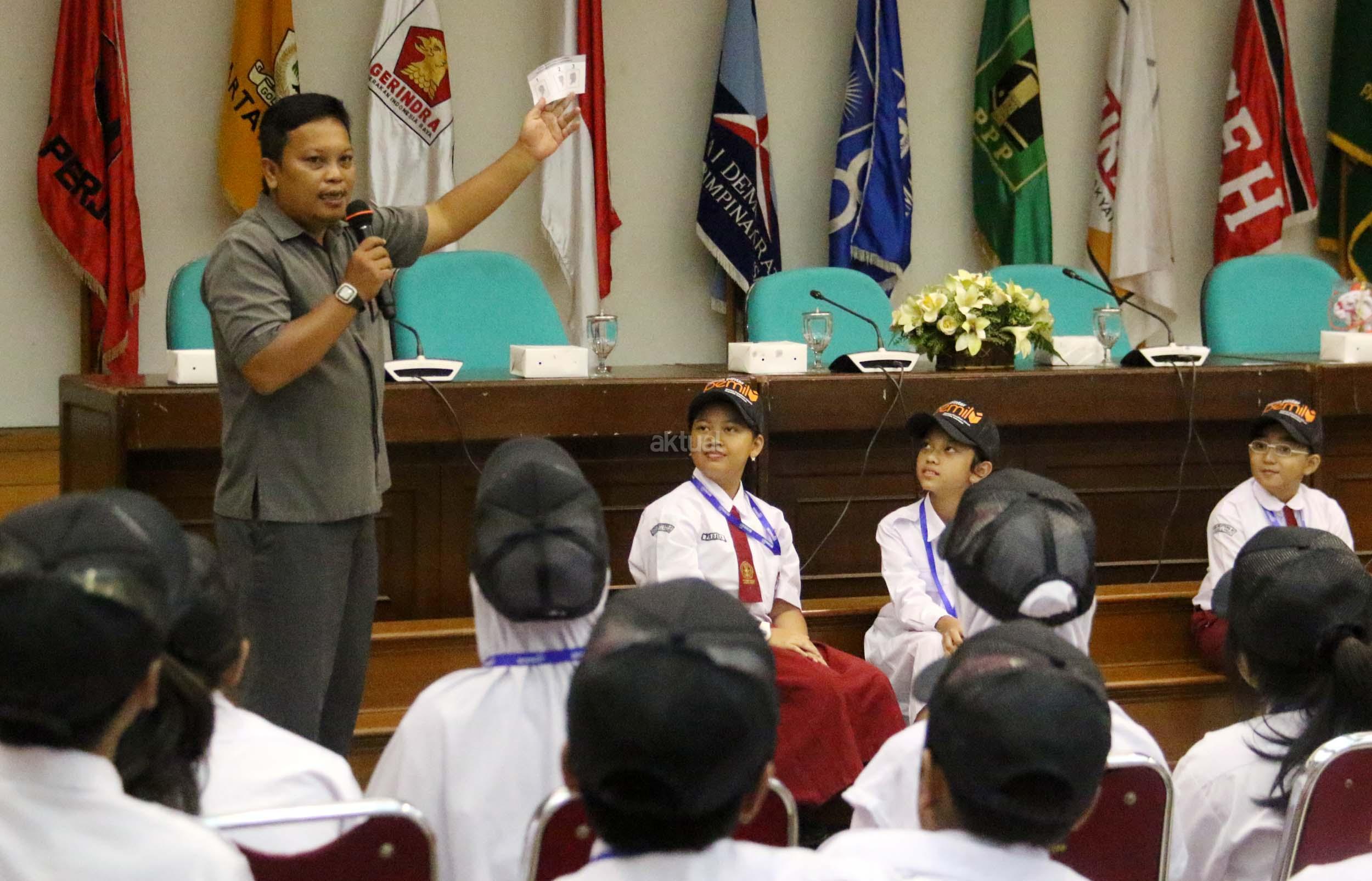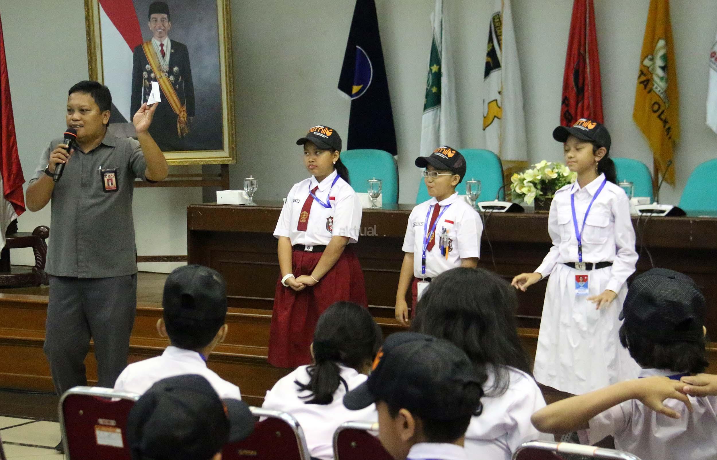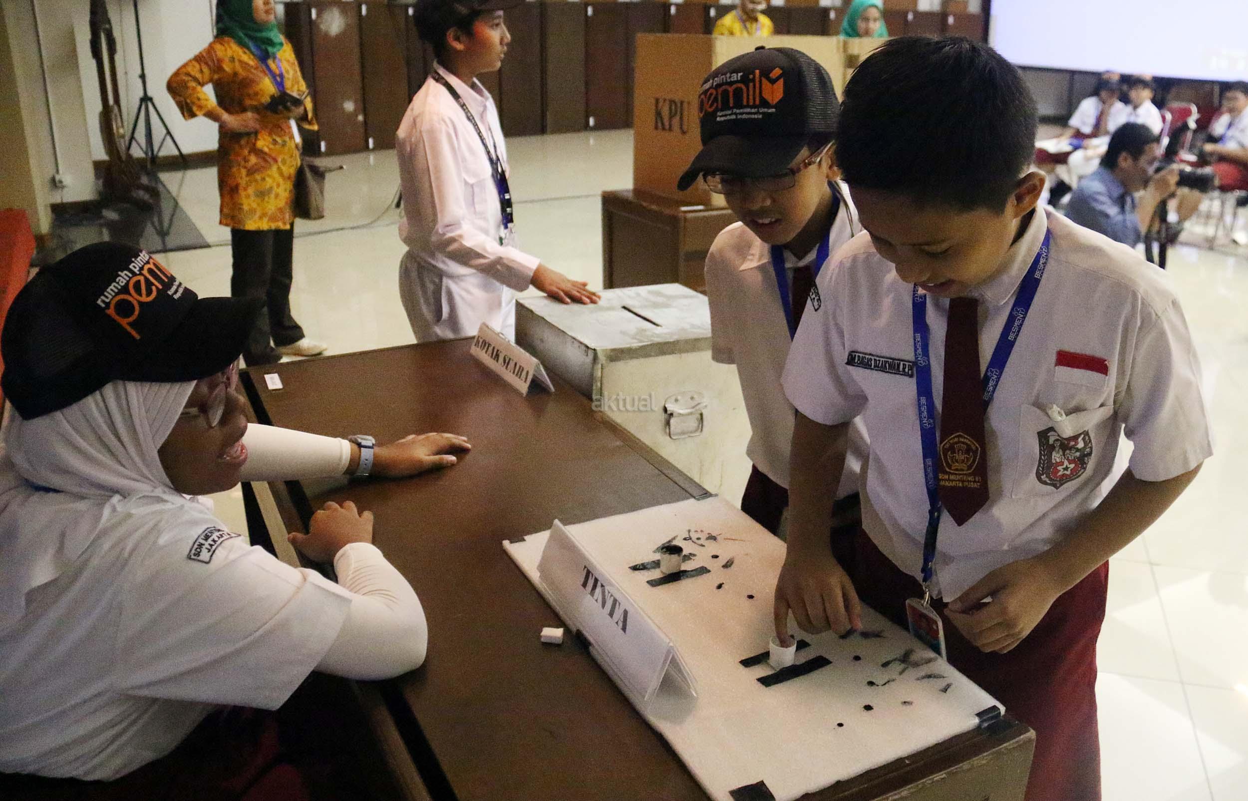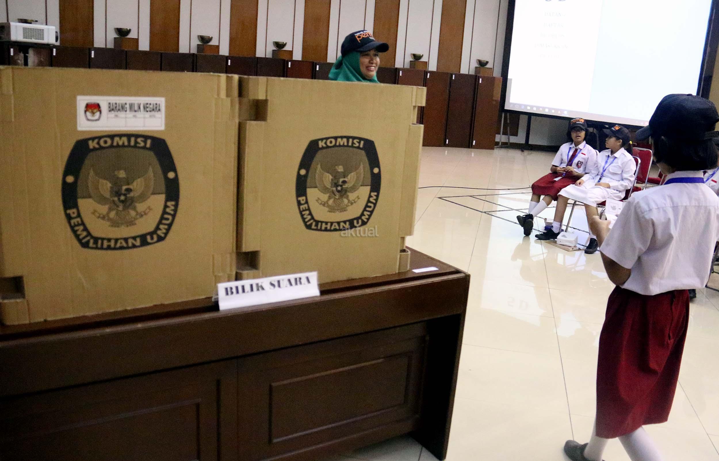 Sejumlah murid Sekolah Dasar (SD) 01 Menteng melakukan simulasi pemilihan umum di kantor Komisi Pemilihan Umum (KPU) RI di Jakarta, Senin (21/11/2016). Sebanyak 61 murid SD 01 Menteng mengunjungi kantor Komisi Pemilihan Umum (KPU) RI dalam pengenalan sistem Pemilu dini dan simulasi pemilihan Umum. AKTUAL/Munzir