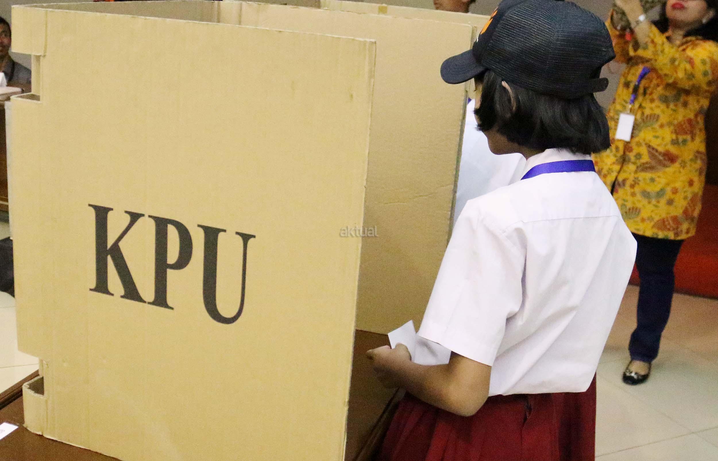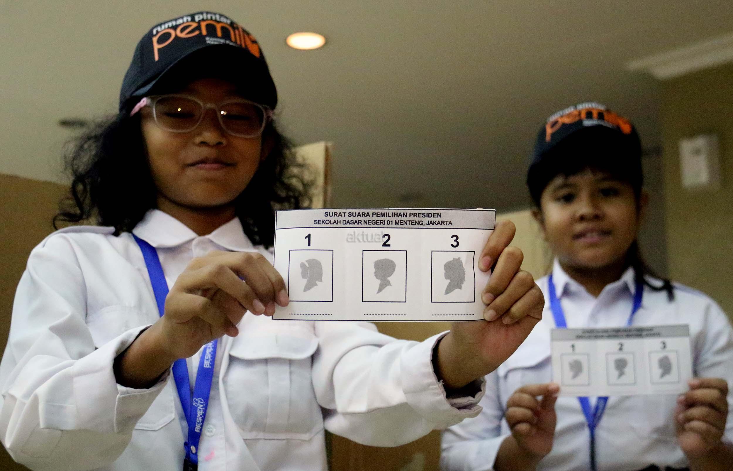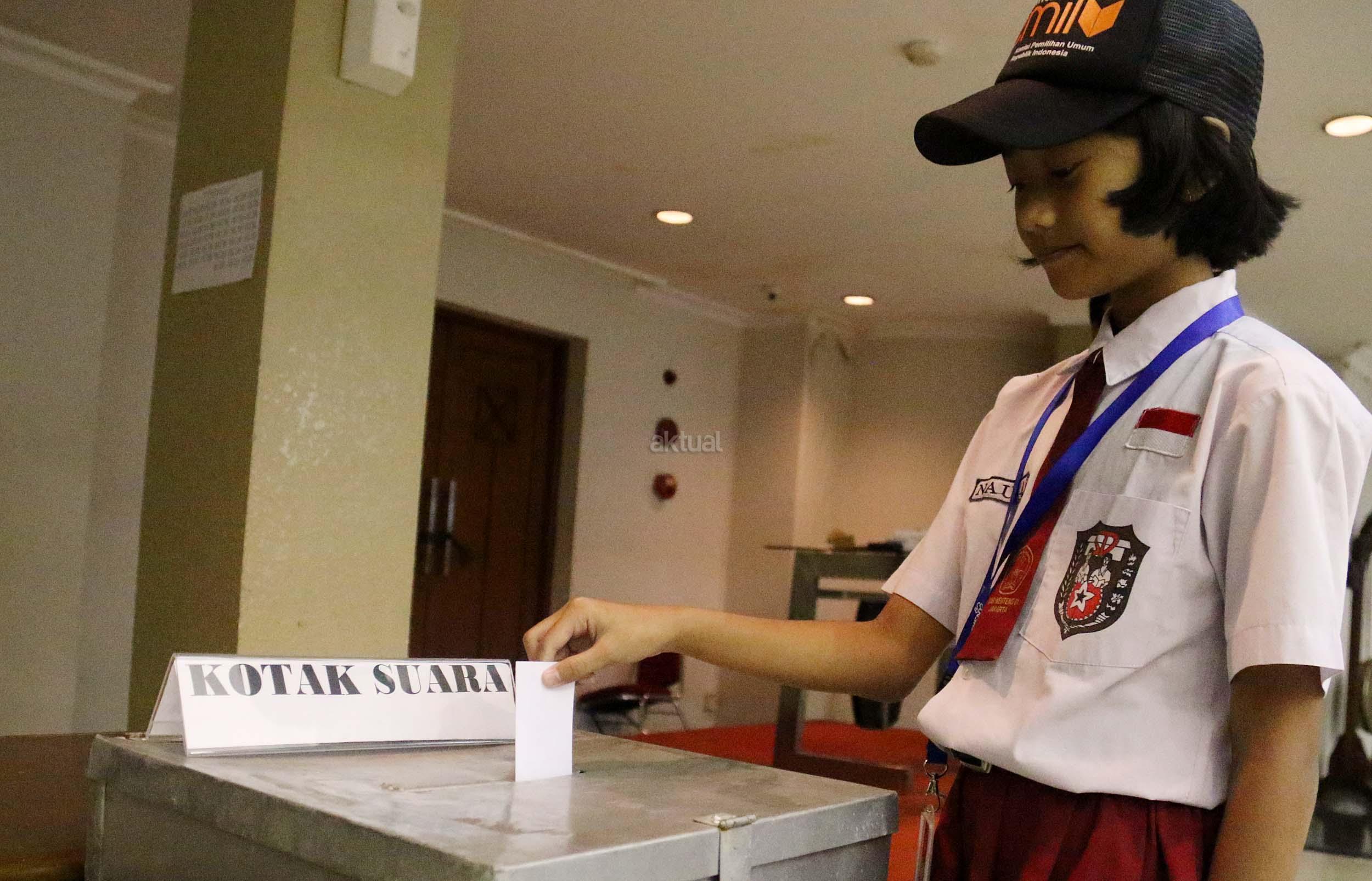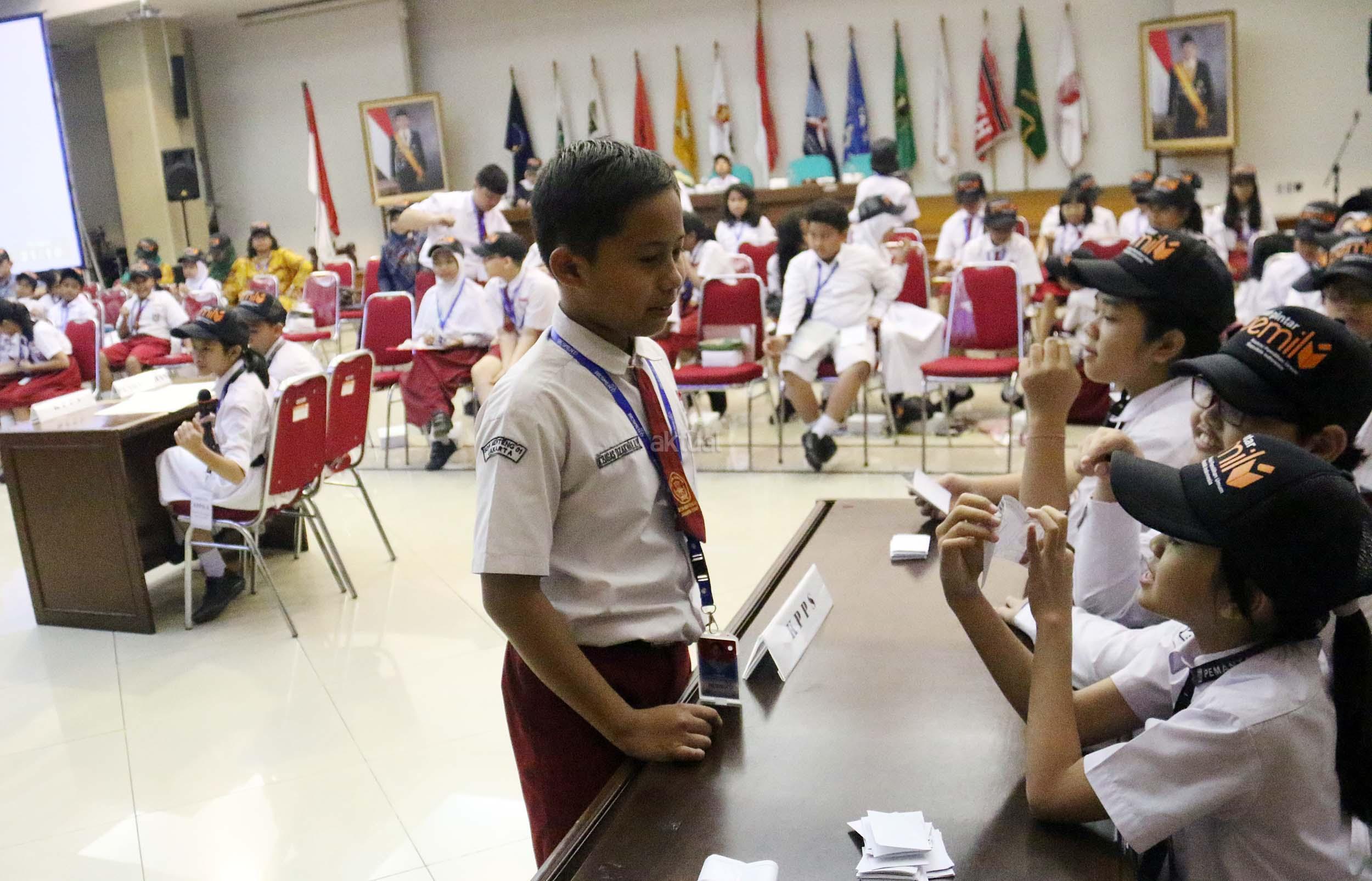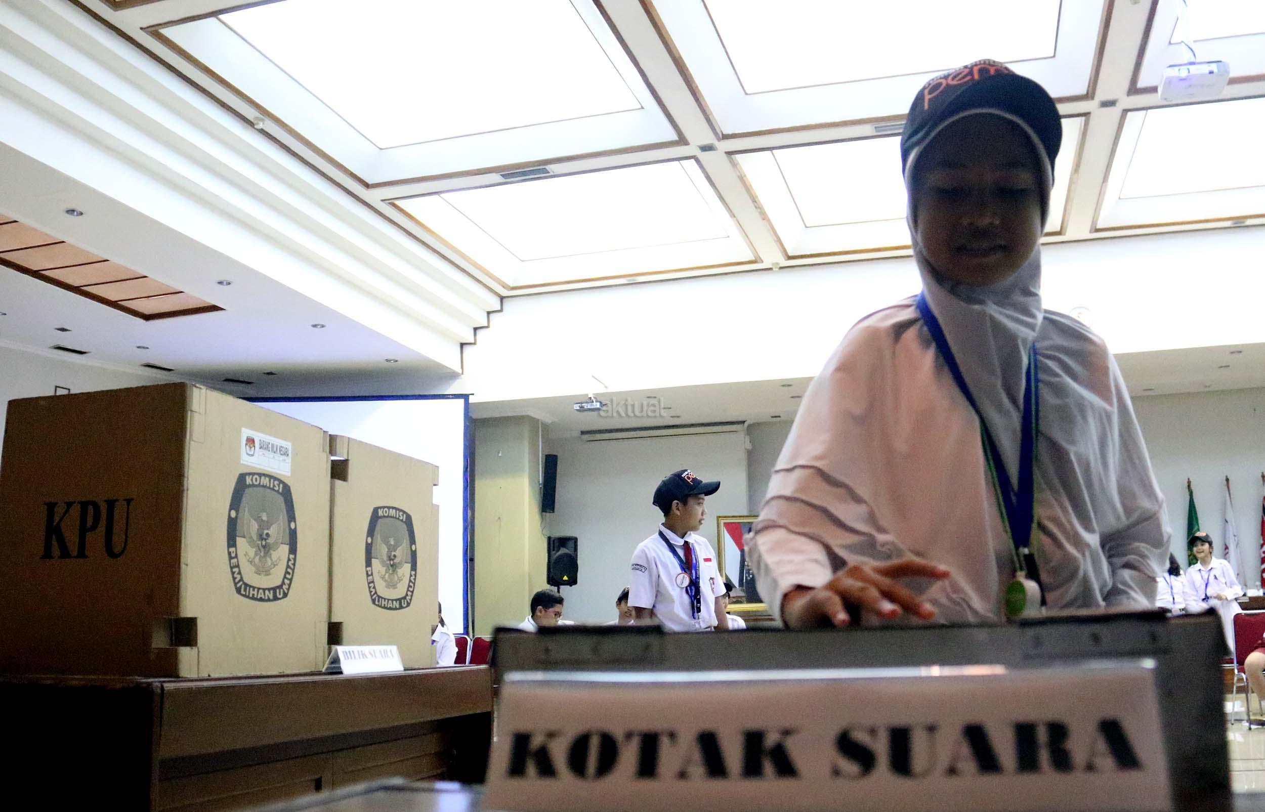 Sejumlah murid Sekolah Dasar (SD) 01 Menteng melakukan simulasi pemilihan umum di kantor Komisi Pemilihan Umum (KPU) RI di Jakarta, Senin (21/11/2016). Sebanyak 61 murid SD 01 Menteng mengunjungi kantor Komisi Pemilihan Umum (KPU) RI dalam pengenalan sistem Pemilu dini dan simulasi pemilihan Umum. AKTUAL/Munzir