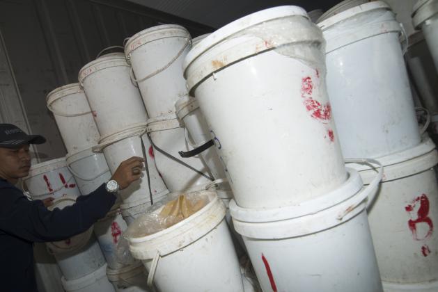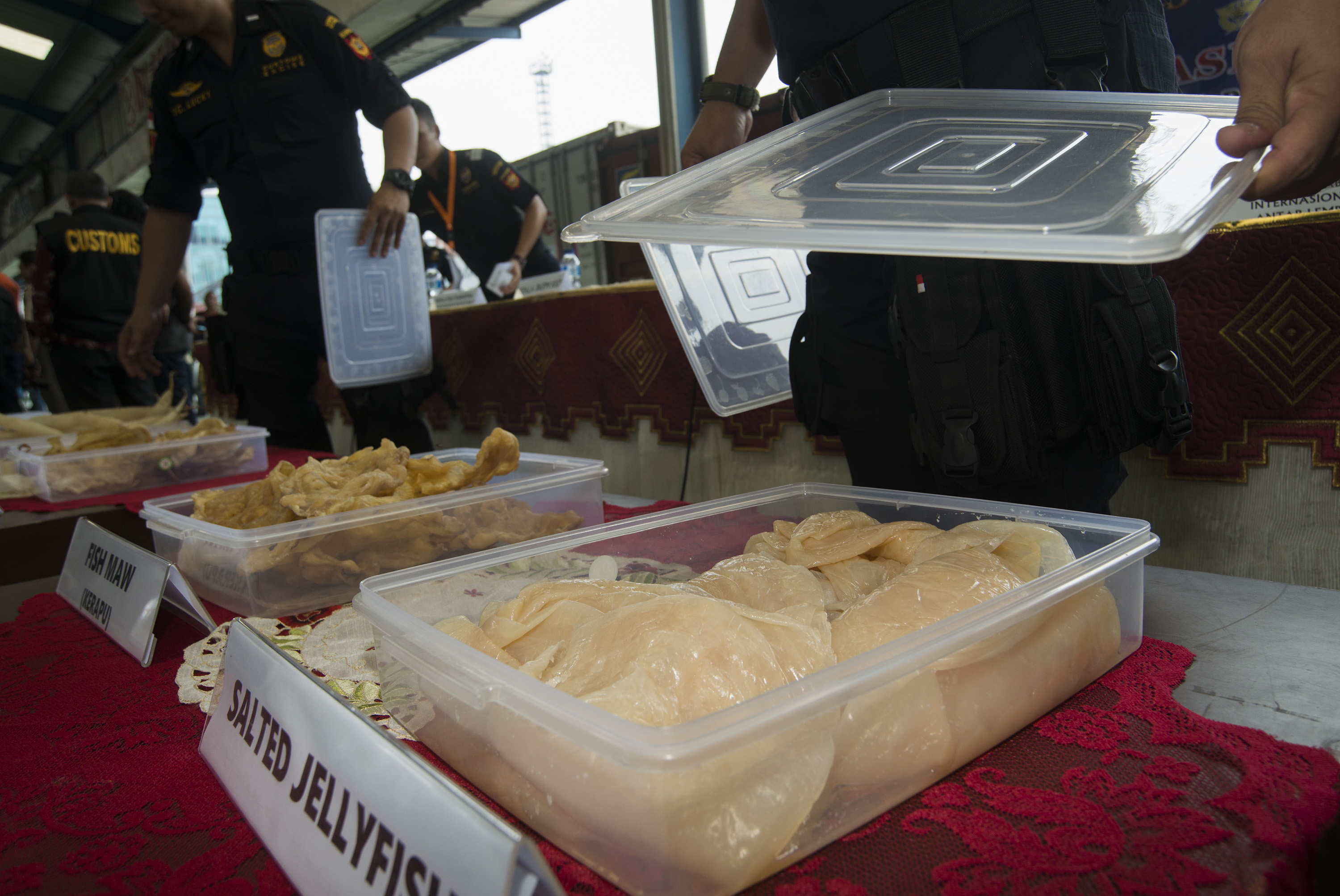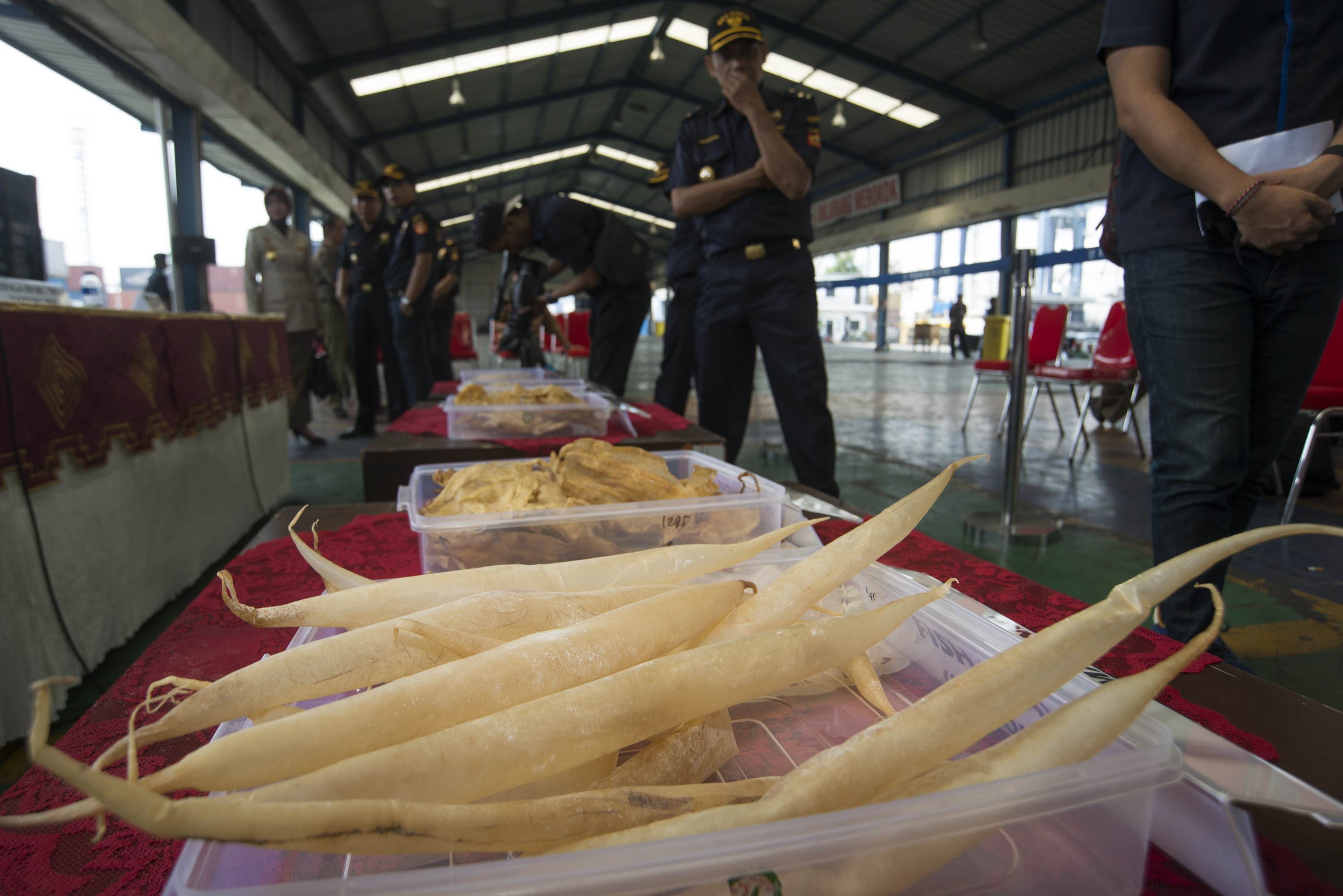 Petugas memperlihatkan komoditas laut yang gagal diekspor secara ilegal di Tempat Pemeriksaan Fisik Terpadu (TPFT) Graha Segara, Jakarta, Selasa (17/5). Bea Cukai bekerja sama dengan Badan Karantina Ikan, Pengendalian Mutu dan Kemananan Hasil Perikanan (BKIPM) melakukan penegahan terhadap 10 kontainer dalam rentang waktu Agustus 2015 hingga April 2016 senilai Rp55 milyar karena ekspor tersebut dinilai ilegal. ANTARA FOTO/Rosa Panggabean/pd/16.