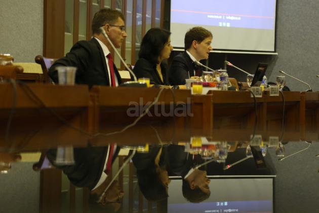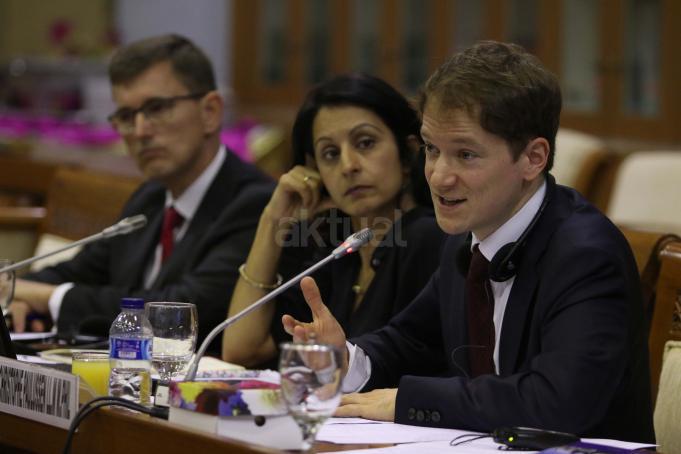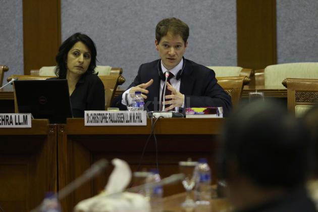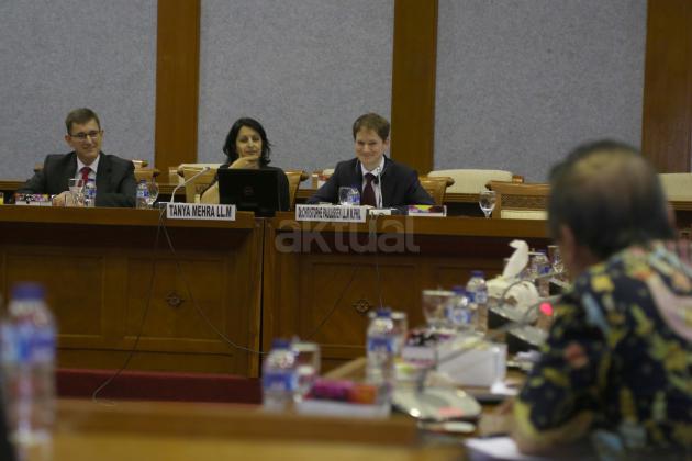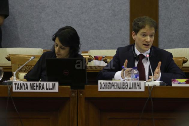 Dua peneliti Lembaga Internasional Anti Terorisme asal Belanda Christophe Paul Lulus (kanan) dan Tanya Saja Mehra menyampaikan temuan lembaganya dalam rapat konsultasi dengan Badan Legislasi DPR, Kompleks Parlemen Senayan, Jakarta, Rabu (17/2/2016). Rapat konsultasi tersebut membahas isu terorisme dan penanggulangan gerakan radikalisme yang mengacu pada hukum Belanda.