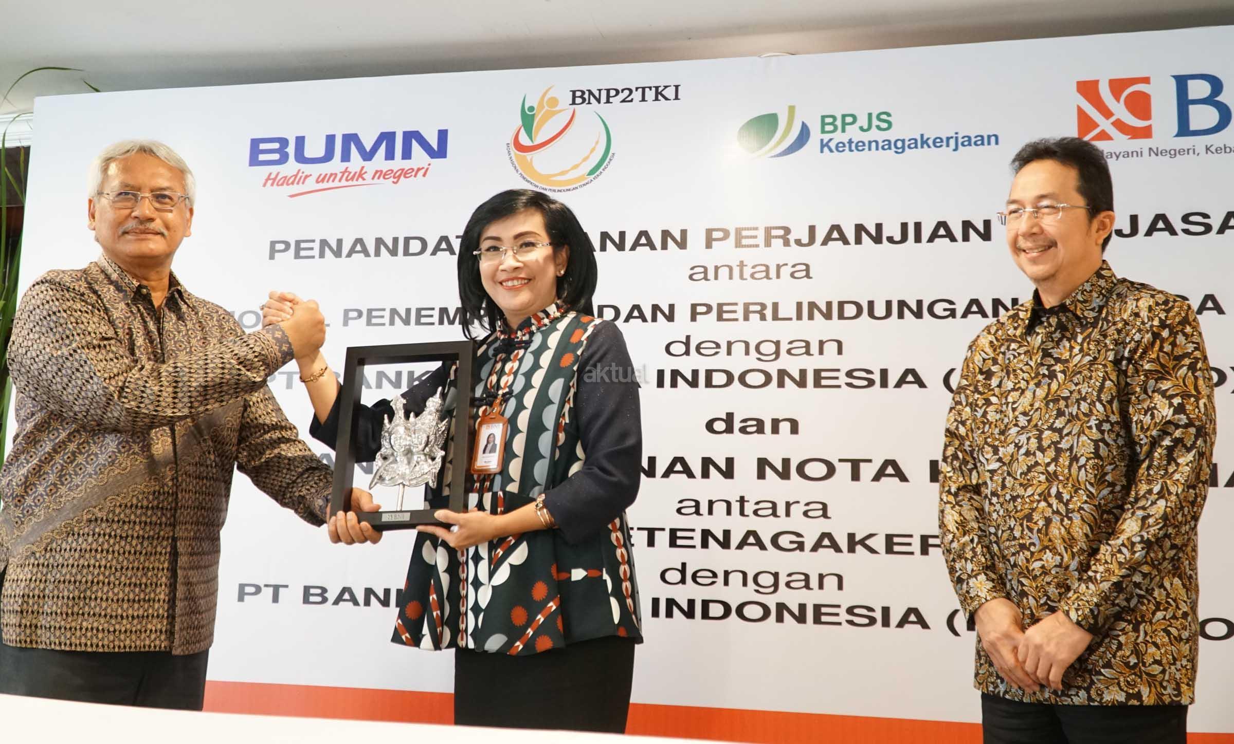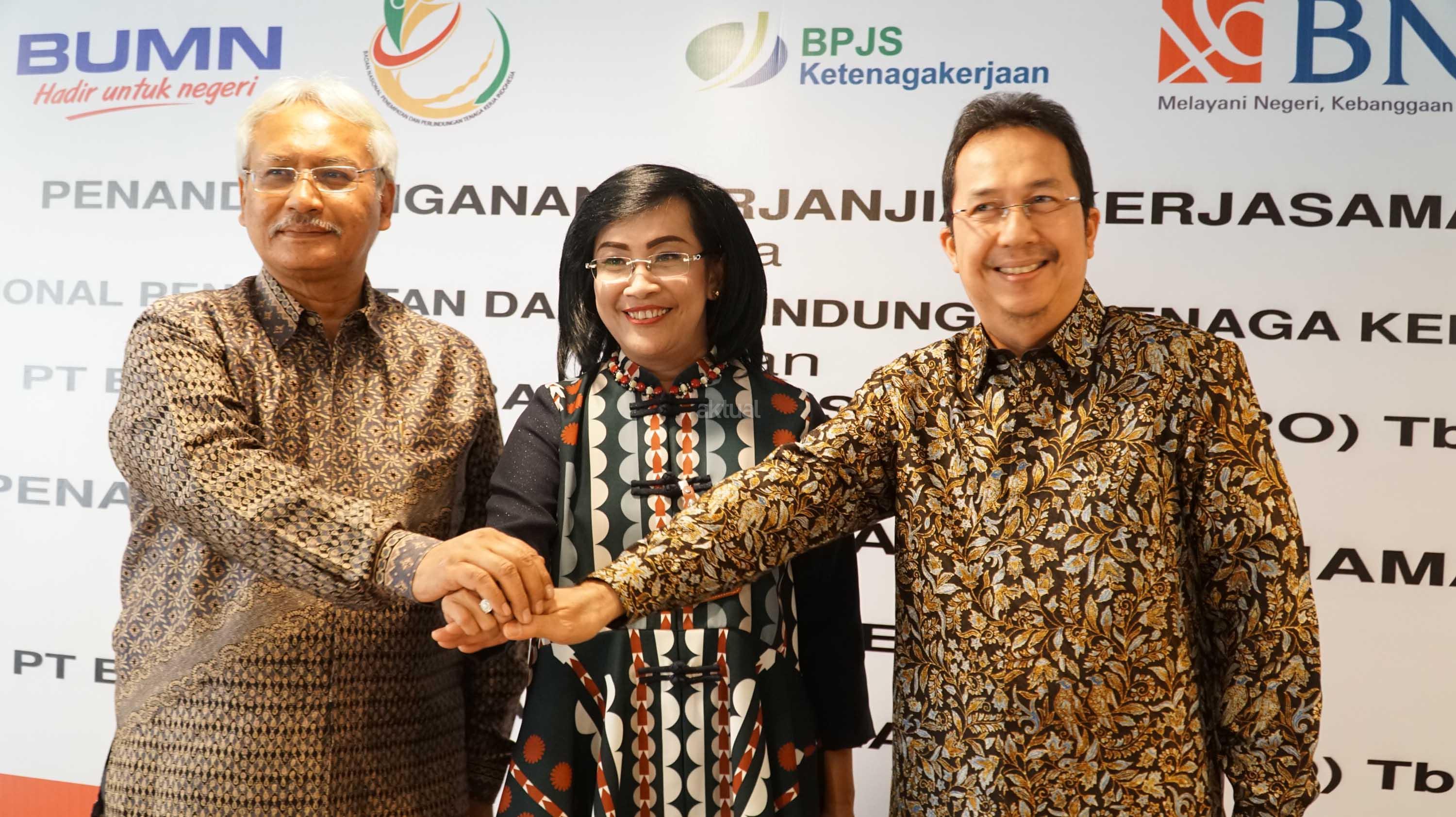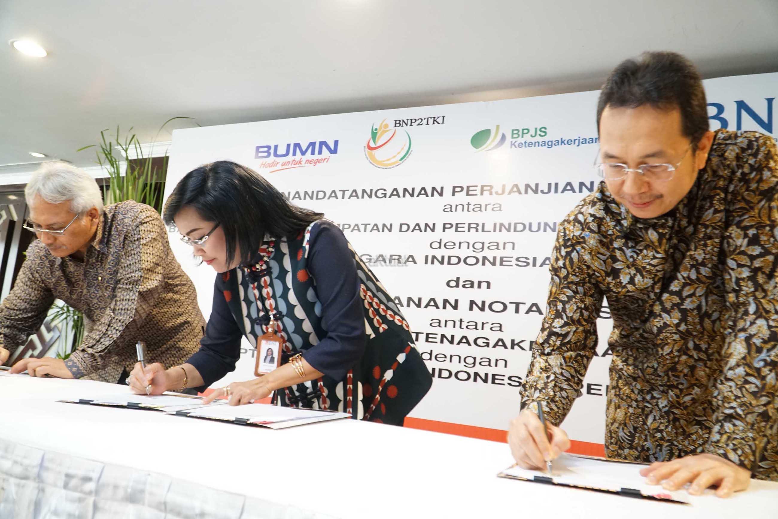 Direktur Hubungan Kelembagaan dan Transaksional Perbankan BNI Adi Sulistyowati (tengah) bersama Deputi Penempatan TKI BNP2TKI Agustin Subiantoro (kiri) dan Direktur Perluasan Kepesertaan dan Hubungan Antar Lembaga BPJS Ketenagakerjaan E Ilias Lubis (kanan) saat penandatanganan kerja sama di Jakarta, Senin (7/8). BNI bersama Badan Nasional Penempatan dan Perlindungan Tenaga Kerja Indonesia (BNP2TKI) dan BPJS Ketenagakerjaan bekerja sama untuk penerbitan Kartu Pekerja Indonesia (KPI) co-branding, Layanan Cash Management, fasilitas kredit untuk TKI dan layanan jasa perbankan guna mendukung Program Jaminan Sosial bagi TKI. AKTUAL/Eko S Hilman