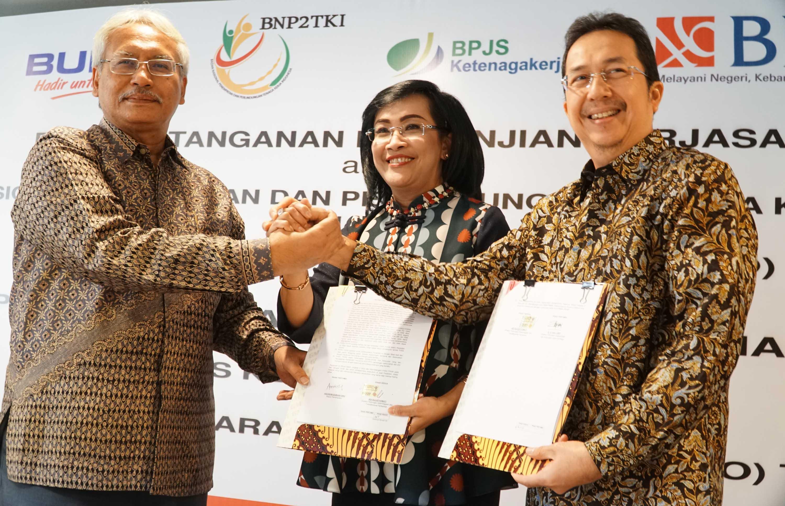 Direktur Hubungan Kelembagaan dan Transaksional Perbankan BNI Adi Sulistyowati (tengah) berjabat tangan bersama Deputi Penempatan TKI BNP2TKI Agustin Subiantoro (kiri) dan Direktur Perluasan Kepesertaan dan Hubungan Antar Lembaga BPJS Ketenagakerjaan E Ilias Lubis (kanan) saat penandatanganan kerja sama di Jakarta, Senin (7/8). BNI bersama Badan Nasional Penempatan dan Perlindungan Tenaga Kerja Indonesia (BNP2TKI) dan BPJS Ketenagakerjaan bekerja sama untuk penerbitan Kartu Pekerja Indonesia (KPI) co-branding, Layanan Cash Management, fasilitas kredit untuk TKI dan layanan jasa perbankan guna mendukung Program Jaminan Sosial bagi TKI. AKTUAL/Eko S Hilman