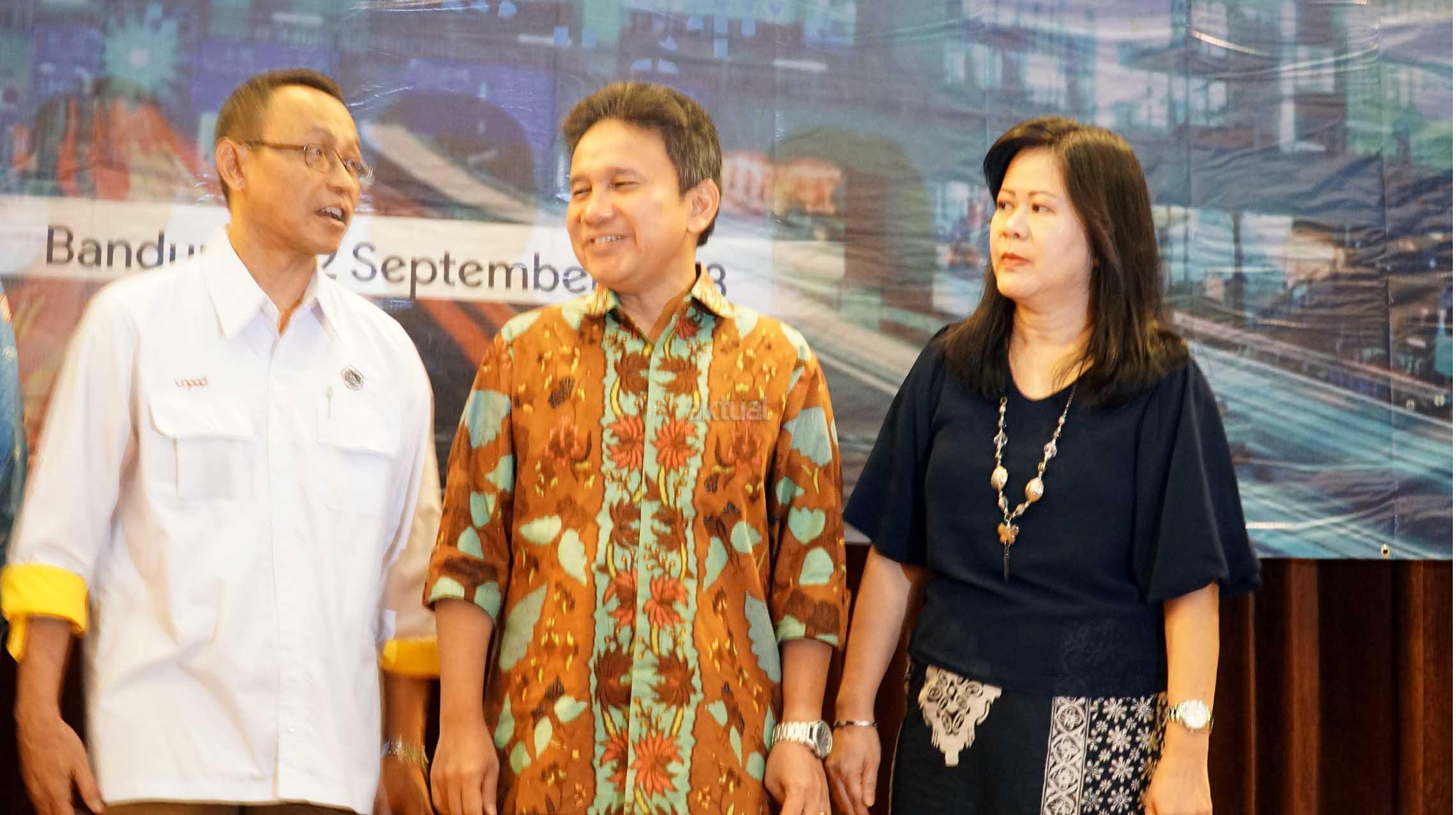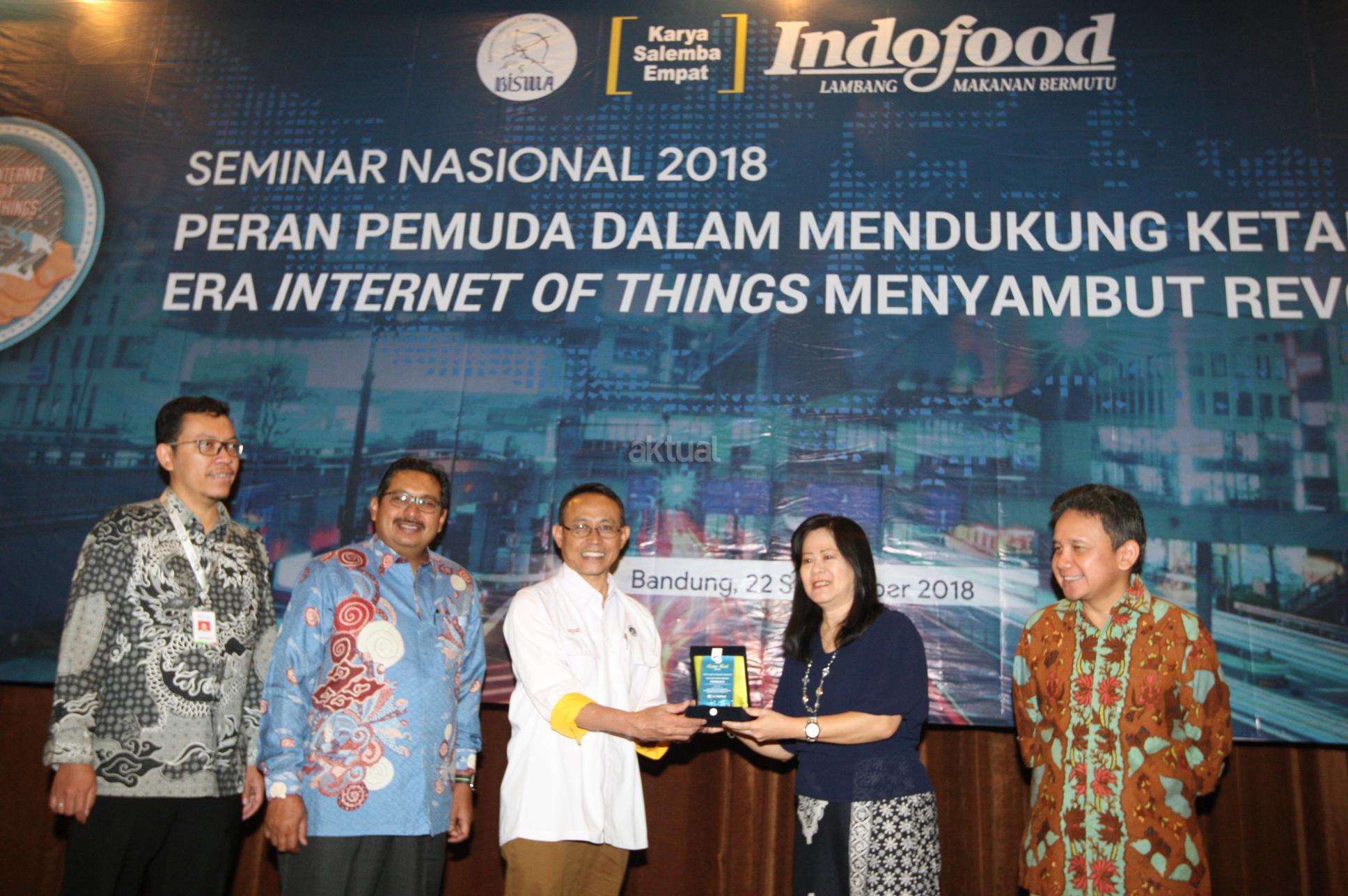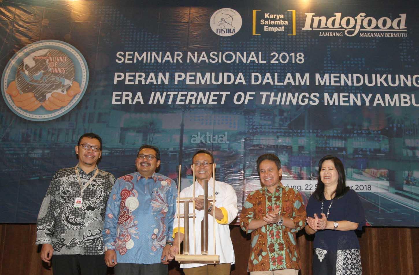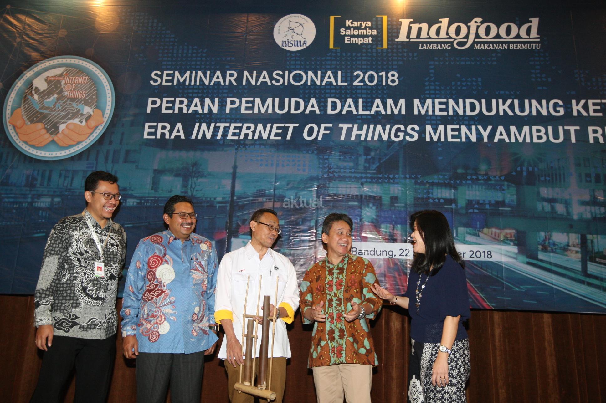 (dari kiri ke kanan) Kepala Bidang Perindustrian Teknologi Industri,Kementrian Perindustrian Republik Indonesia, Bambang Riznanto S.T, M.T . Direktur Jenderal Sumber Daya Dan Perangkat Pos dan Informatika Kementrian Komunikasi dan Informasi Republik Indonesia Dr.Ir. Ismail, M.T, Direktur Pendidikan dan Kemahasiswaan Universitas Padjadjaran, Prof.Dr.Wawan Hermawan,MS, Deputi Gubernur Senior Bank Indonesia dan sekaligus Ketua Dewan Pembina Yayasan Karya Salemba Empat, Mirza Adityaswara, CSR Manager PT Indofood Sukses Makmur Tbk, Patricia Lamidin saat hadir pada Seminar Nasional dengan judul “Peran Pemuda dalam Mendukung Ketahanan Nasional Era Internet of Things (IoT) menyambut Revolusi Industri 4.0 di Universitas Padjajaran, Bandung, Sabtu (22/9). Kegiatan seminar yang digelar Mahasiswa penerima beasiswa Indofood Sukses Makmur (BISMA) dari 31 perguruan tinggi negeri di Indonesia dan tergabung dalam paguyuban BISMA Nusantara. AKTUAL/Eko S Hilman