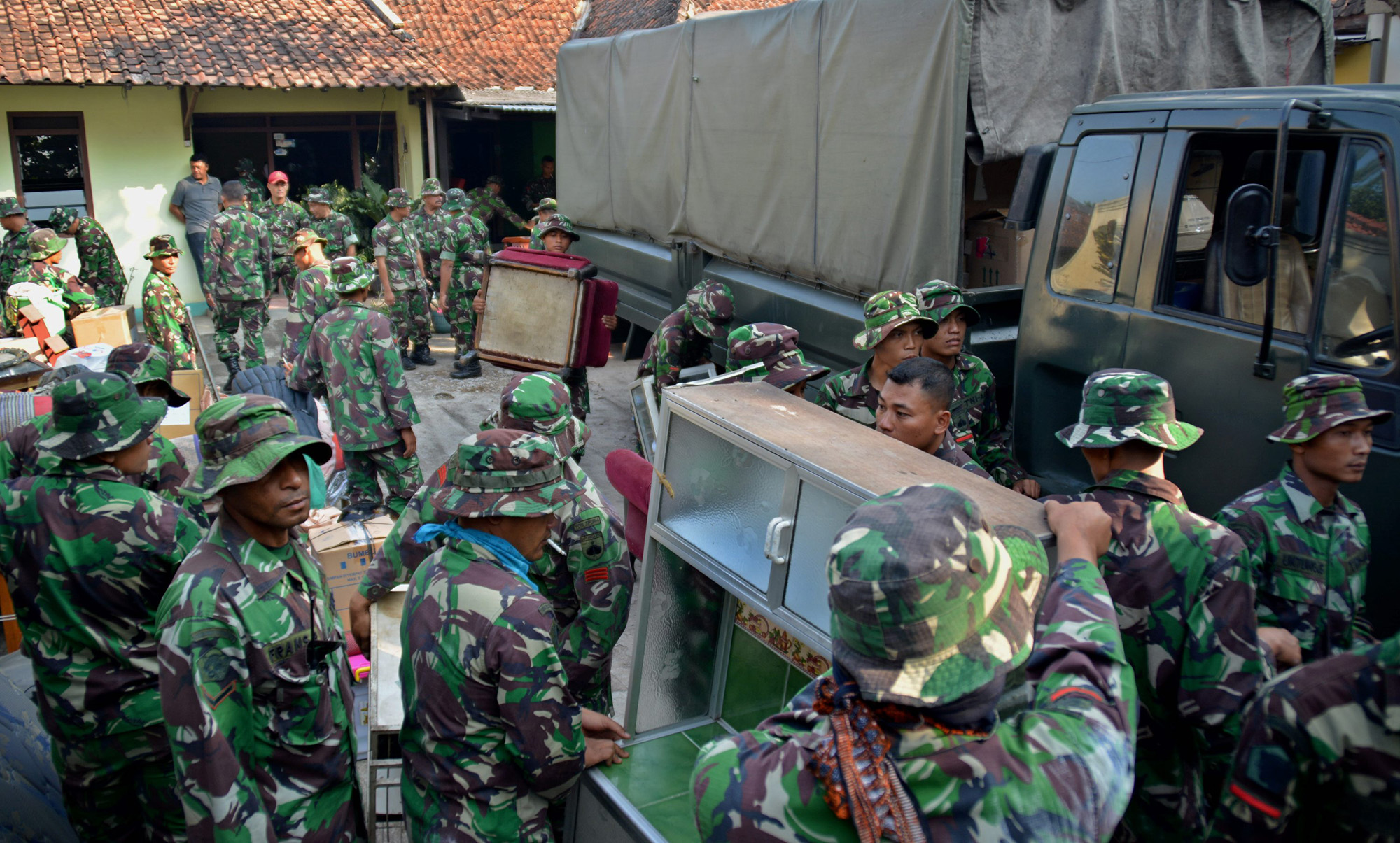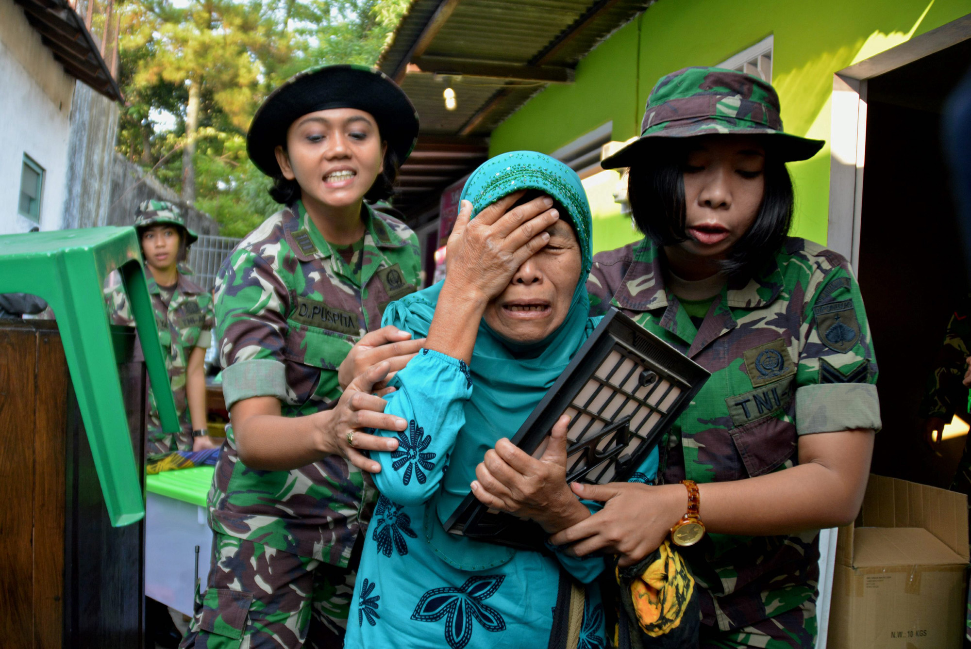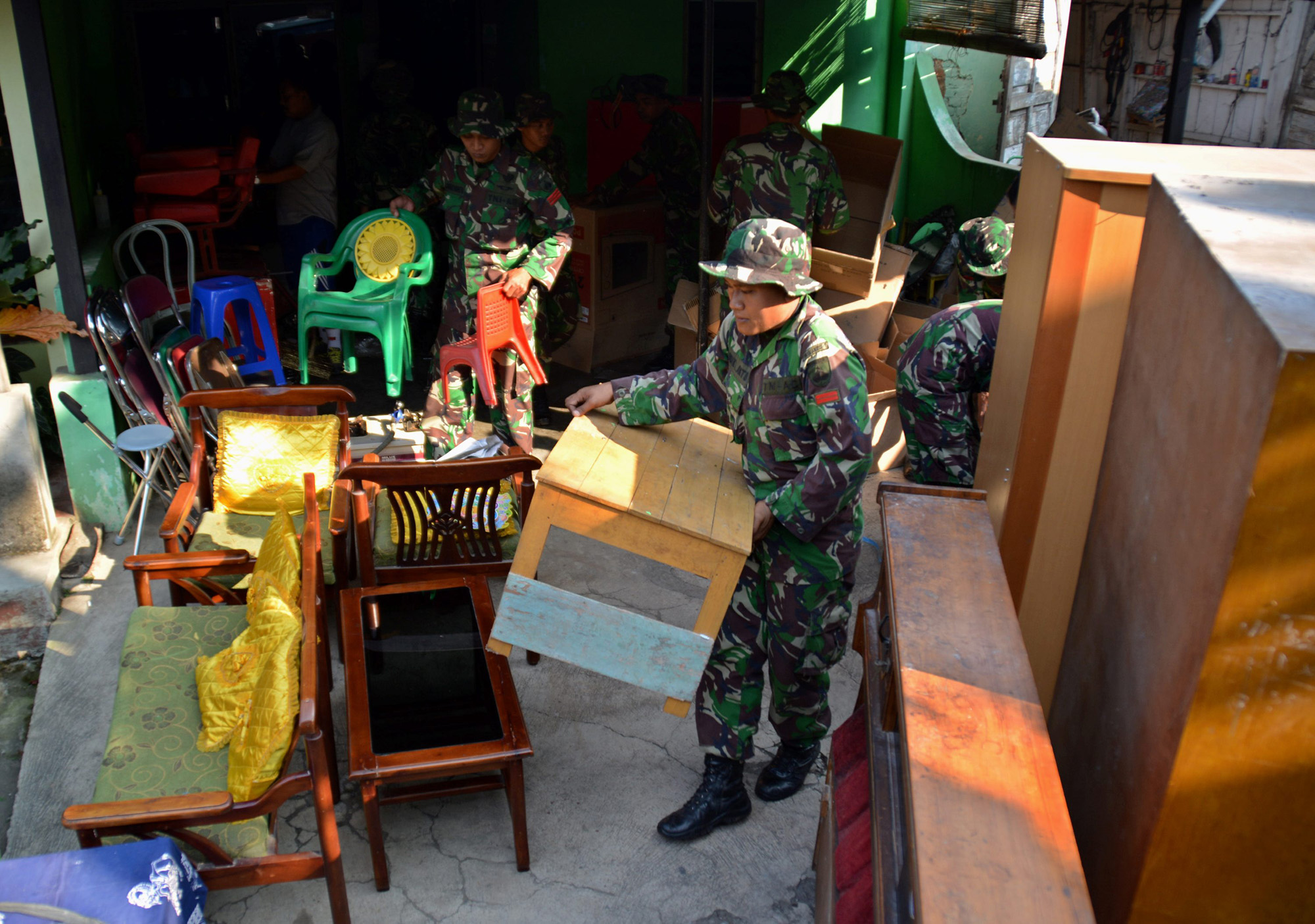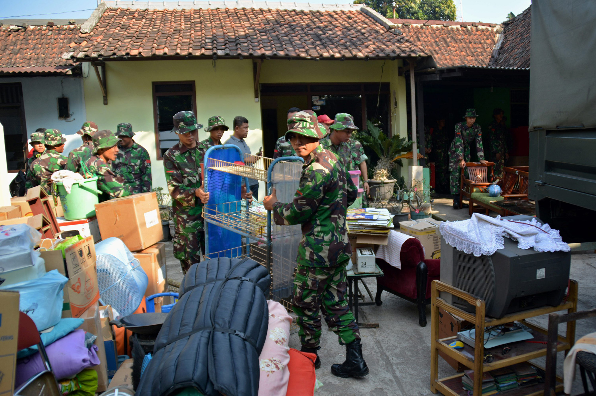 Dua anggota Kowad mendampingi seorang ibu keluar dari rumahnya saat berlangsung penertiban dan pengosongan tanah serta bangunan milik TNI AD di Jalan Setiabudi Semarang, Jateng, Sabtu (25/7). Penertiban dan pengosongan sebanyak 33 rumah di lahan seluas 6.400 m2 milik Kodam IV/Diponegoro sesuai perintah KSAD untuk menertibkan aset milik TNI AD. ANTARA FOTO/R. Rekotomo/Rei/foc/15.