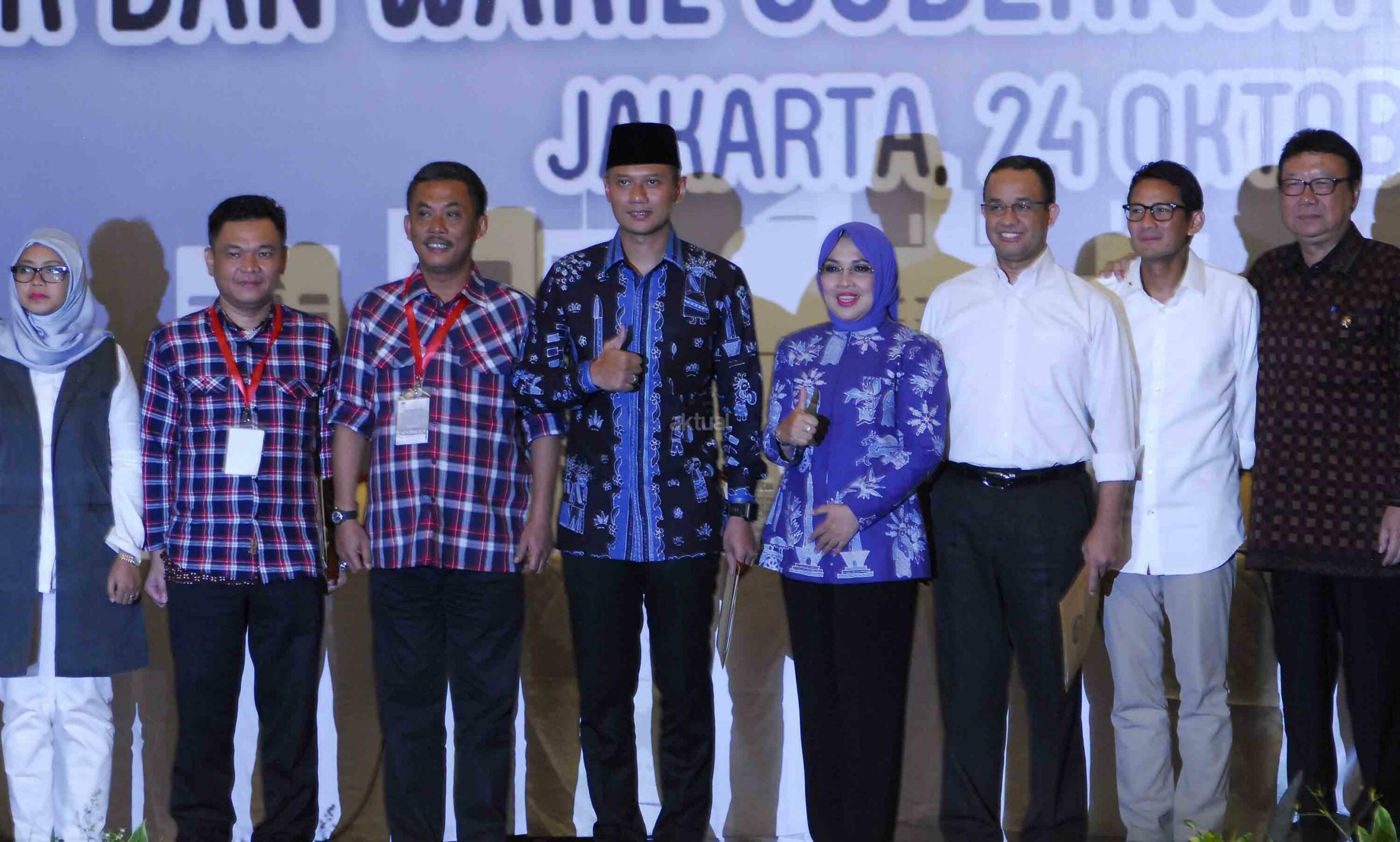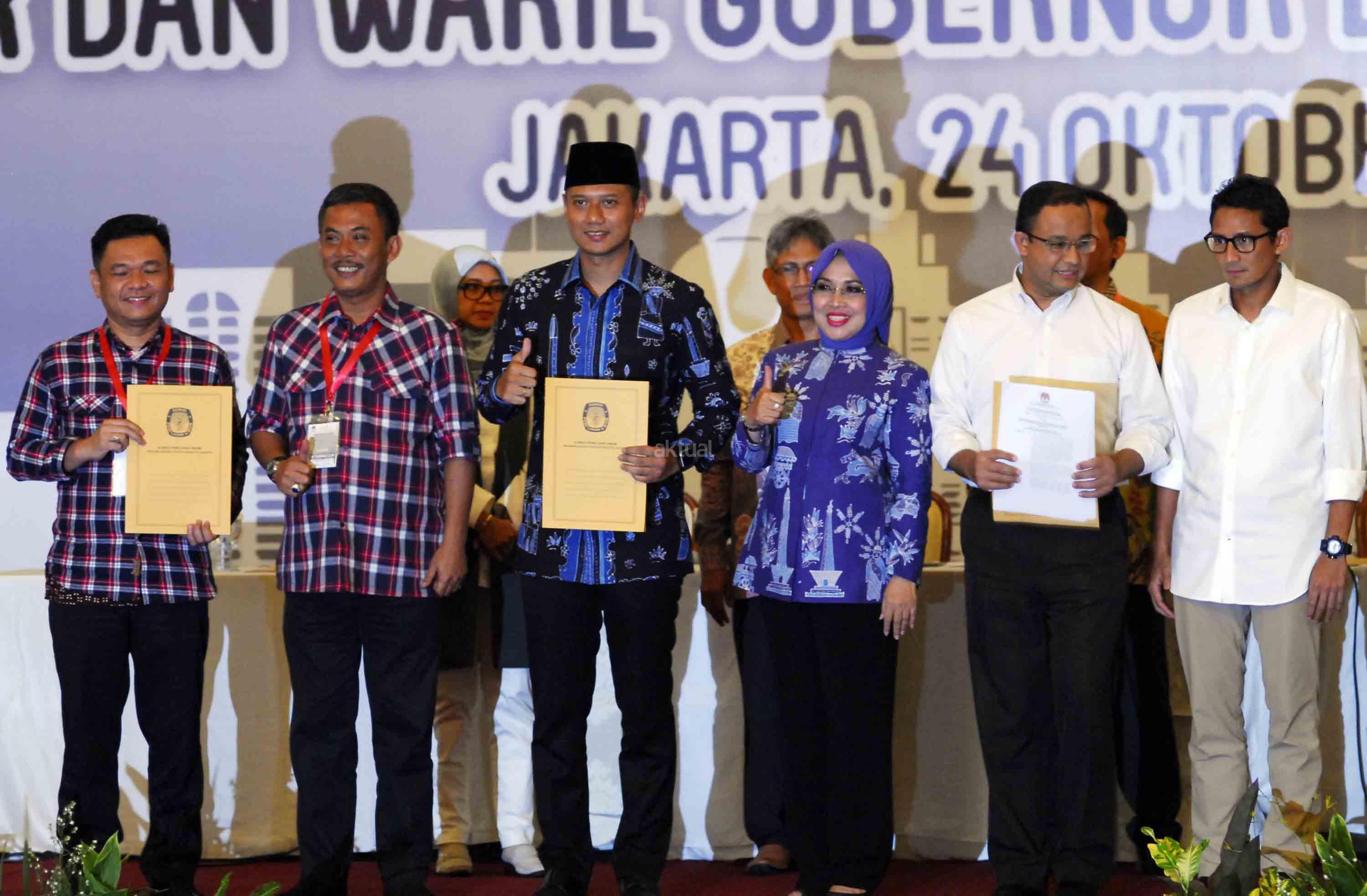 Foto bersama pasangan cagub-cawagub DKI Jakarta Agus Harimurti Yudhoyono (ketiga kiri) dan Sylviana Murni (tengah), Anies Baswedan (ketiga kanan) dan Sandiaga Uno (kedua kanan), tim sukses Basuki Tjahaja Purnama-Djarot Saiful Hidayat yakni TB Ace Hasan Syadzzily (kiri) dan Prasetyo Edi (kedua kiri) usai rapat pleno KPUD DKI Jakarta di Balai Sudirman, Jakarta, Senin (24/10). KPUD DKI Jakarta menetapkan tiga pasangan cagub-cawagub untuk mengikuti pilkada DKI Jakarta 2017. AKTUAL/Tino Oktaviano