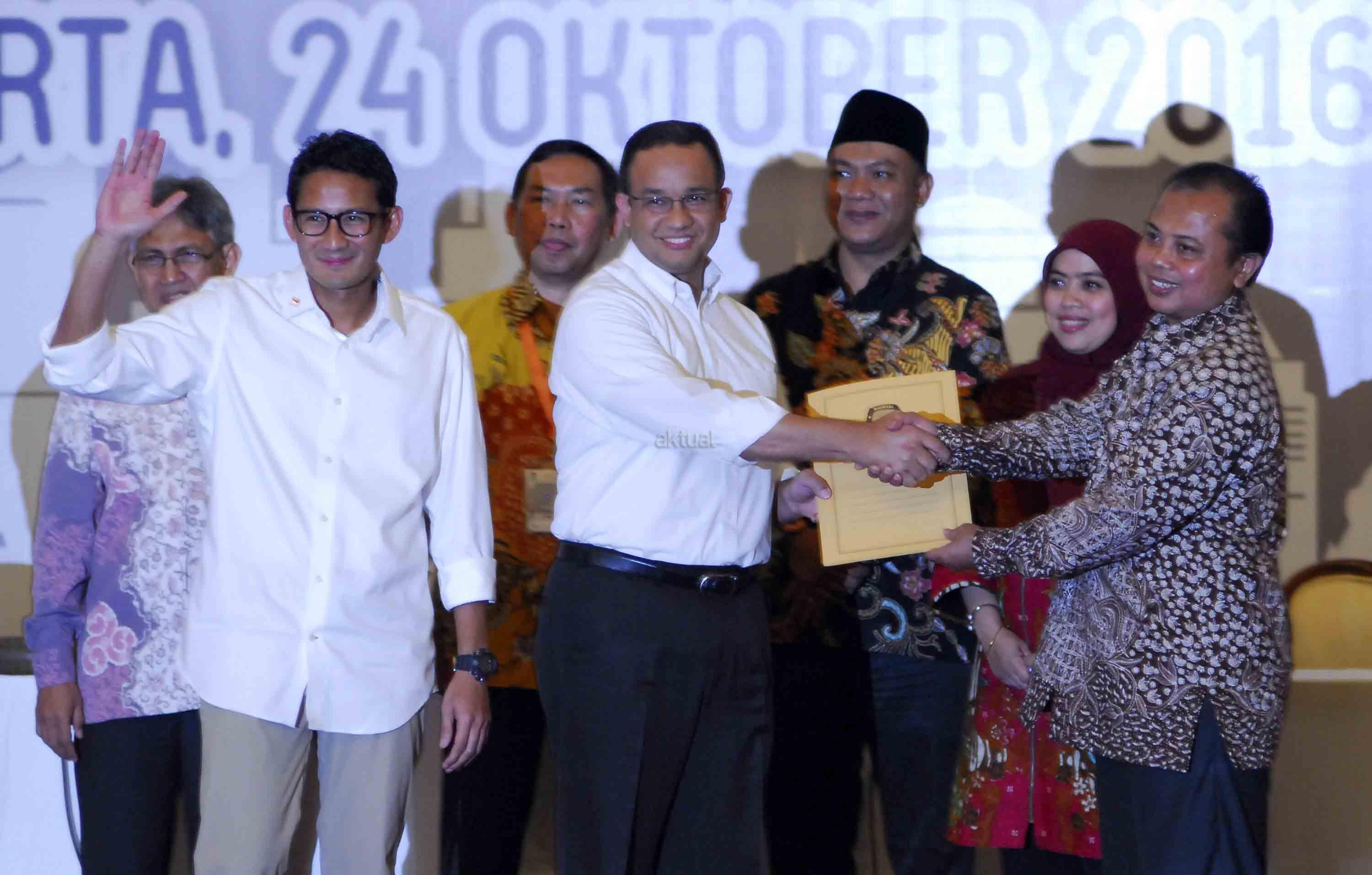 Pasangan cagub-cawagub DKI Jakarta Anies Baswedan dan Sandiaga Uno menunjukkan berkas penetapan mereka usai rapat pleno KPUD DKI Jakarta di Balai Sudirman, Jakarta, Senin (24/10). KPUD DKI Jakarta menetapkan tiga pasangan cagub-cawagub untuk mengikuti Pilkada DKI Jakarta pada 2017. AKTUAL/Tino Oktaviano