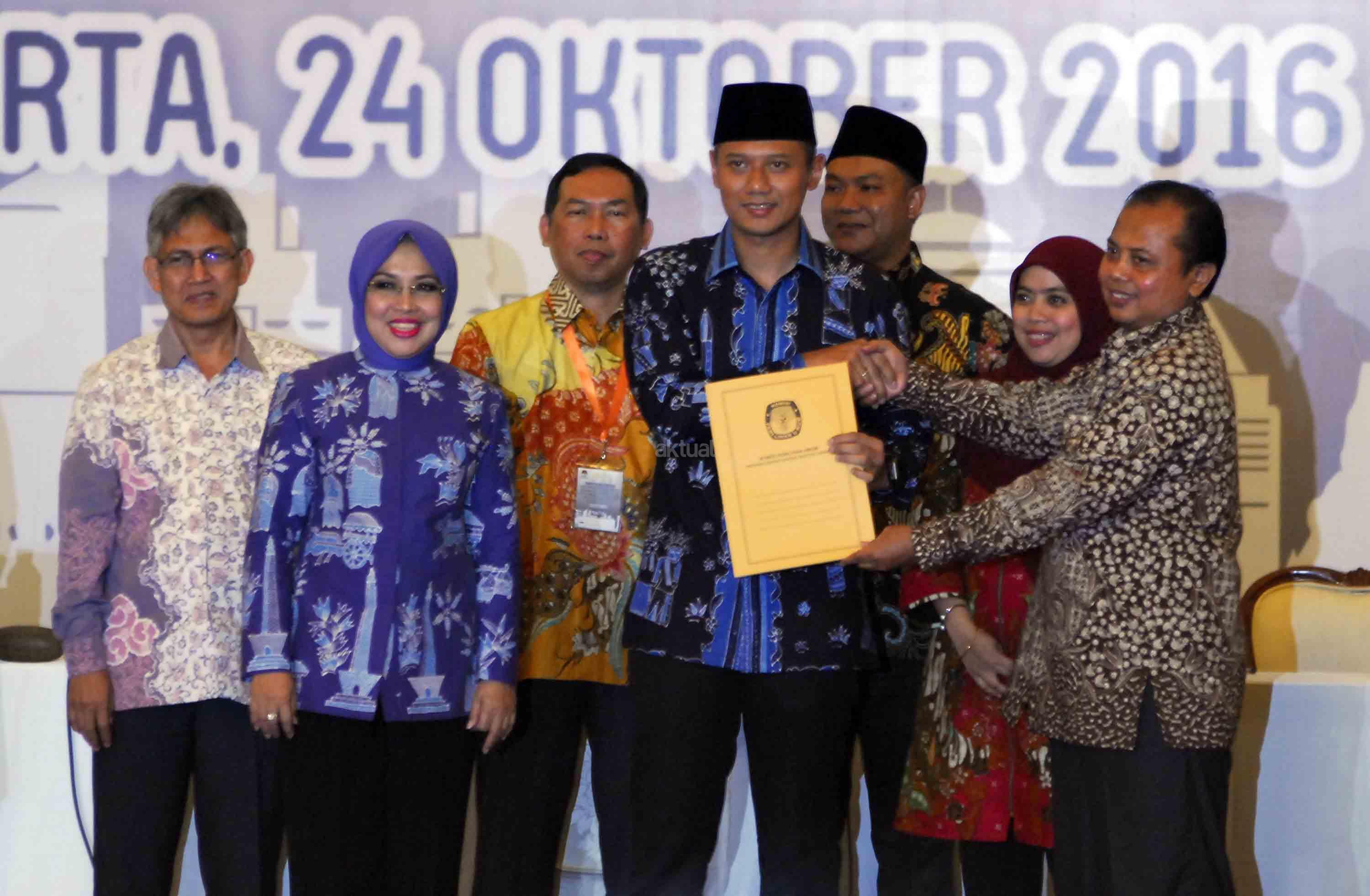 Pasangan cagub-cawagub DKI Jakarta Agus Harimurti Yudhoyono dan Sylviana Murni menunjukkan berkas penetapan mereka usai rapat pleno KPUD DKI Jakarta di Balai Sudirman, Jakarta, Senin (24/10). KPUD DKI Jakarta menetapkan tiga pasangan cagub-cawagub untuk mengikuti Pilkada DKI Jakarta pada 2017. AKTUAL/Tino Oktaviano
