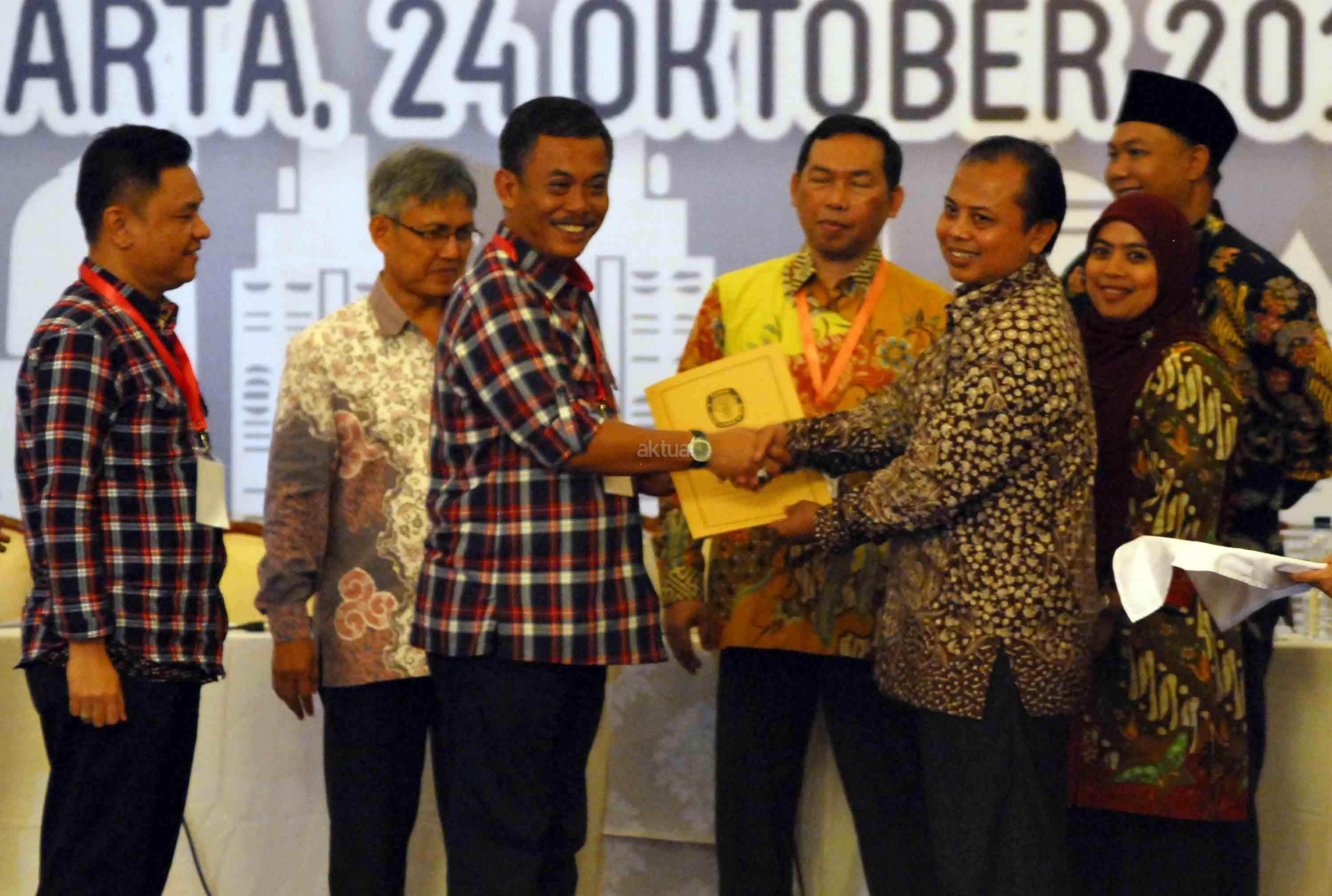 Tim sukses Cagub Cawagub DKI Jakarta Basuki Tjahaja Purnama-Djarot Saiful Hidayat yakni TB Ace Hasan Syadzzily (kiri) dan Prasetyo Edi menunjukkan berkas penetapan mereka usai rapat pleno KPUD DKI Jakarta di Balai Sudirman, Jakarta, Senin (24/10). KPUD DKI Jakarta menetapkan tiga pasangan cagub-cawagub untuk mengikuti Pilkada DKI Jakarta pada 2017. AKTUAL/Tino Oktaviano