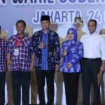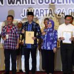 Mendagri Tjahjo Kumolo (kanan) berfoto bersama dengan pasangan cagub-cawagub DKI Jakarta Agus Harimurti Yudhoyono (ketiga kiri) dan Sylviana Murni (tengah), Anies Baswedan (ketiga kanan) dan Sandiaga Uno (kedua kanan), tim sukses Basuki Tjahaja Purnama-Djarot Saiful Hidayat yakni TB Ace Hasan Syadzzily (kiri) dan Prasetyo Edi (kedua kiri) usai rapat pleno KPUD DKI Jakarta di Balai Sudirman, Jakarta, Senin (24/10). KPUD DKI Jakarta menetapkan tiga pasangan cagub-cawagub untuk mengikuti pilkada DKI Jakarta 2017. AKTUAL/Tino Oktaviano