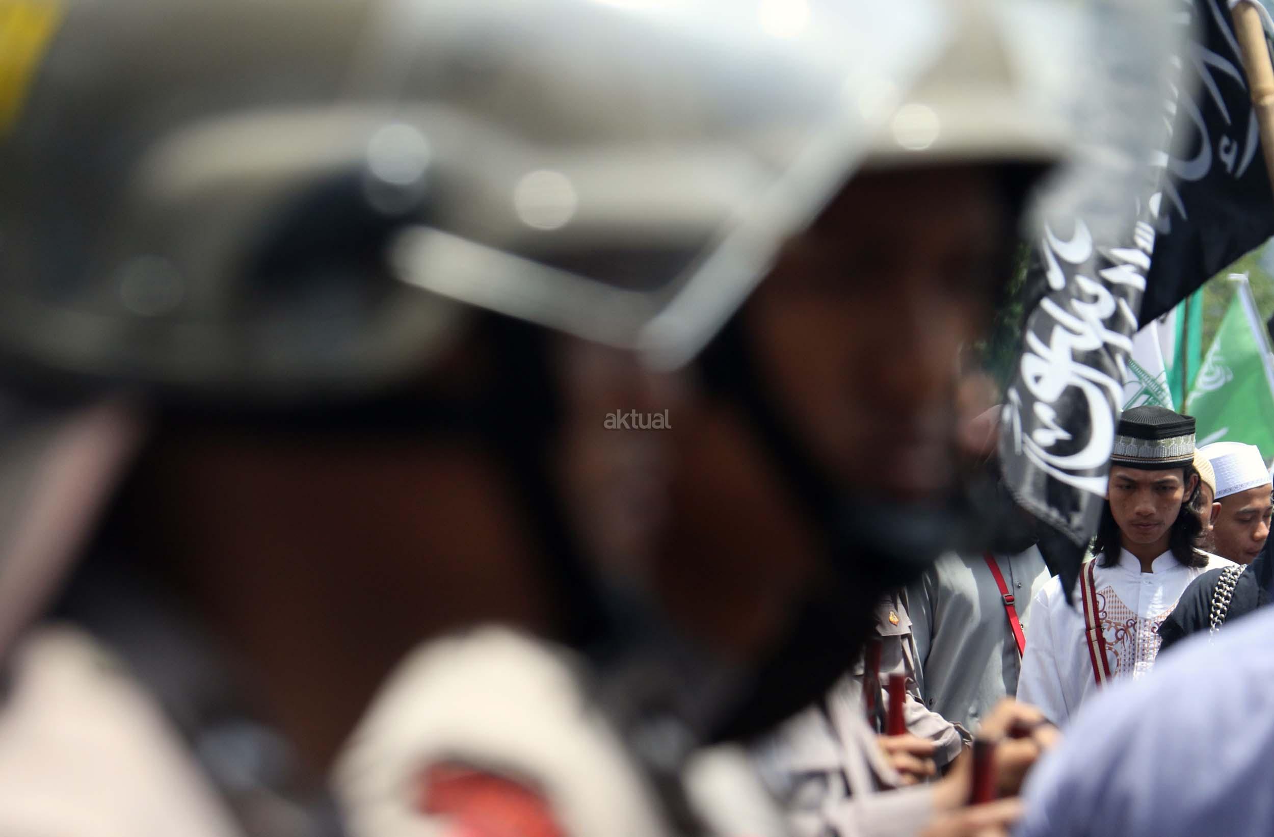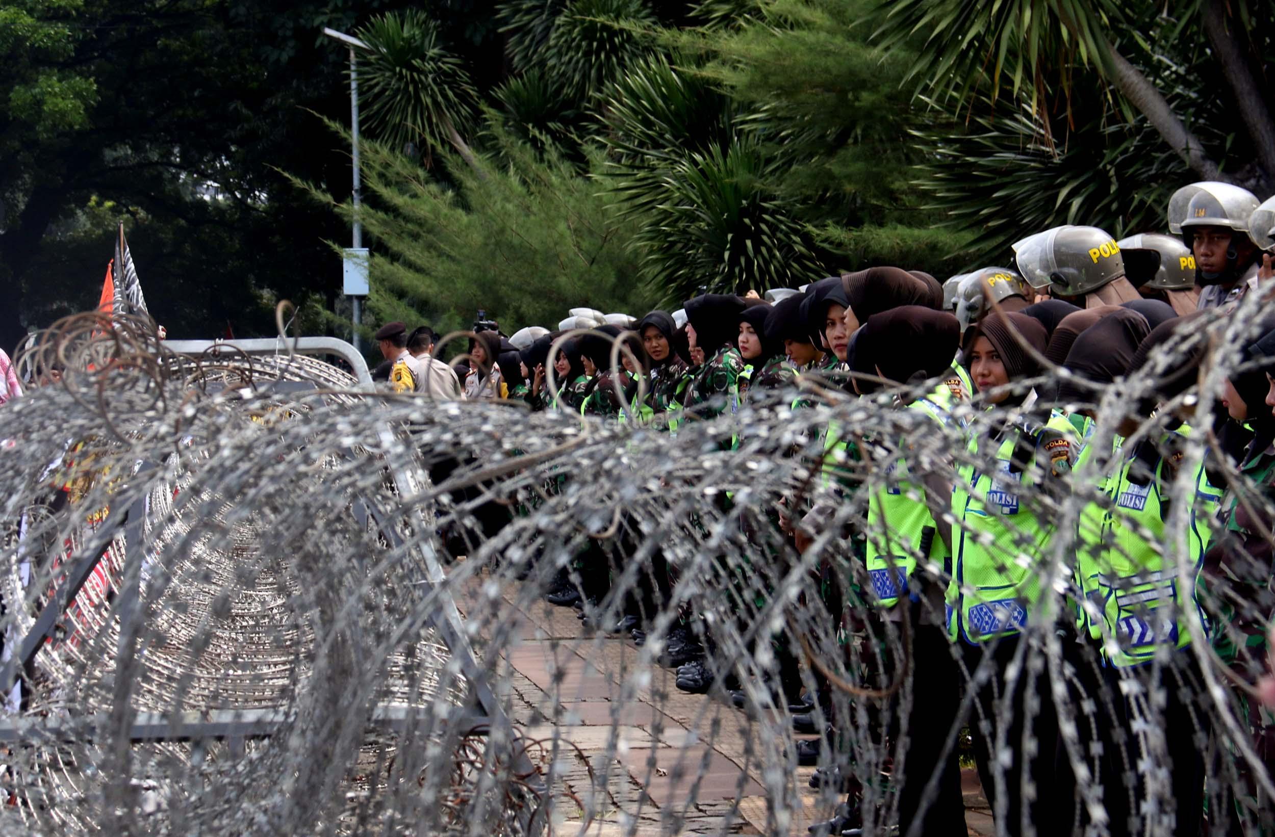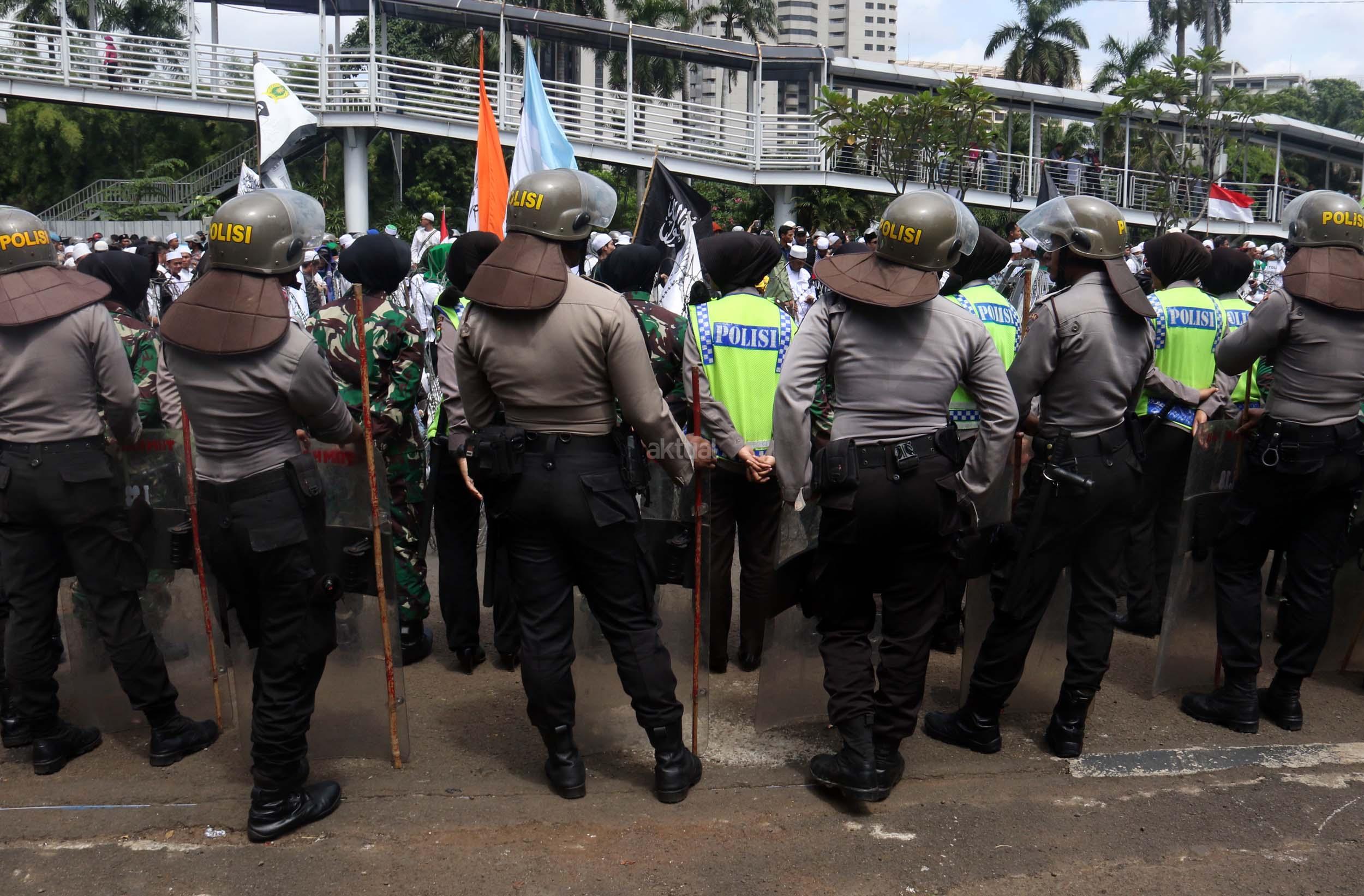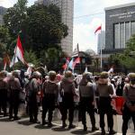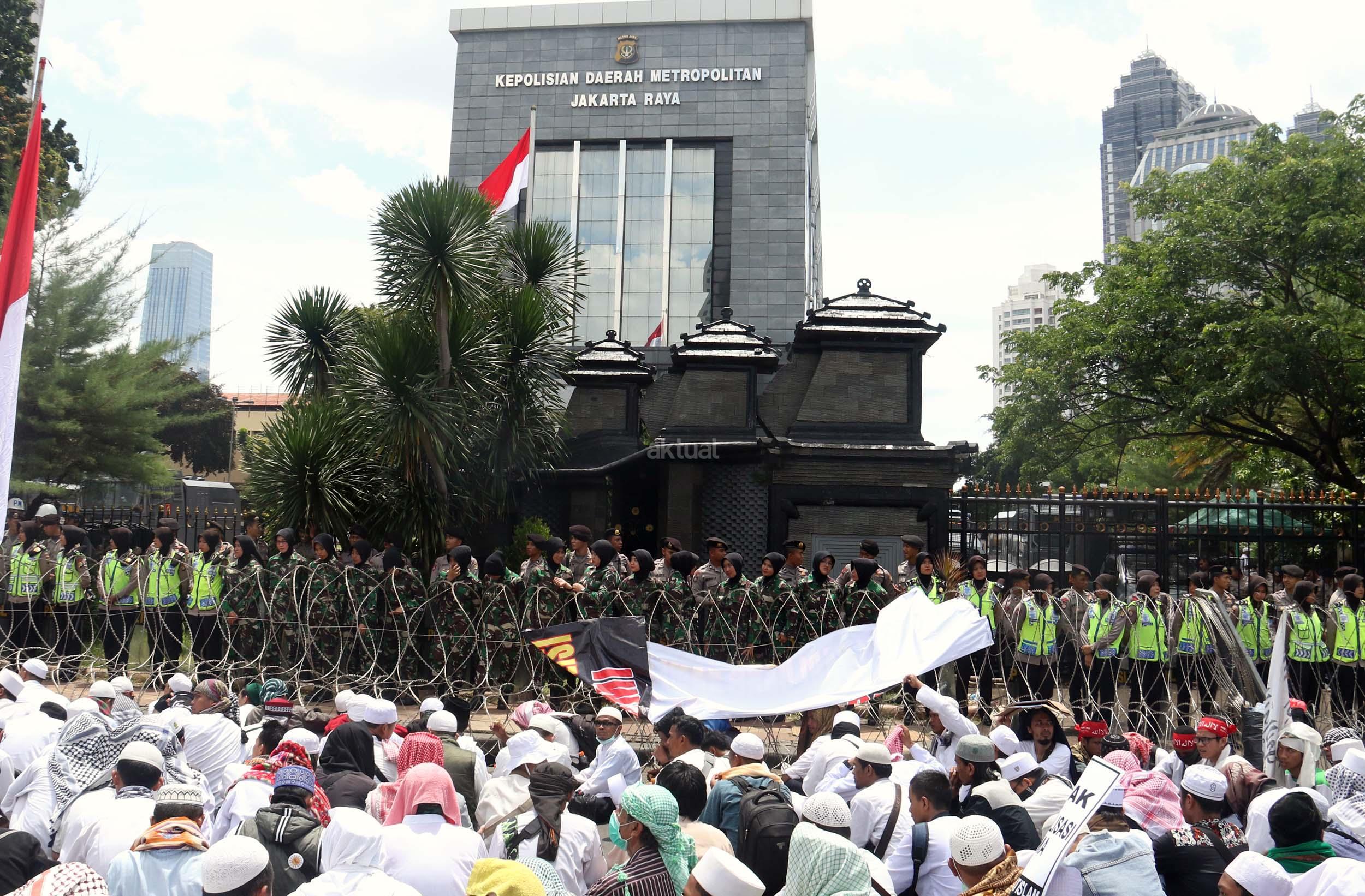 Ratusan personil Kepolisian dan TNI menjaga aksi damai ribuan pendukung Imam Besar FPI, Habib Rizieq Shihab, di depan Polda Metro Jaya, Jakarta, Senin, (23/1/2017). Kepolisian Daerah Metro Jaya memeriksa imam besar Front Pembela Islam, Rizieq Syihab, dalam kasus ujaran kebencian terkait dengan adanya gambar palu-arit di uang kertas baru yang dikeluarkan Bank Indonesia.