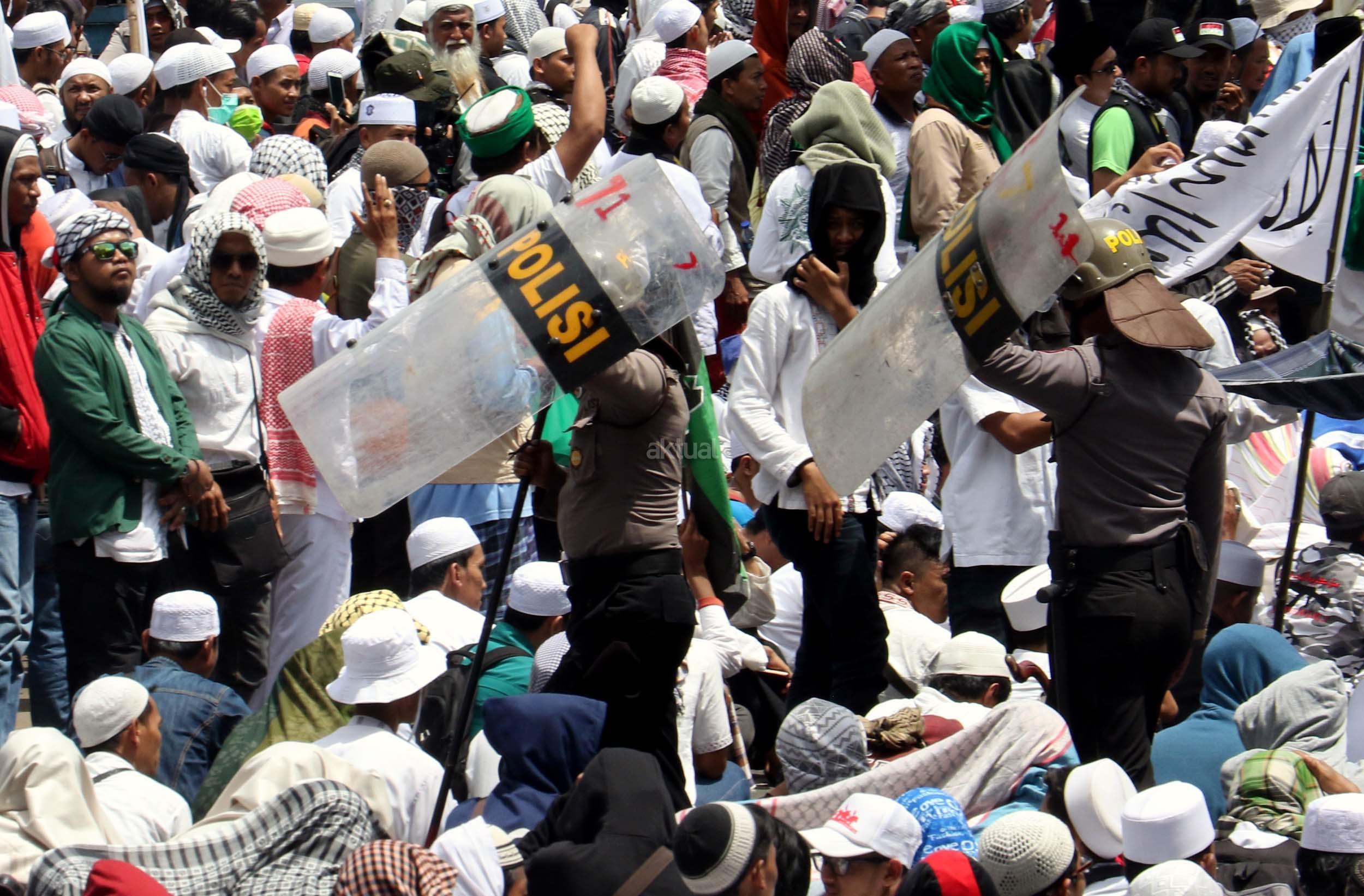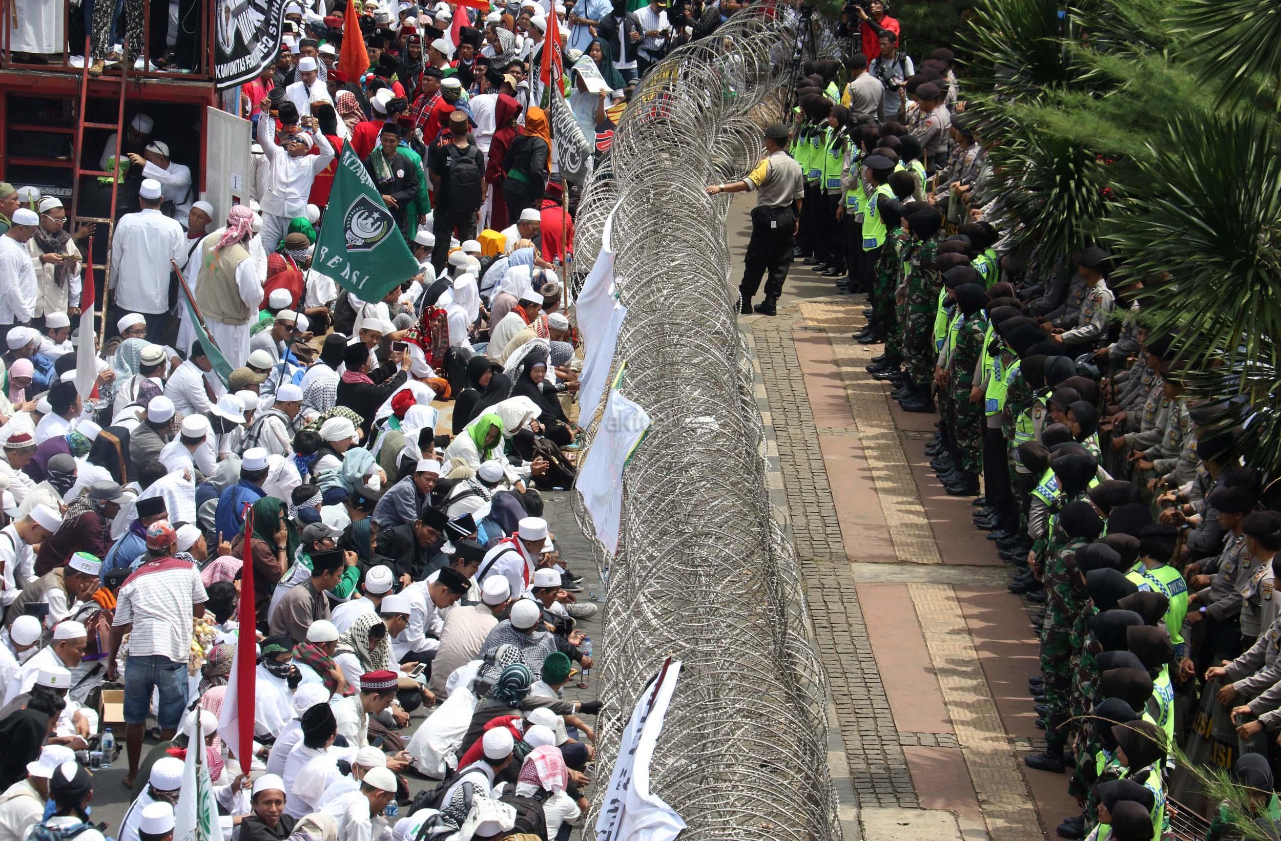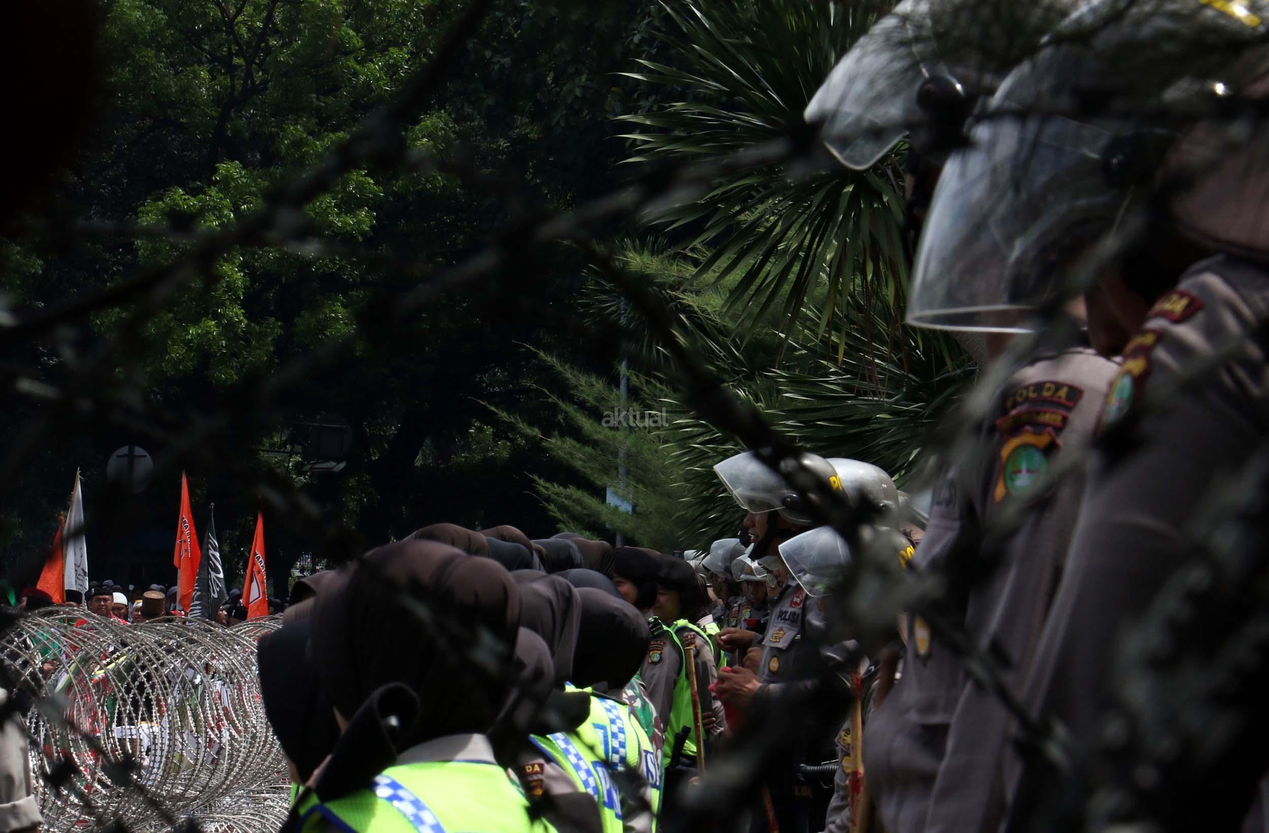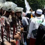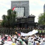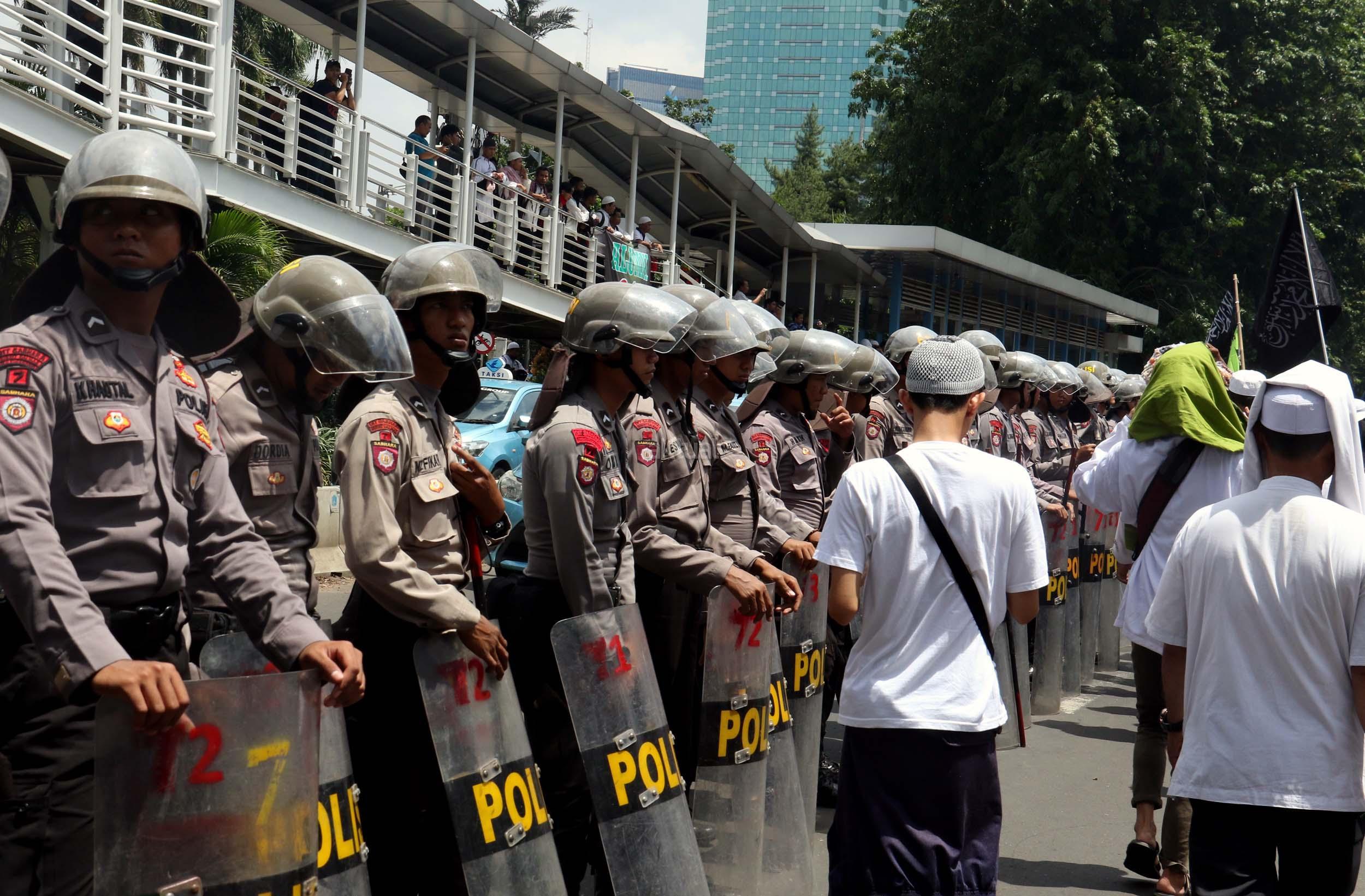 Ratusan personil Kepolisian dan TNI menjaga aksi damai ribuan pendukung Imam Besar FPI, Habib Rizieq Shihab, di depan Polda Metro Jaya, Jakarta, Senin, (23/1/2017). Kepolisian Daerah Metro Jaya memeriksa imam besar Front Pembela Islam, Rizieq Syihab, dalam kasus ujaran kebencian terkait dengan adanya gambar palu-arit di uang kertas baru yang dikeluarkan Bank Indonesia.