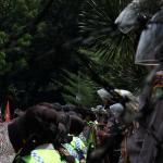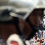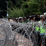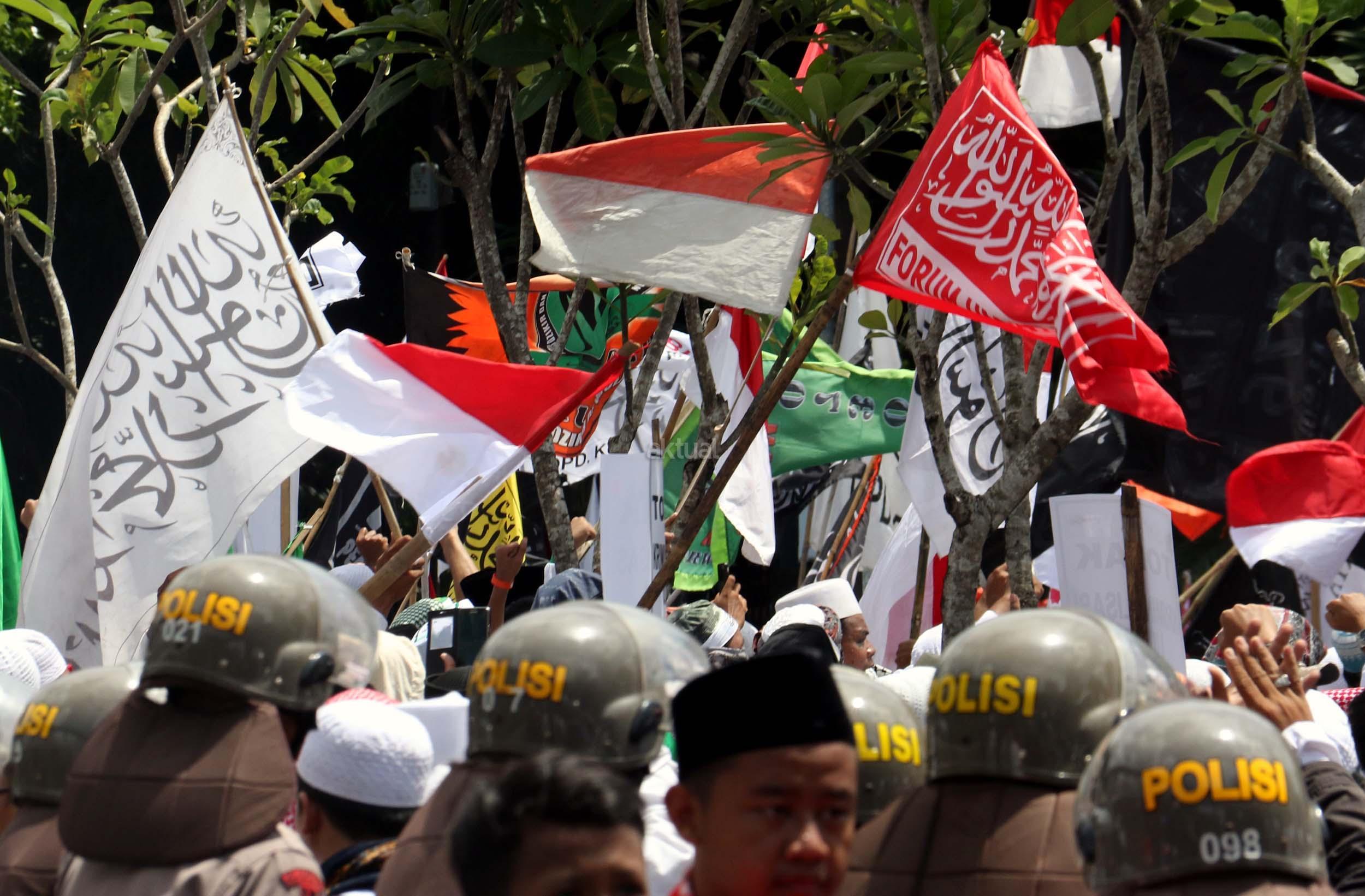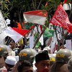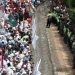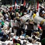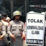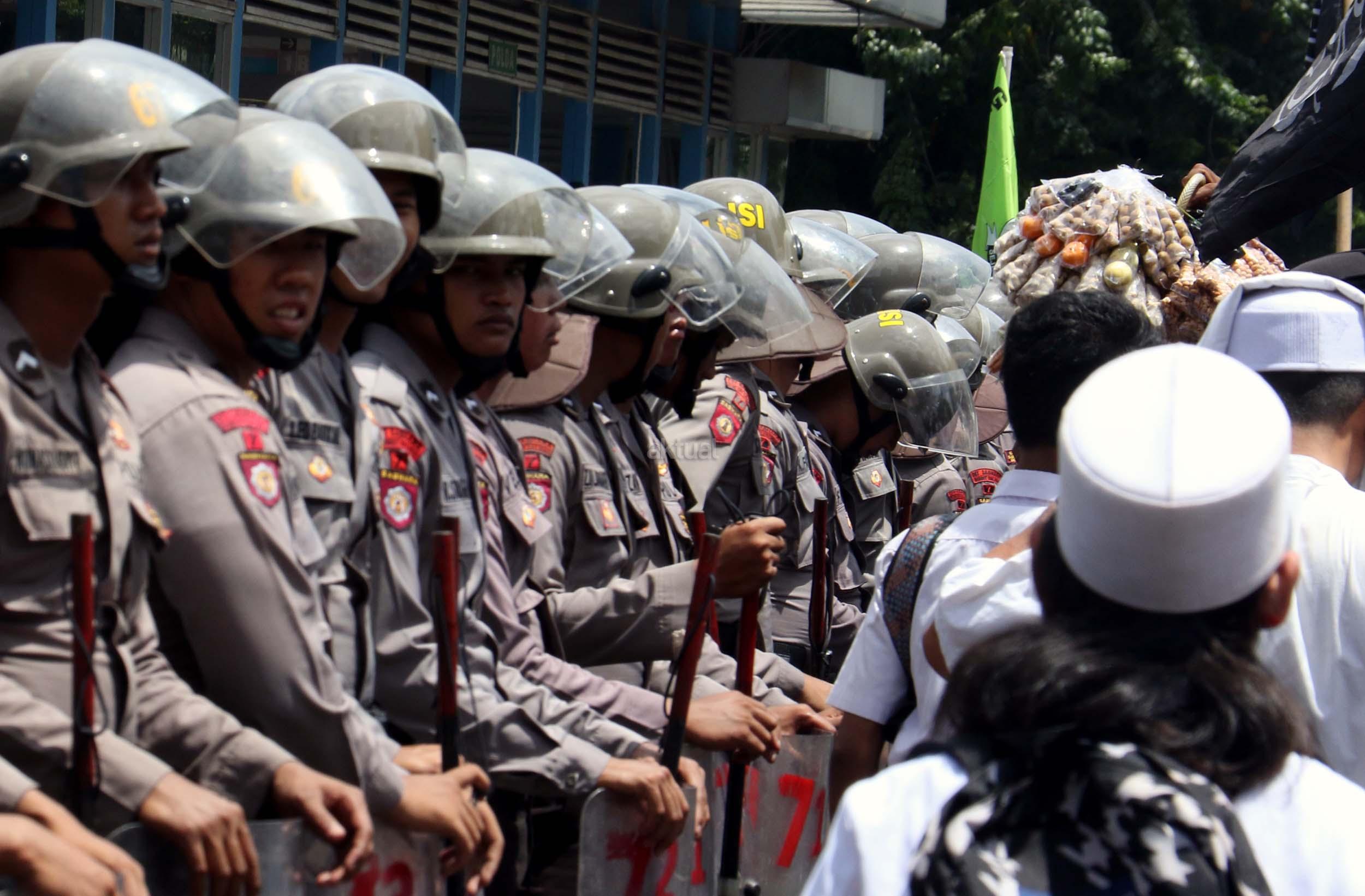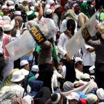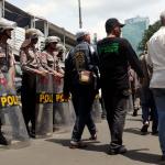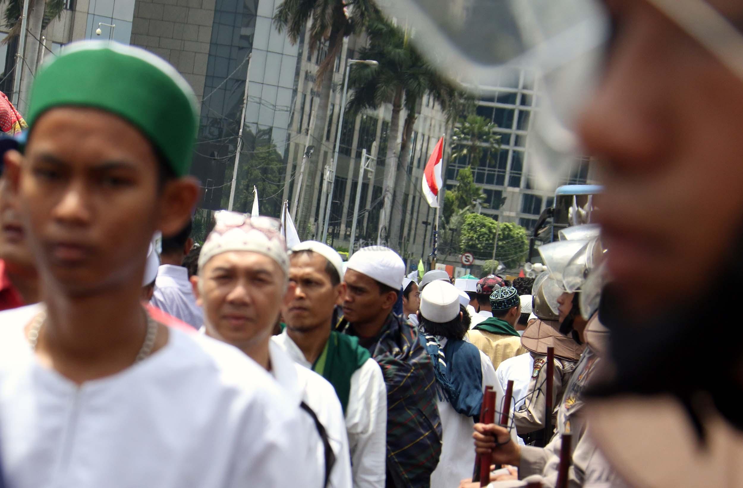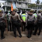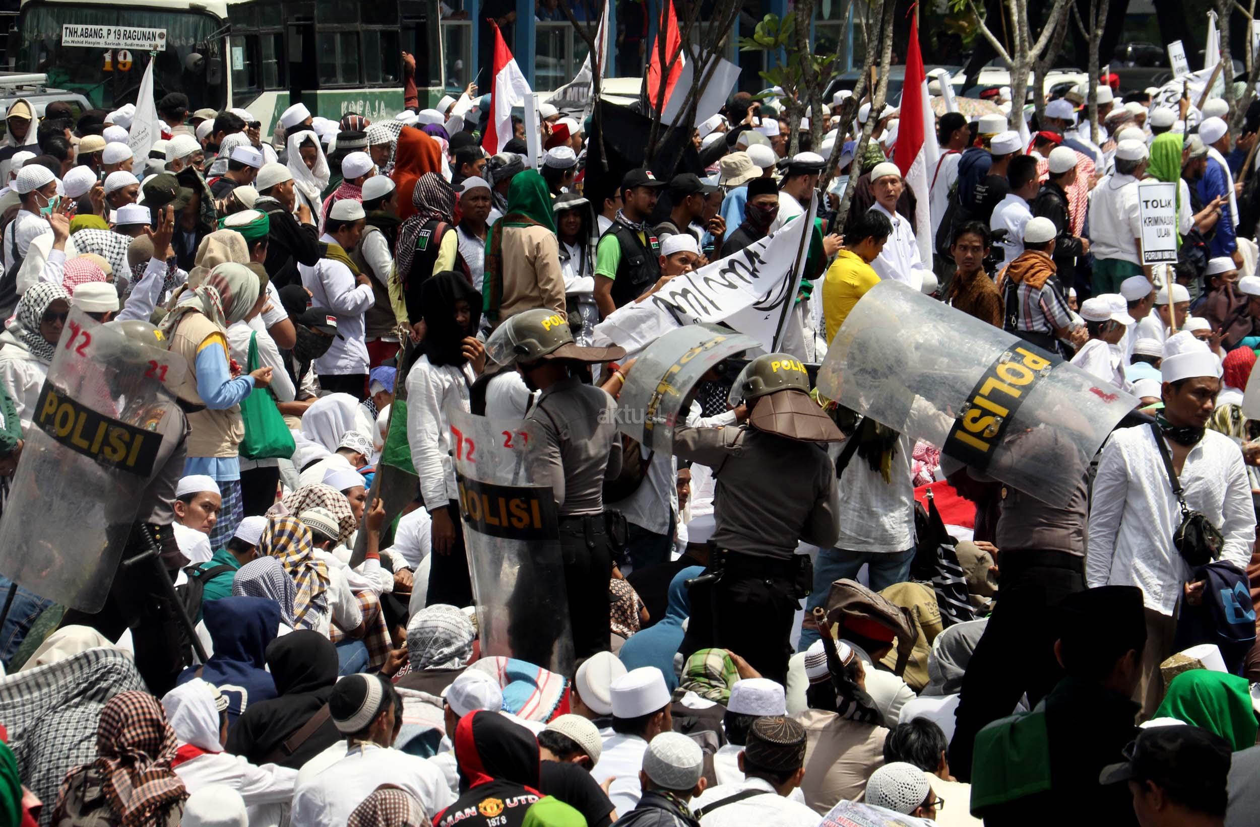 Ratusan personil Kepolisian dan TNI menjaga aksi damai ribuan pendukung Imam Besar FPI, Habib Rizieq Shihab, di depan Polda Metro Jaya, Jakarta, Senin, (23/1/2017). Kepolisian Daerah Metro Jaya memeriksa imam besar Front Pembela Islam, Rizieq Syihab, dalam kasus ujaran kebencian terkait dengan adanya gambar palu-arit di uang kertas baru yang dikeluarkan Bank Indonesia.