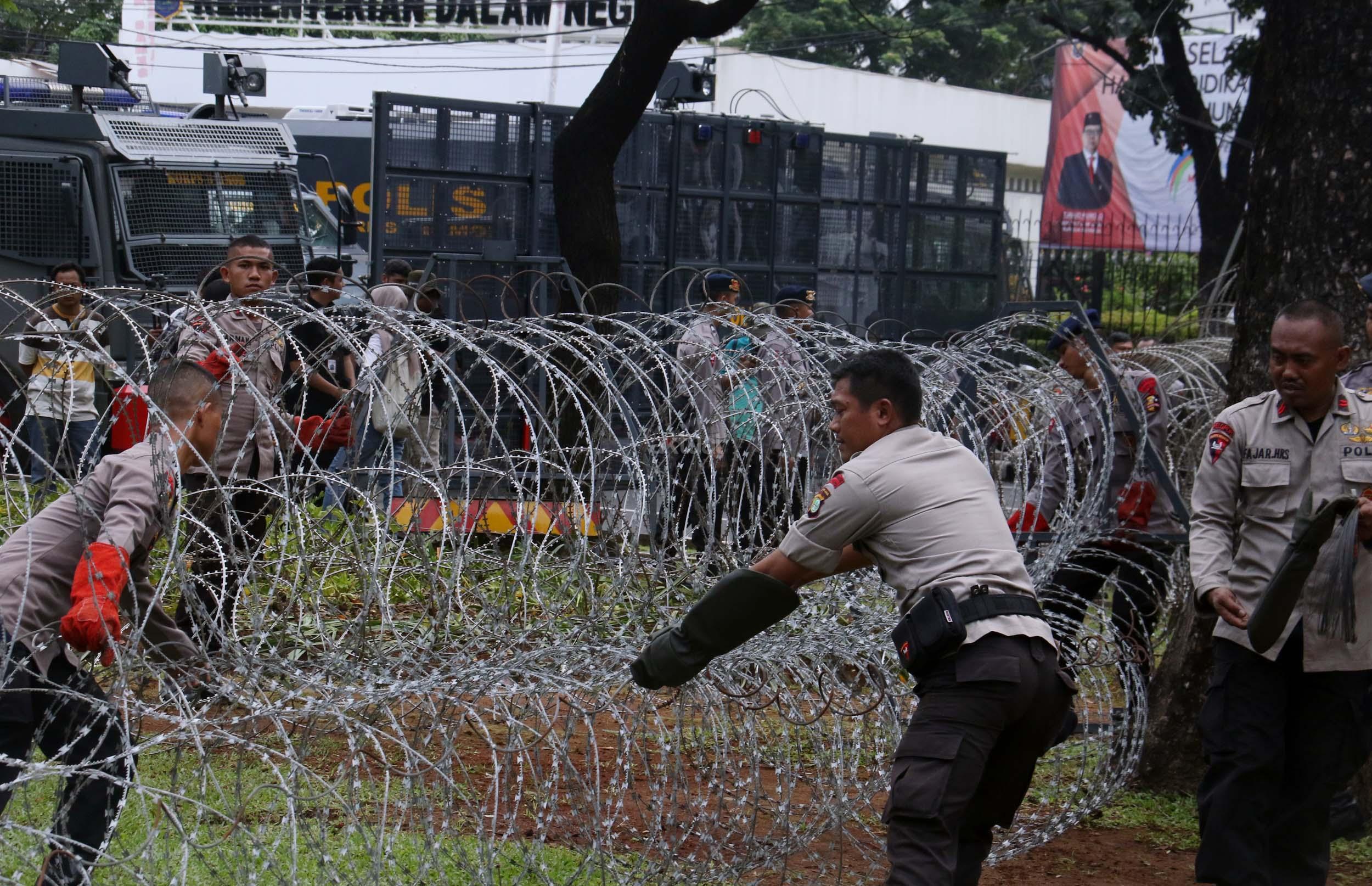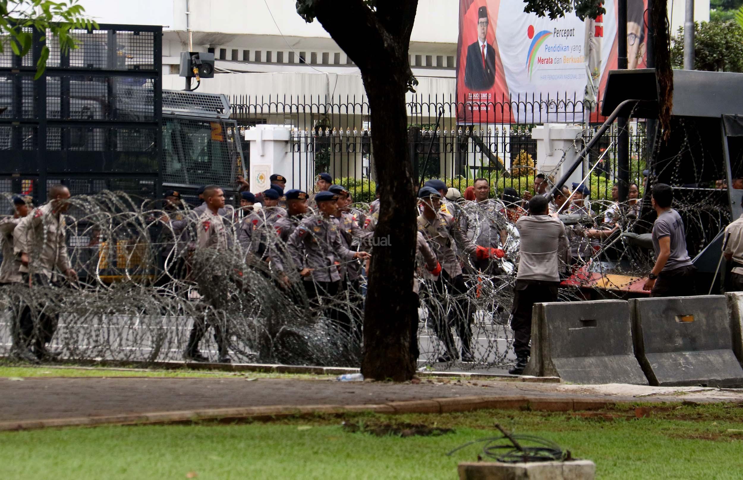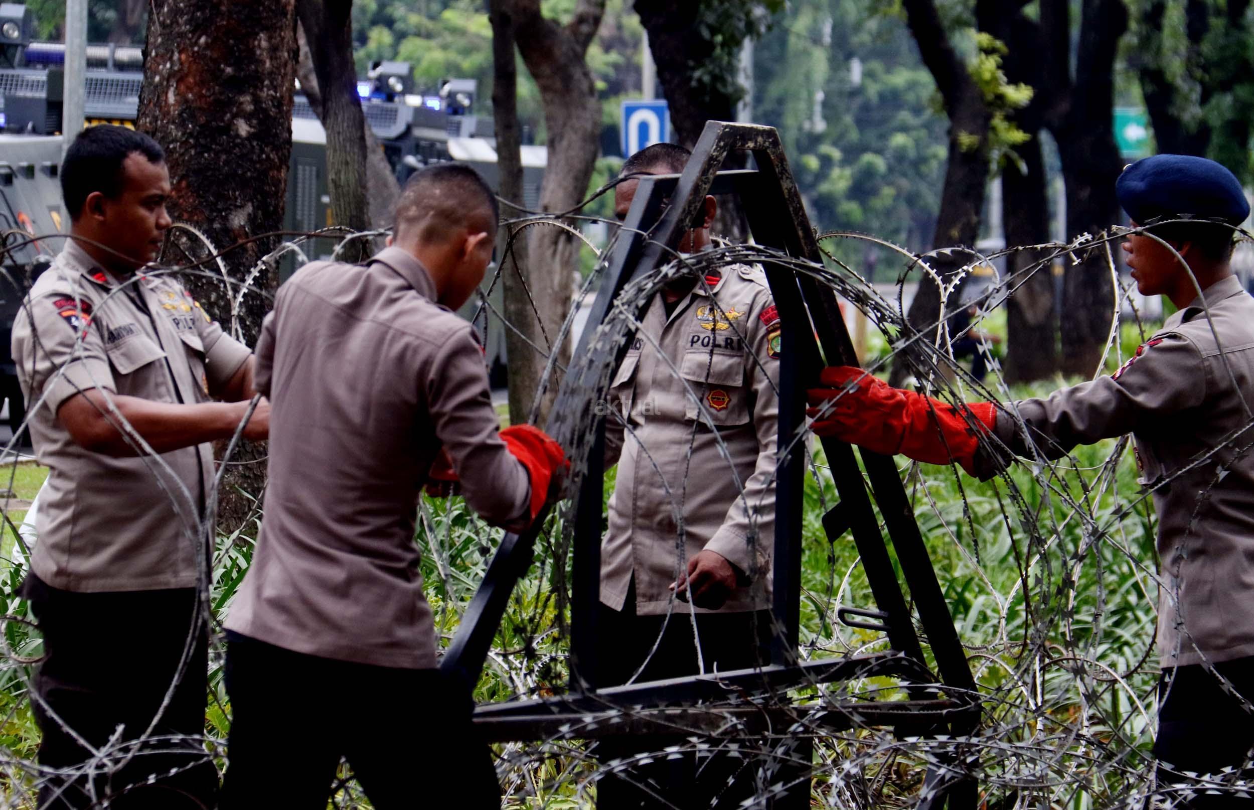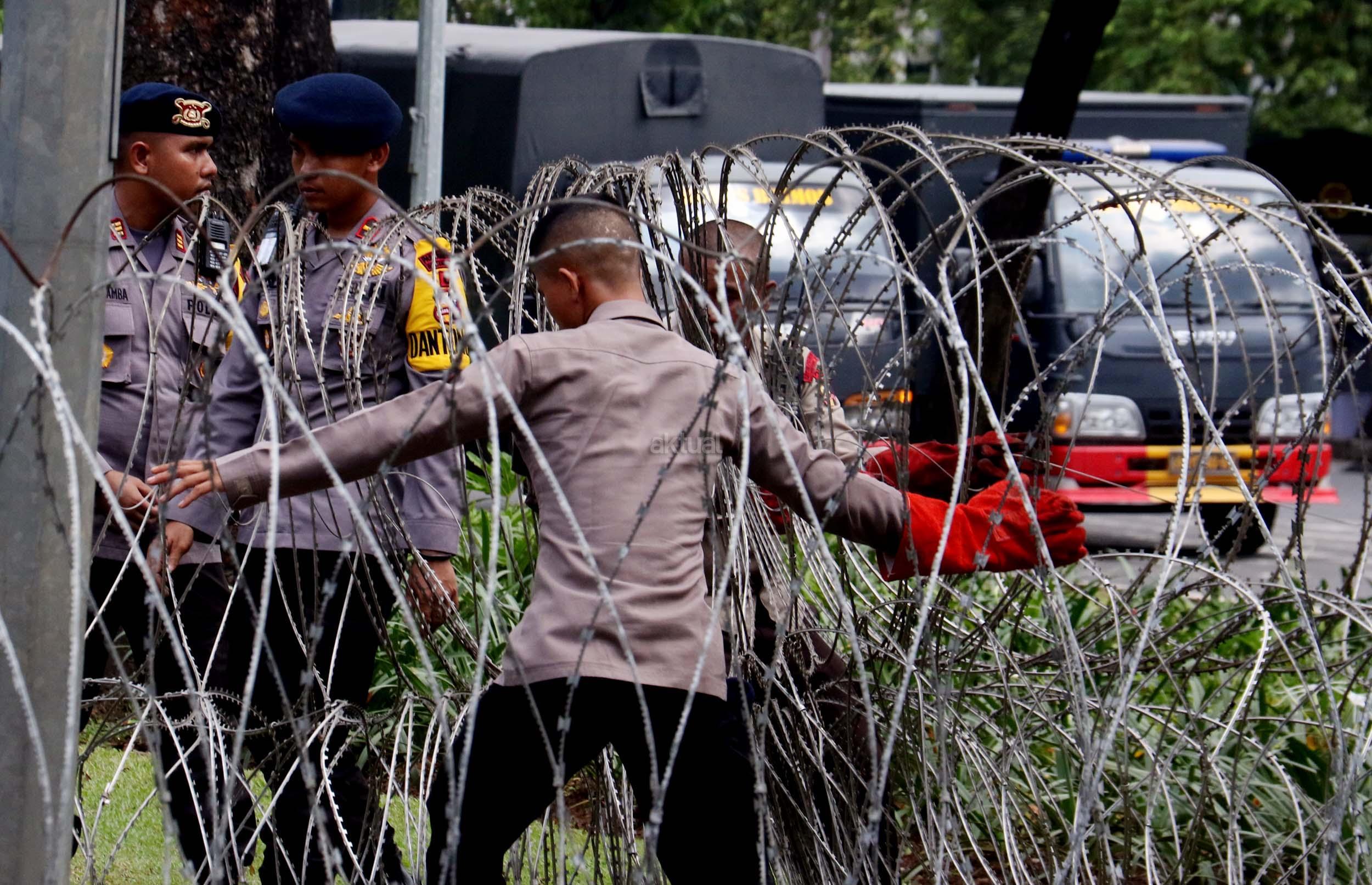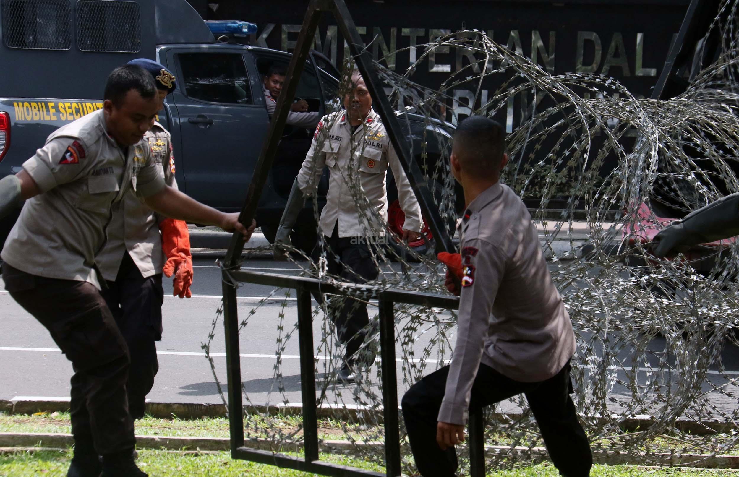 Terlihat petugas kepolisian mempersiapkan kawat dalam pengamanan aksi ribuan massa Gerakan Nasional Pembela Fatwa Majelis Ulama Indonesia (GNPF MUI) di depan gedung Mahkamah Agung, Jl. Medan Merdeka Utara, Jakarta, Jumat (5/5/2017). Dalam aksi massa Gerakan Nasional Pembela Fatwa Majelis Ulama Indonesia (GNPF MUI) pihak Polda Metro Jaya menyiapkan 15.000 personil guna mengamankan aksi “long march” massa Gerakan Nasional Pengawal Fatwa Majelis Ulama Indonesia (GNPF MUI). AKTUAL/Munzir