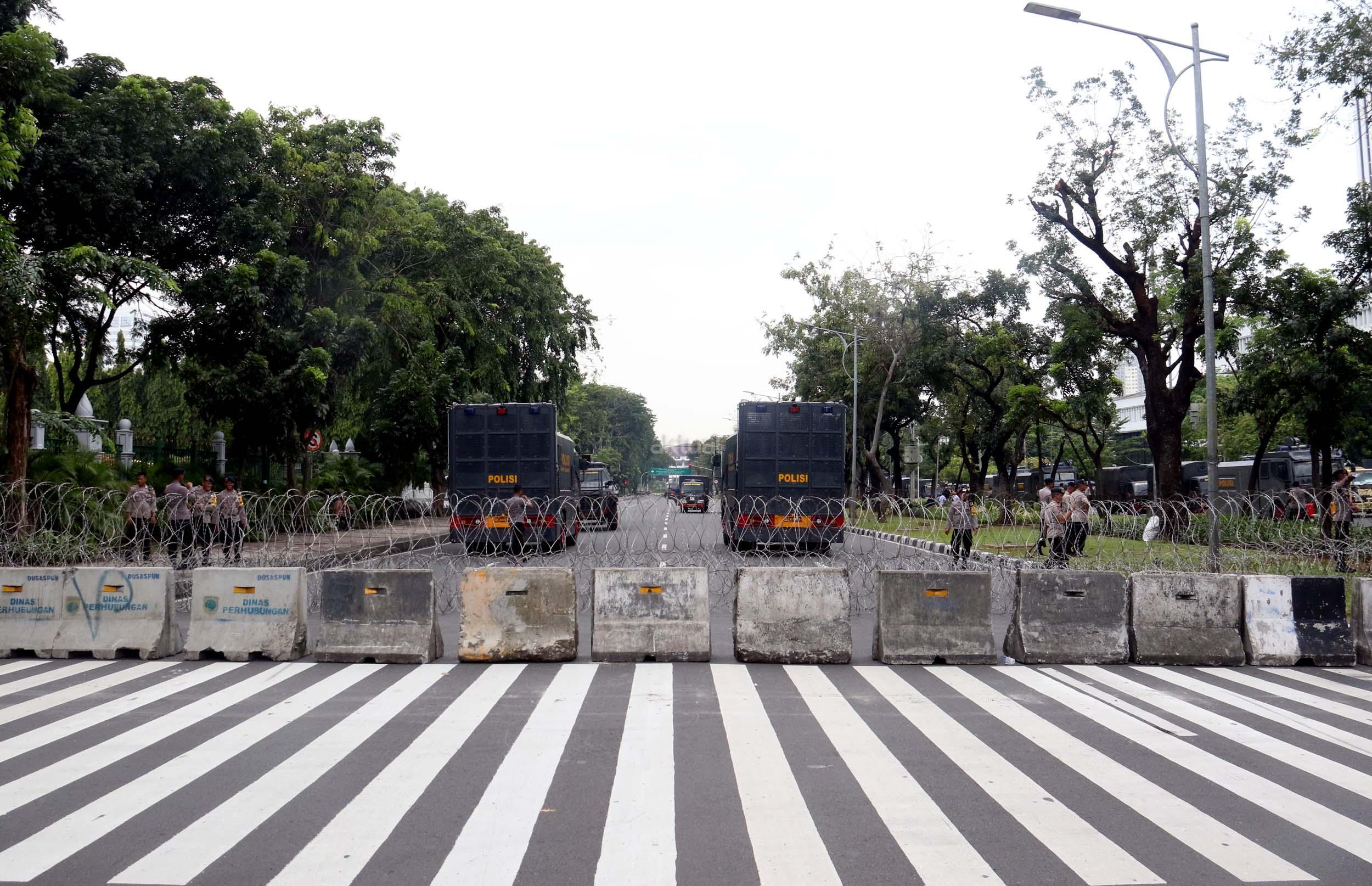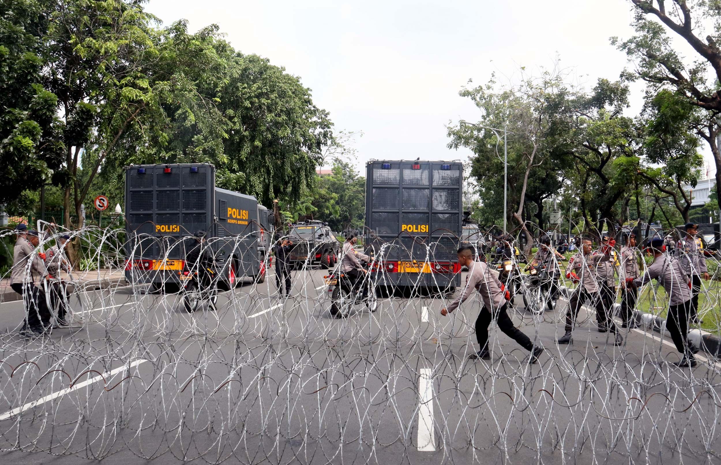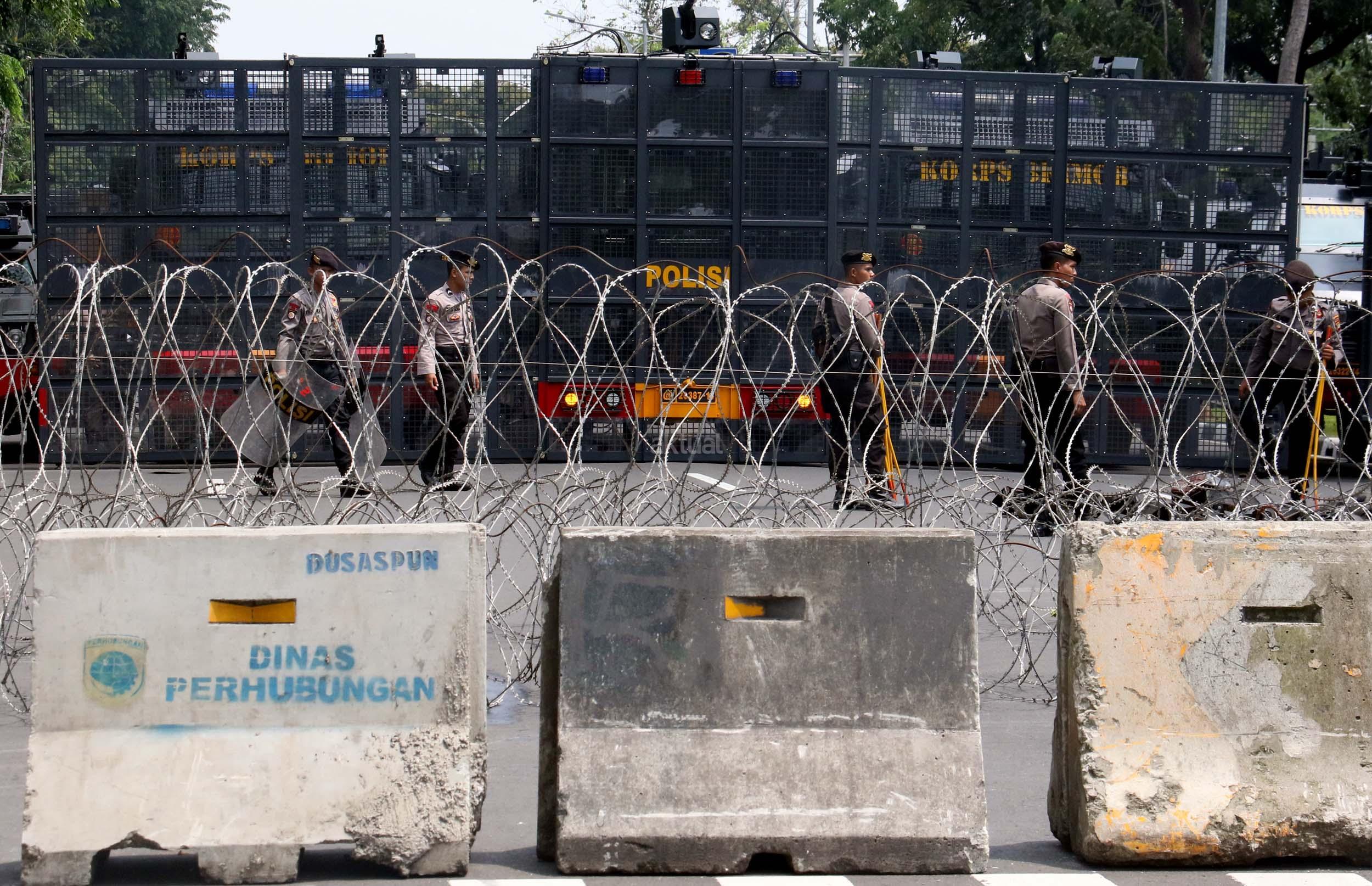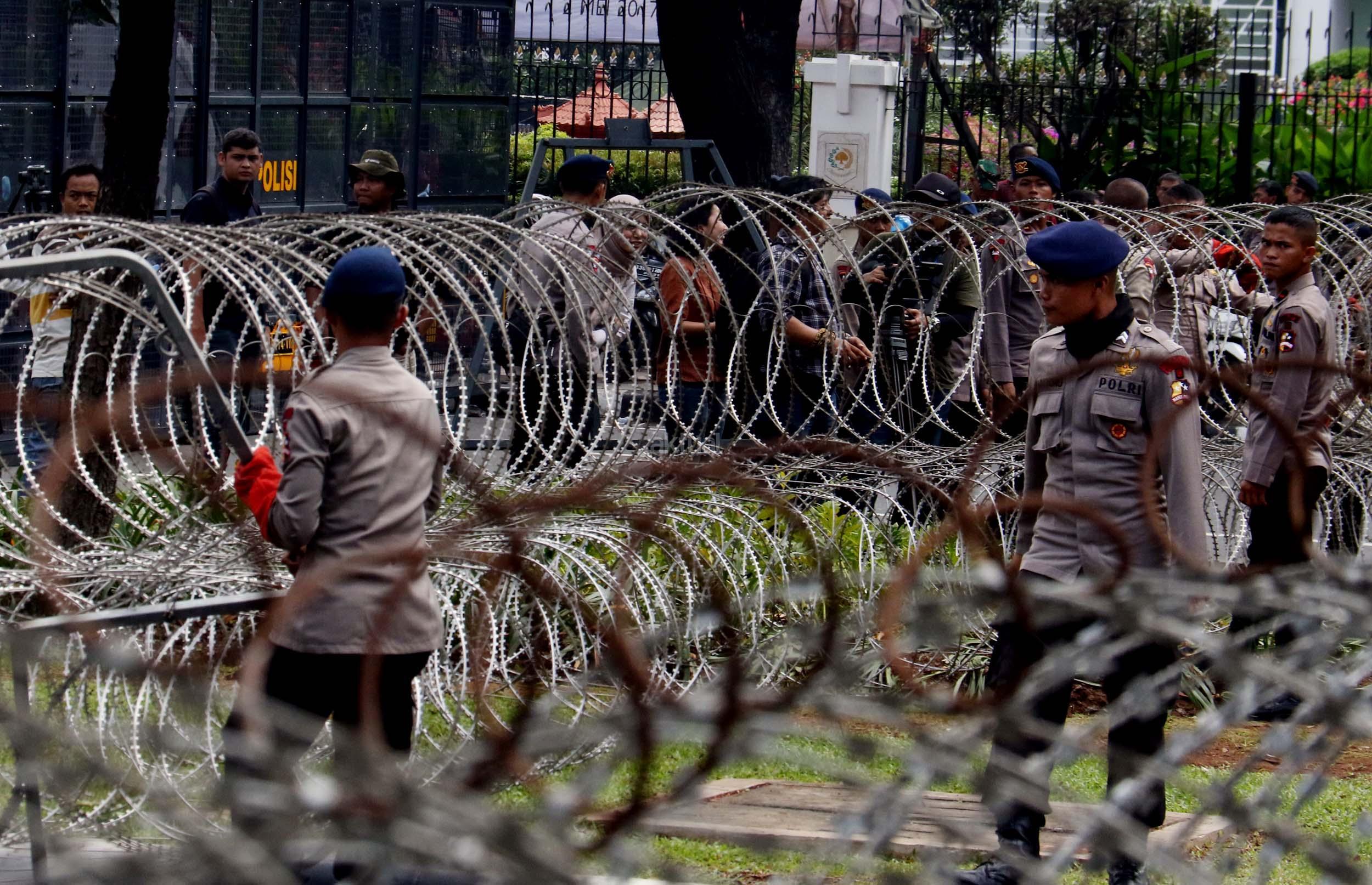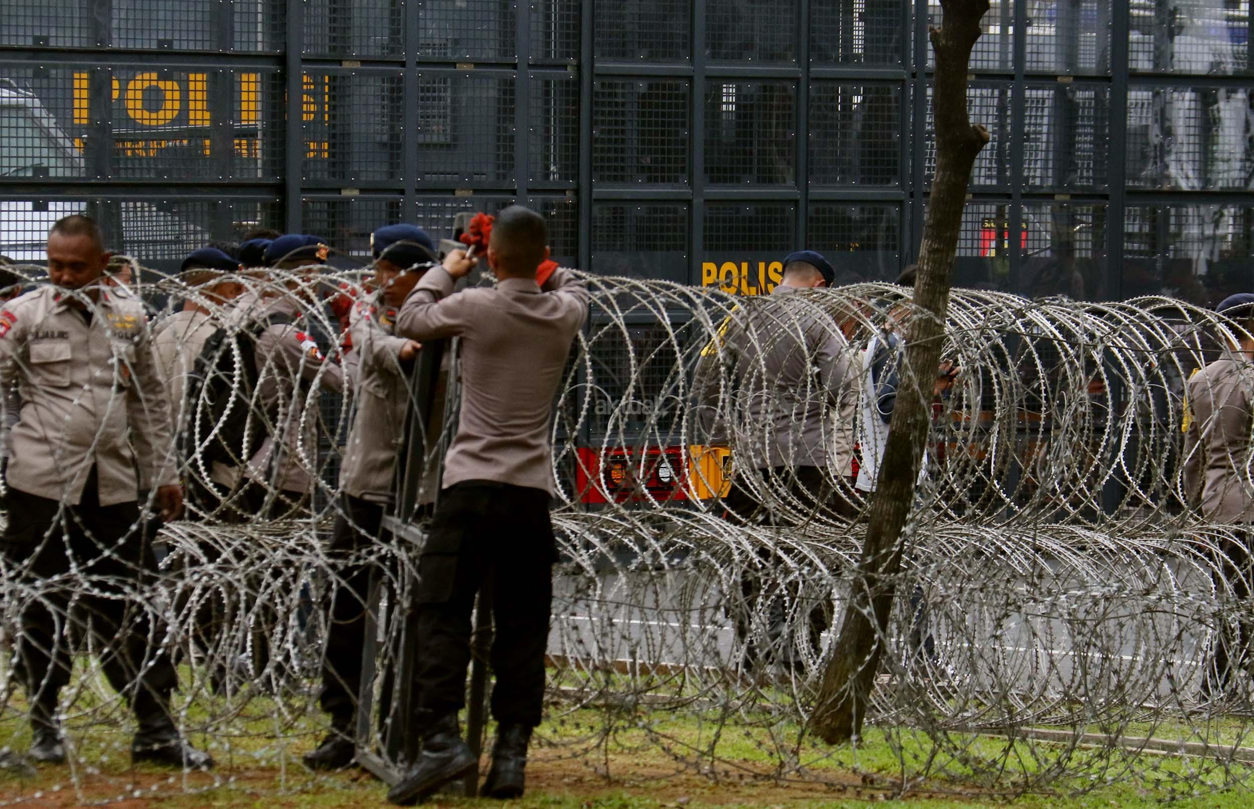 Terlihat petugas kepolisian mempersiapkan kawat dalam pengamanan aksi ribuan massa Gerakan Nasional Pembela Fatwa Majelis Ulama Indonesia (GNPF MUI) di depan gedung Mahkamah Agung, Jl. Medan Merdeka Utara, Jakarta, Jumat (5/5/2017). Dalam aksi massa Gerakan Nasional Pembela Fatwa Majelis Ulama Indonesia (GNPF MUI) pihak Polda Metro Jaya menyiapkan 15.000 personil guna mengamankan aksi “long march” massa Gerakan Nasional Pengawal Fatwa Majelis Ulama Indonesia (GNPF MUI). AKTUAL/Munzir