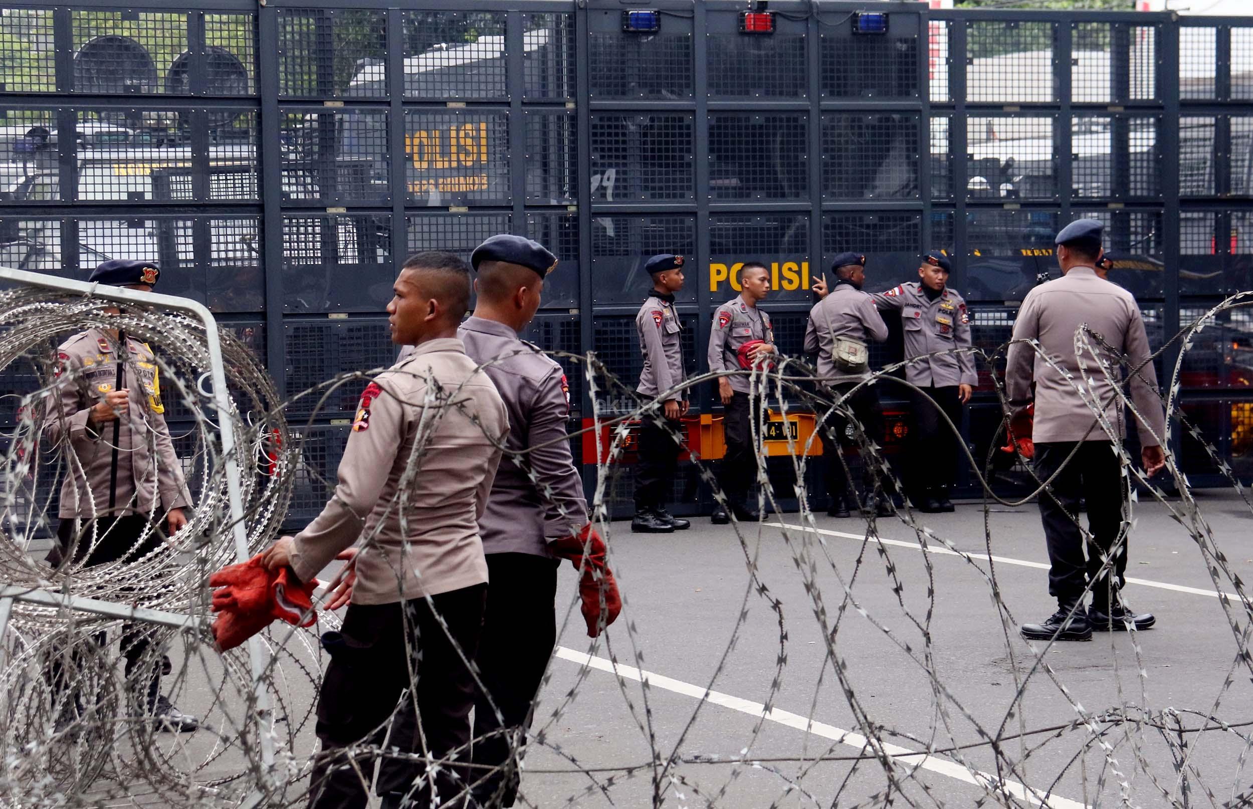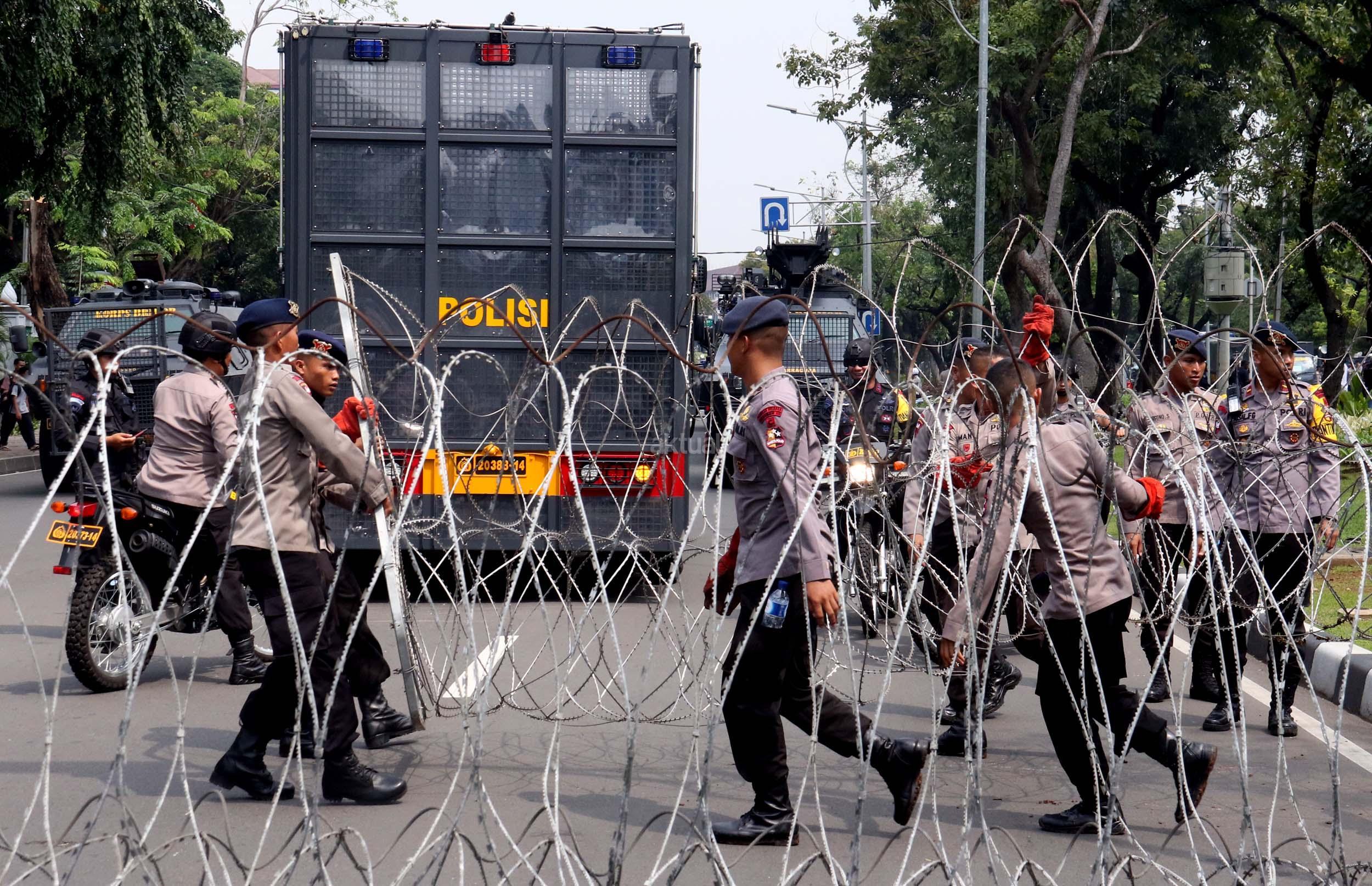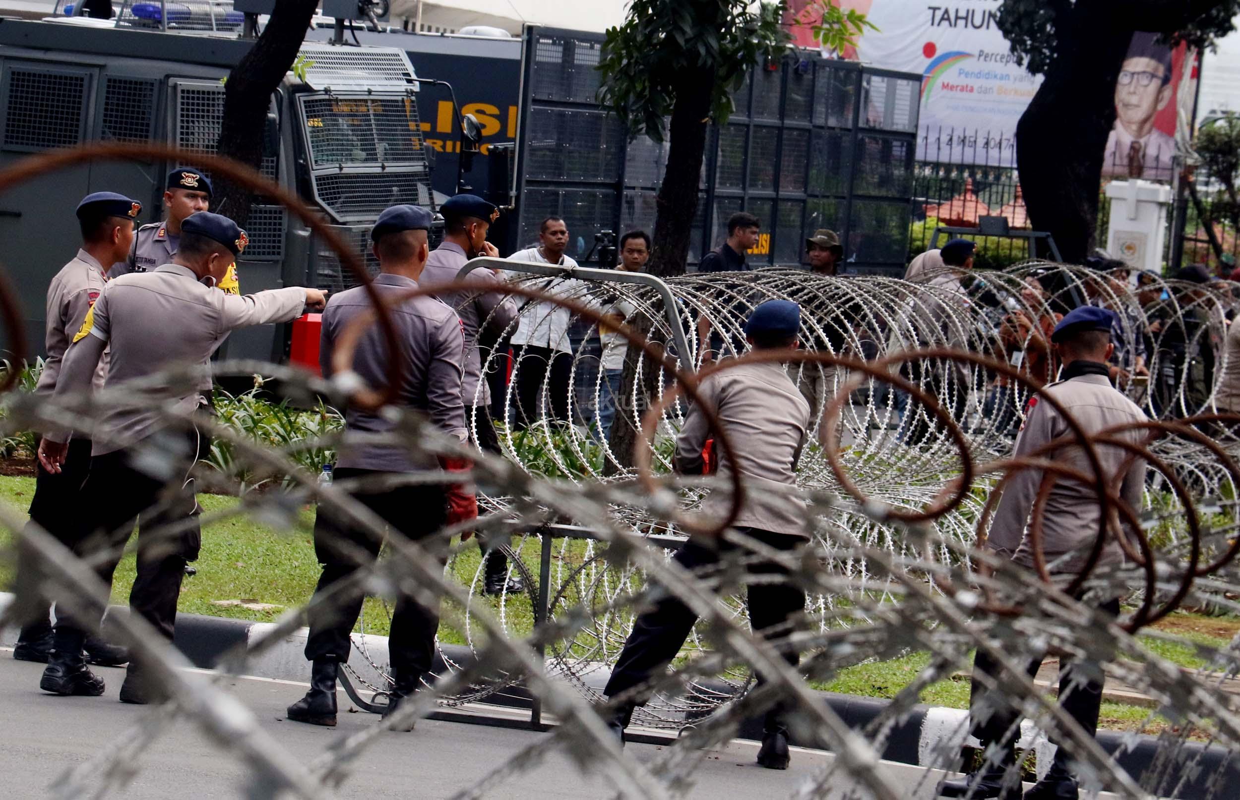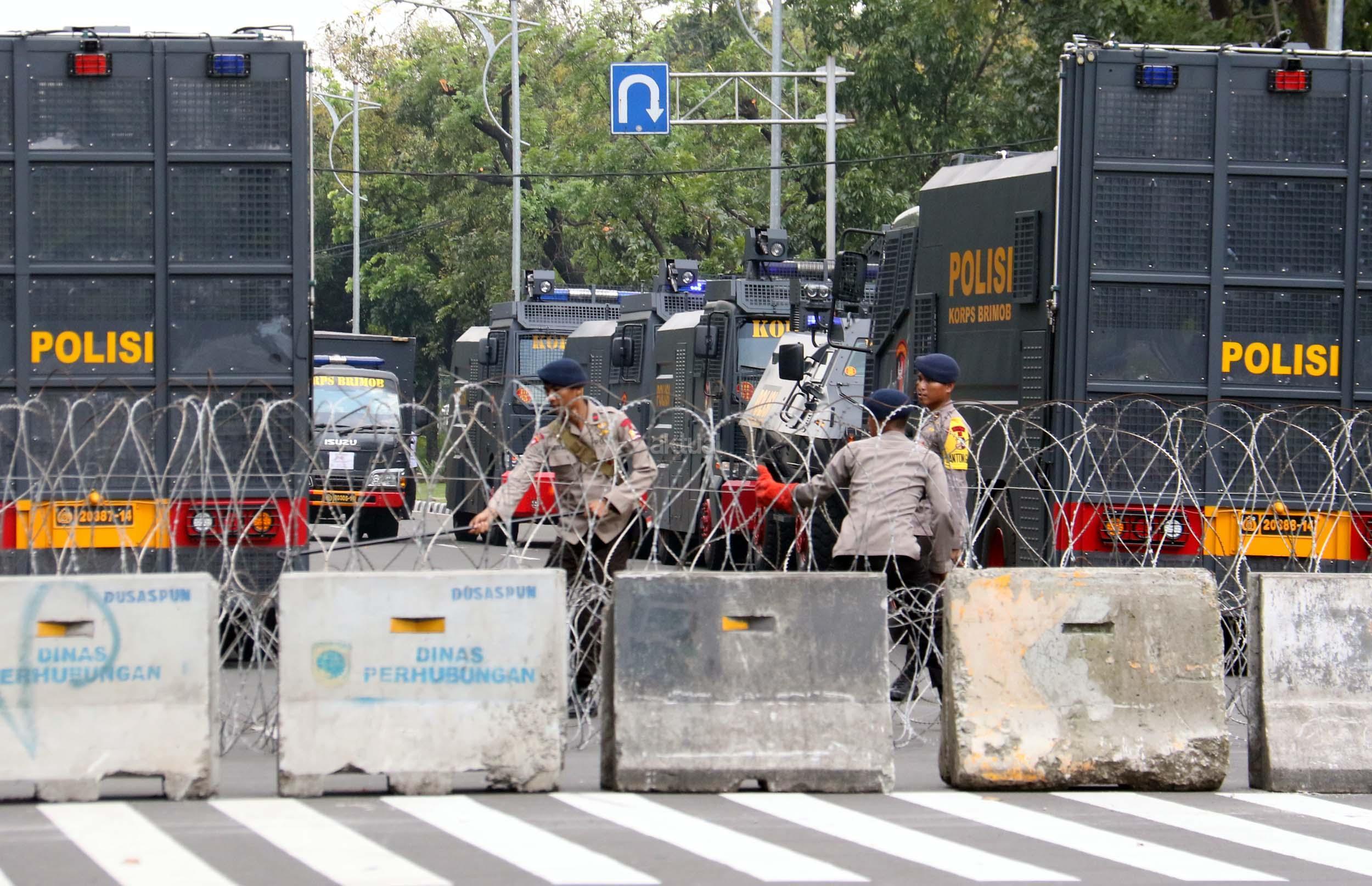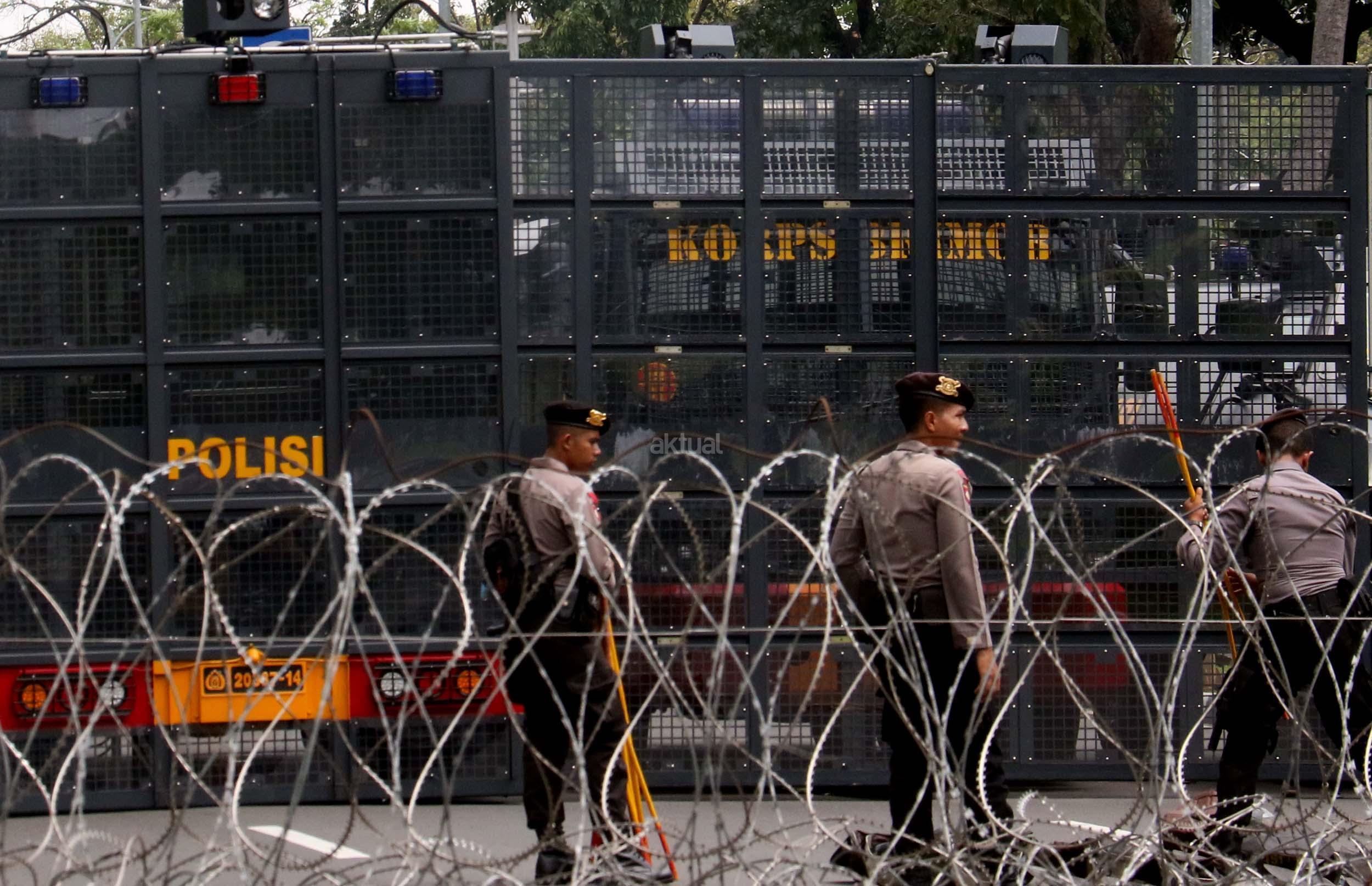 Terlihat petugas kepolisian mempersiapkan kawat dalam pengamanan aksi ribuan massa Gerakan Nasional Pembela Fatwa Majelis Ulama Indonesia (GNPF MUI) di depan gedung Mahkamah Agung, Jl. Medan Merdeka Utara, Jakarta, Jumat (5/5/2017). Dalam aksi massa Gerakan Nasional Pembela Fatwa Majelis Ulama Indonesia (GNPF MUI) pihak Polda Metro Jaya menyiapkan 15.000 personil guna mengamankan aksi “long march” massa Gerakan Nasional Pengawal Fatwa Majelis Ulama Indonesia (GNPF MUI). AKTUAL/Munzir