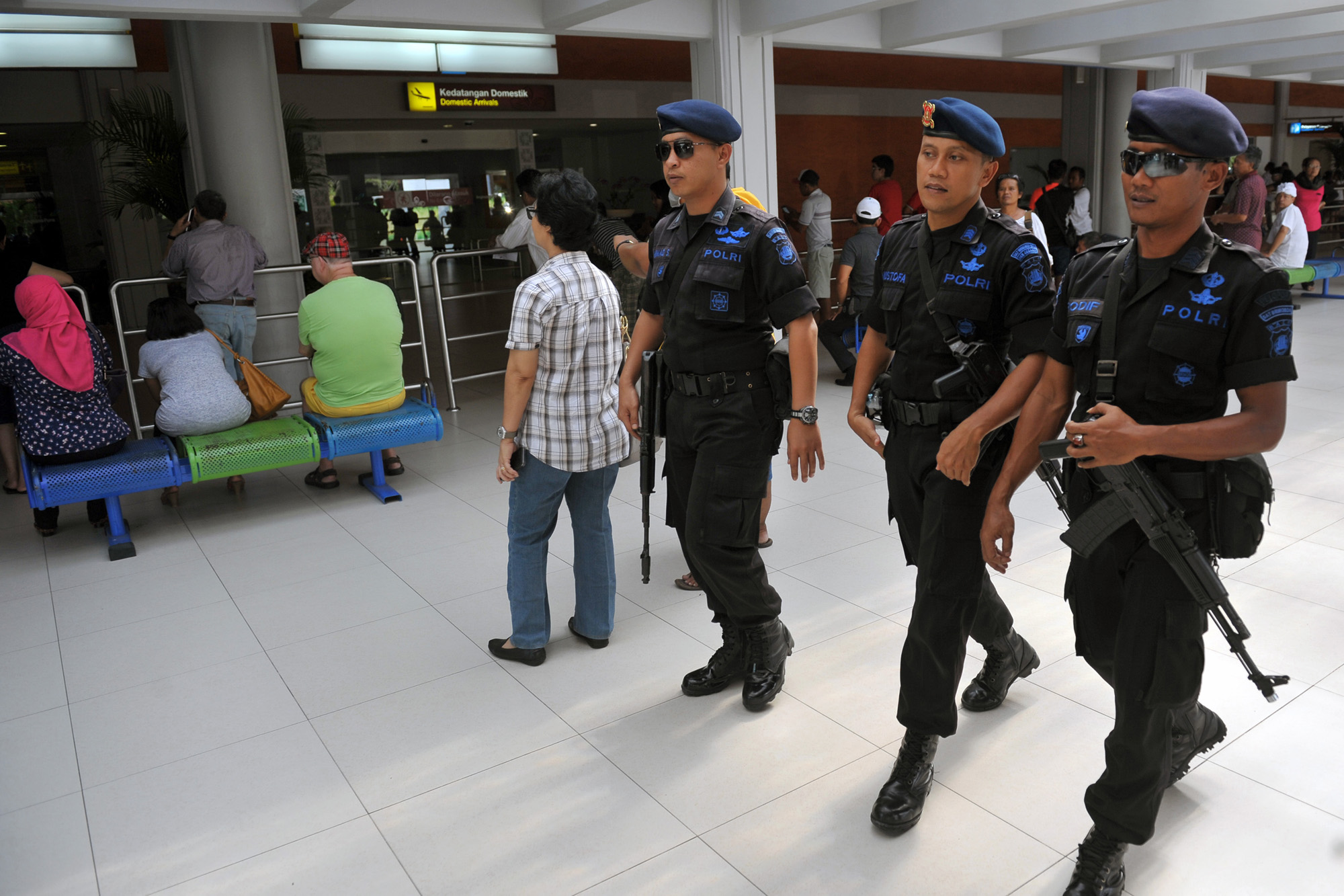 Anggota Brimob Polda Bali berpatroli di Terminal Kedatangan Domestik Bandara Ngurah Rai, Denpasar, Sabtu (28/11). Pengamanan bandara internasional tersebut diperketat dengan melibatkan unsur TNI, Polri, pengamanan bandara dan satuan pengamanan adat atau Pecalang untuk mengantisipasi ancaman teroris yang akhir-akhir ini merebak pasca teror di Paris, Prancis. ANTARA FOTO/Nyoman Budhiana/aww/15.