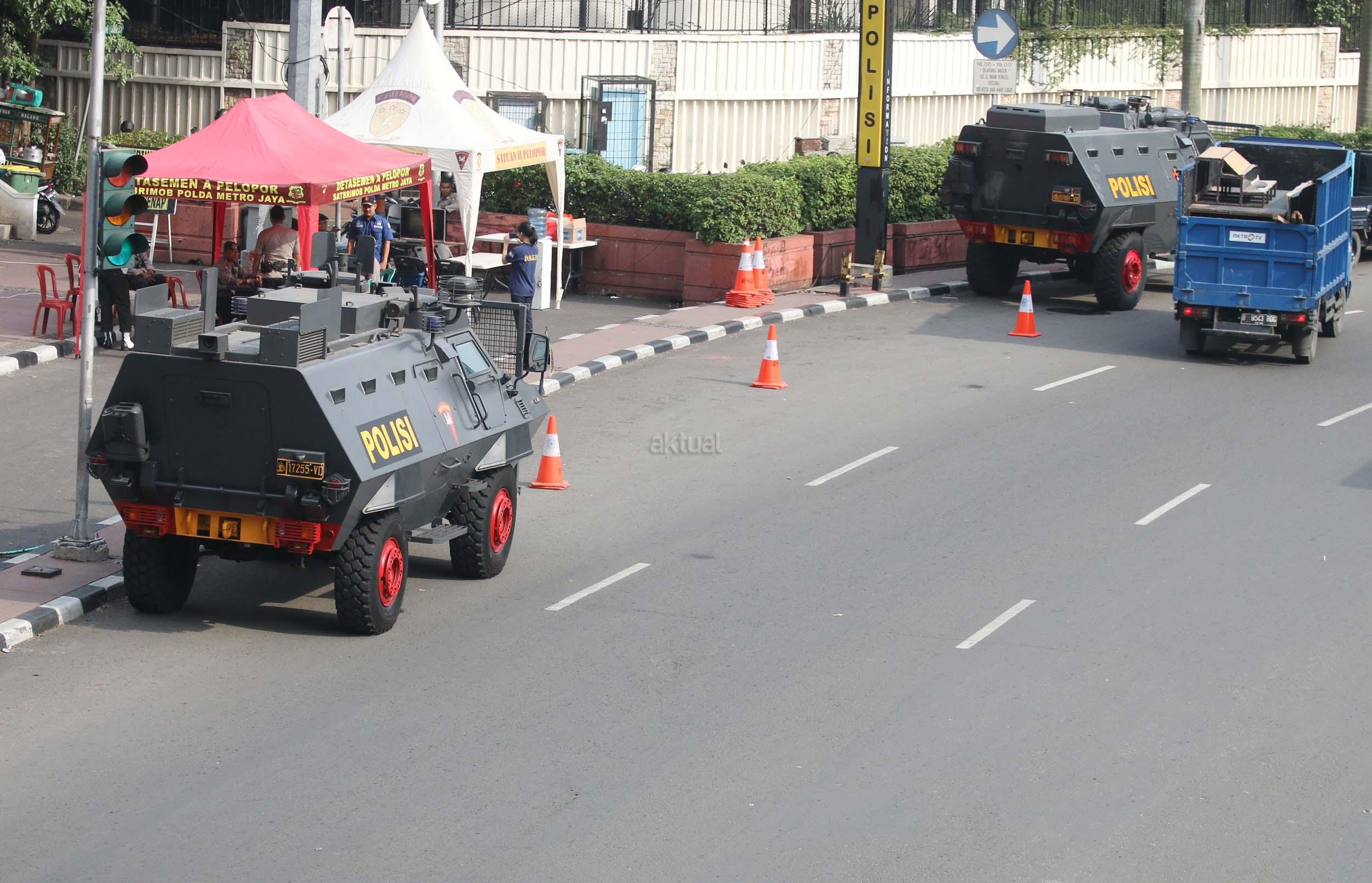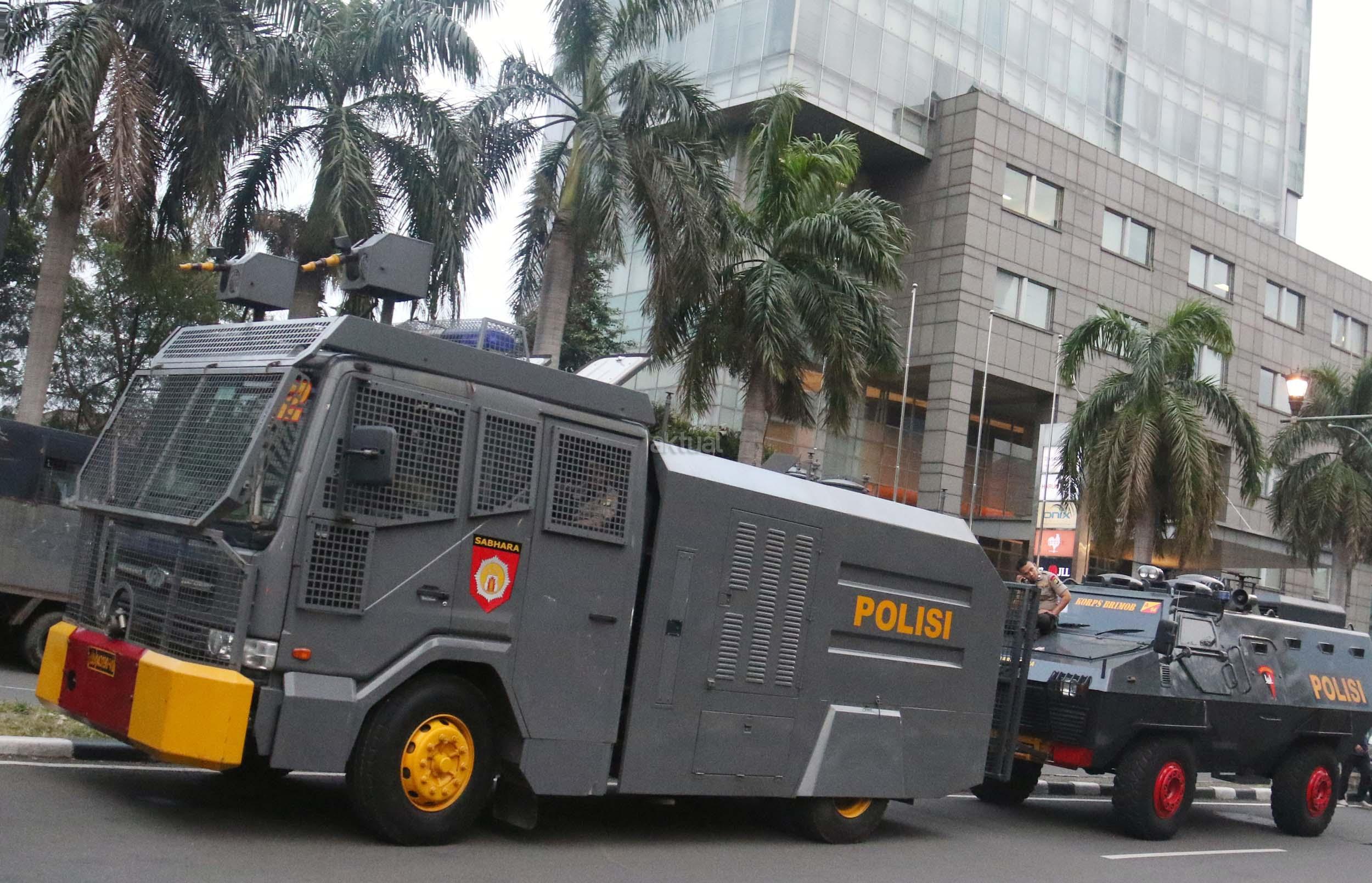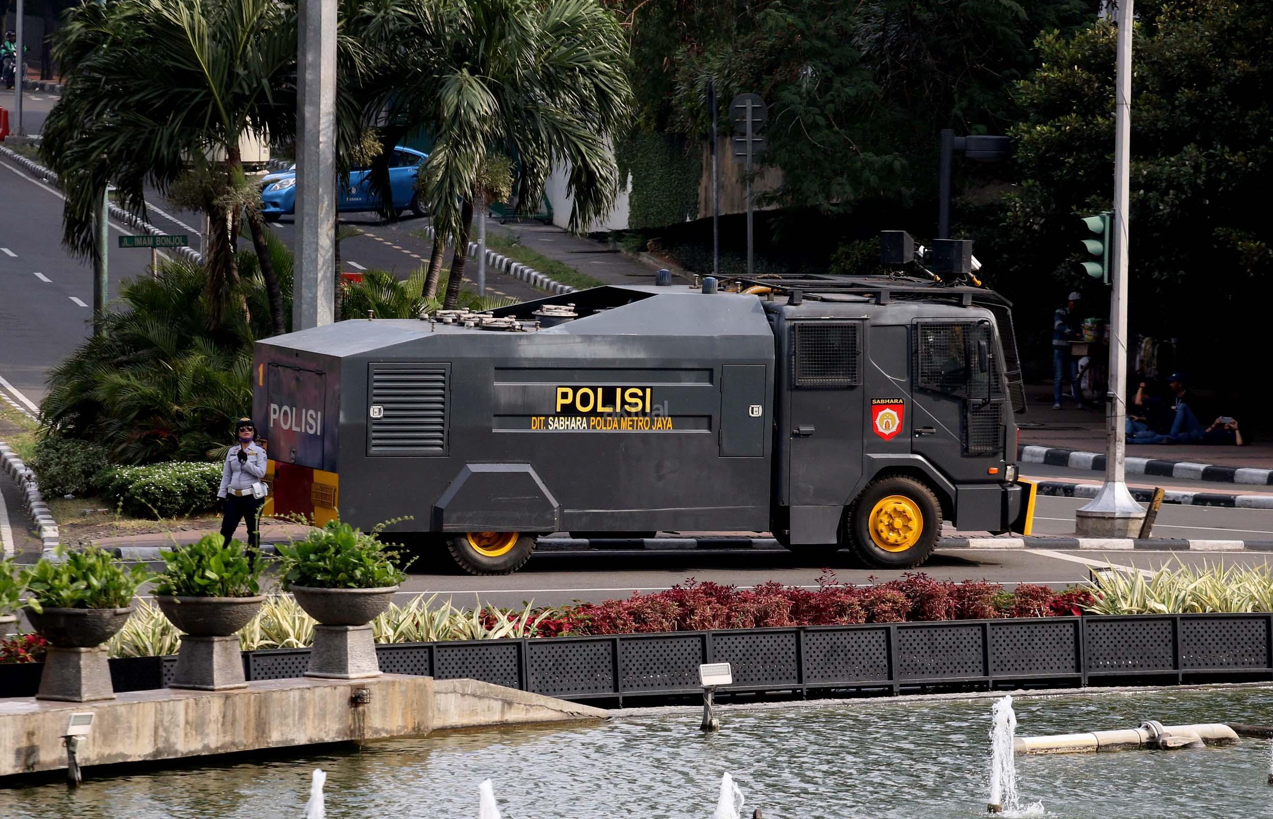 Kendraan taktis Baracuda dan Water Canon milik Kepolisian bersiaga di kawasan Bunderan HI, Jakarta, Sabtu (31/12/2016). Di kawasan Bundaran HI sendiri ada beberapa Baracuda dan Water Canon yang disiagakan untuk menjaga perayaan tahun baru yang dimeriahkan oleh masyarakat Jakarta.