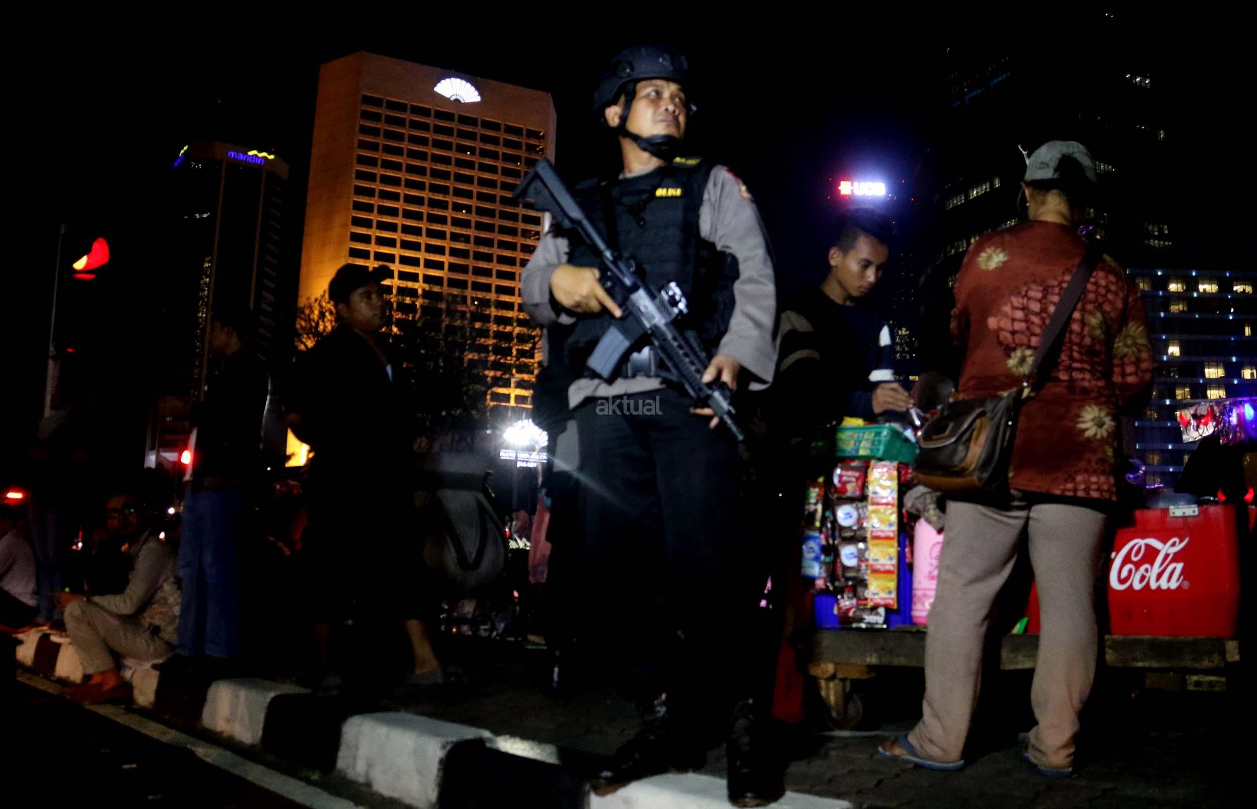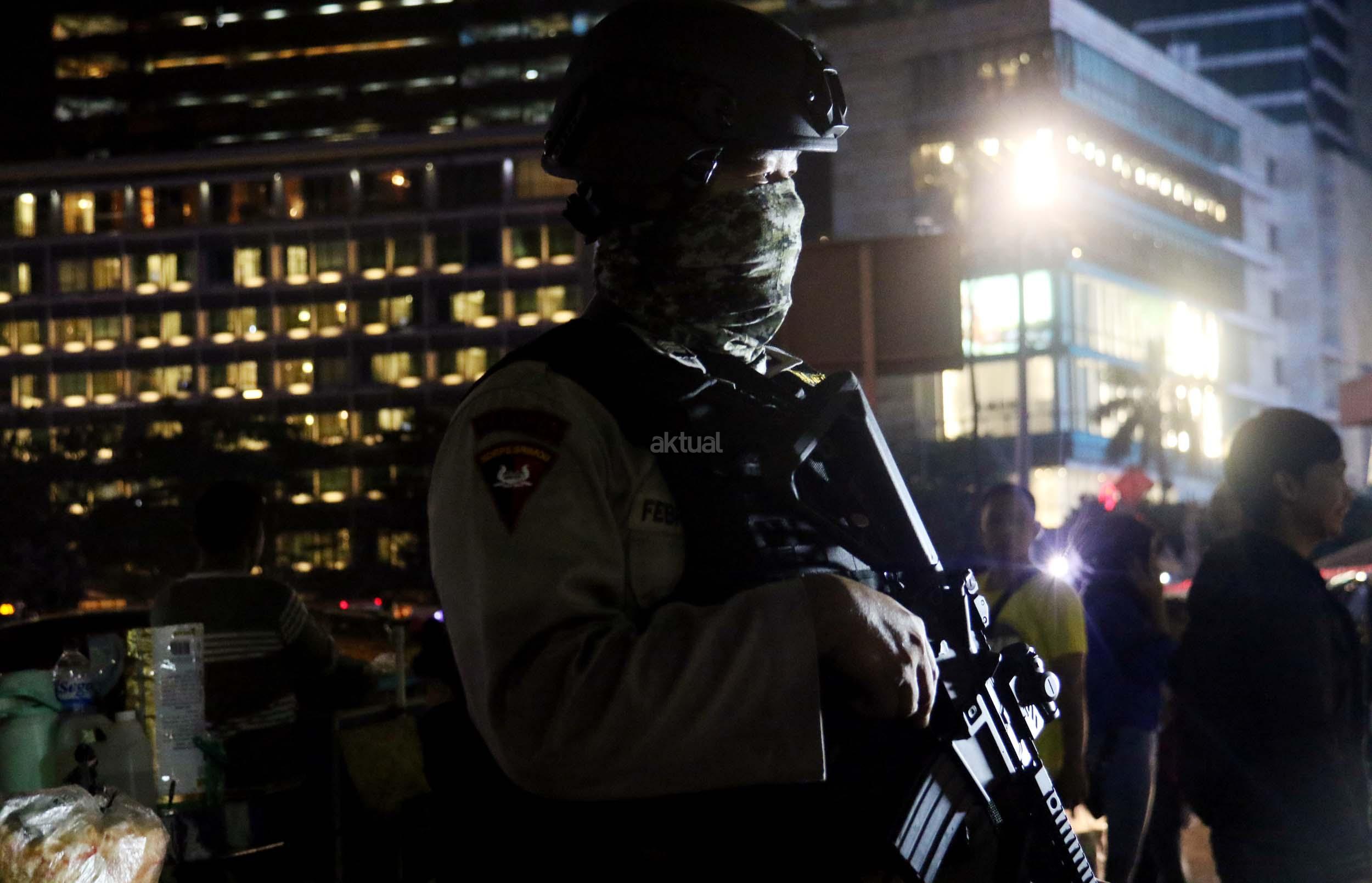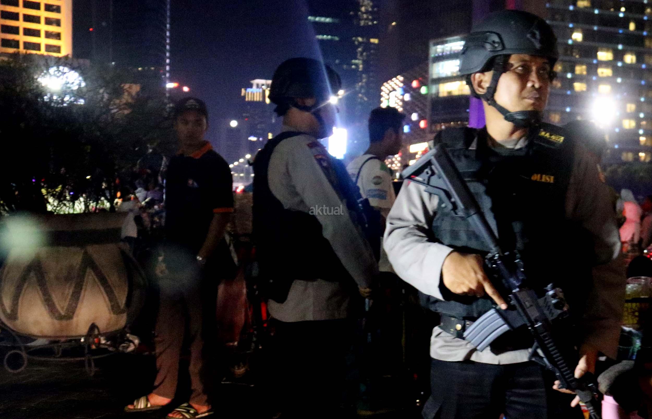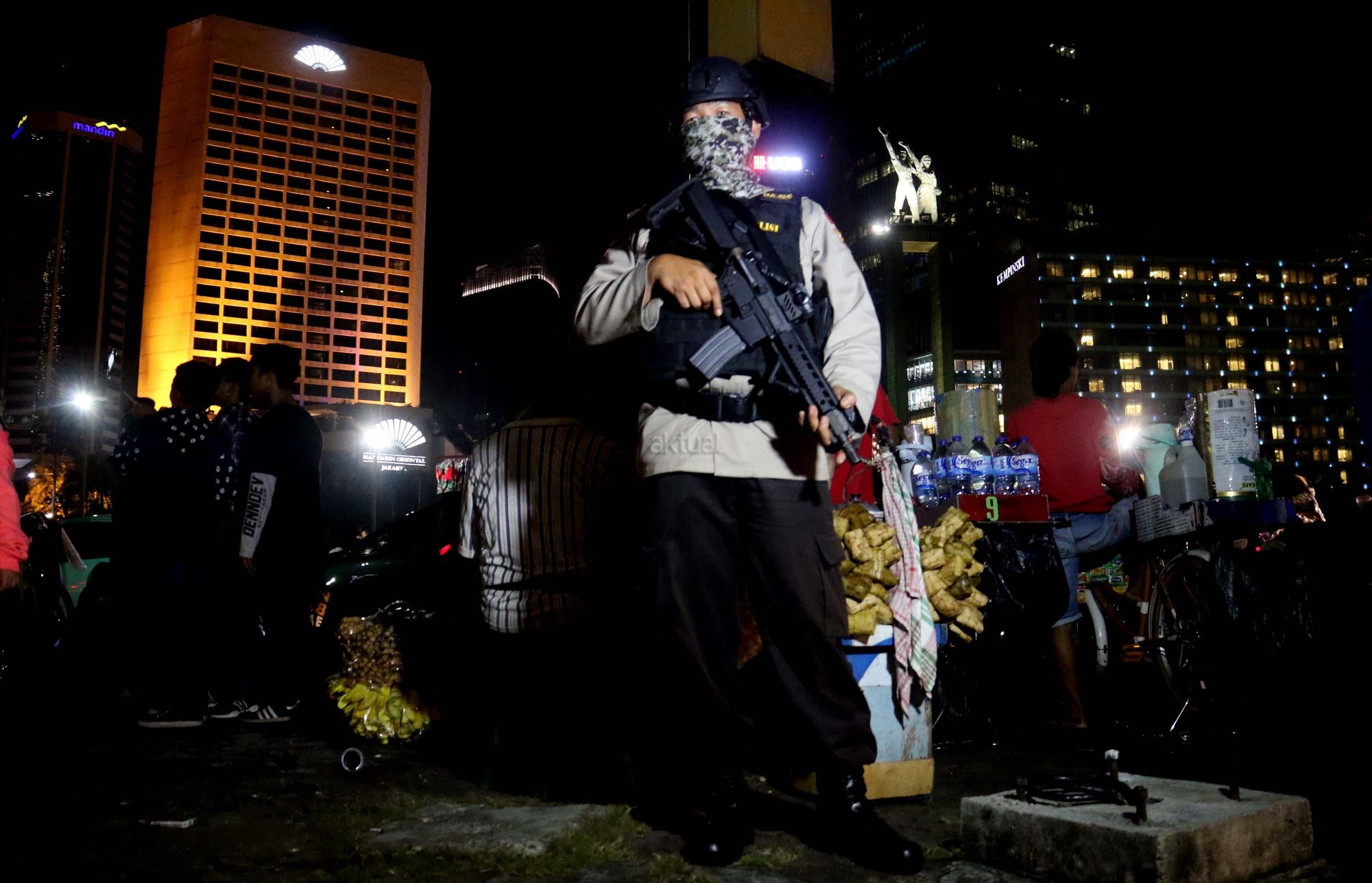 Petugas kepolisian bersenjata lengkap berjaga di kawasan Bundaran HI, Jakarta, Sabtu (31/12/2016). Meski Car Free Night dalam rangka perayaan pergantian tahun dibatalkan oleh Pemerintah Provinsi DKI Jakarta, namun sejumlah anggota Polisi tetap berjaga di sepanjang Sudirman – Thamrin demi menjaga keamanan malam pergantian tahun di Ibukota.