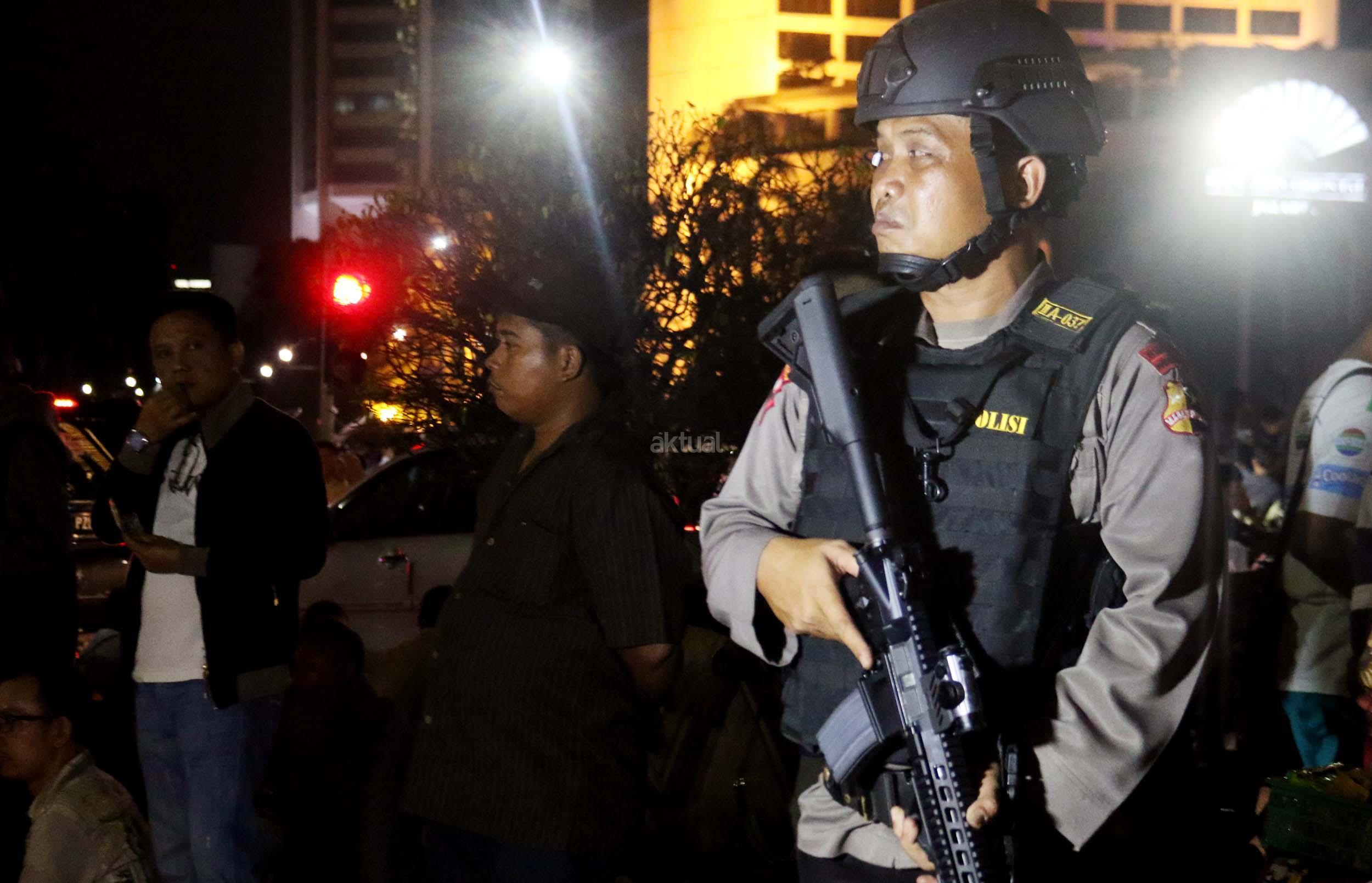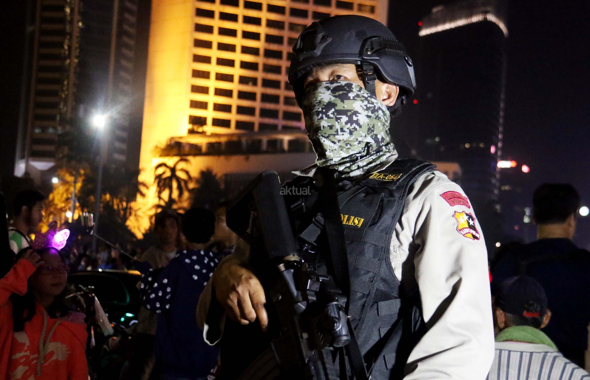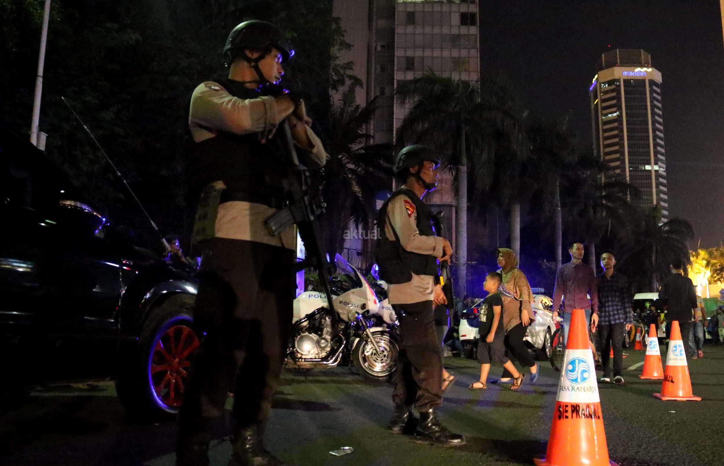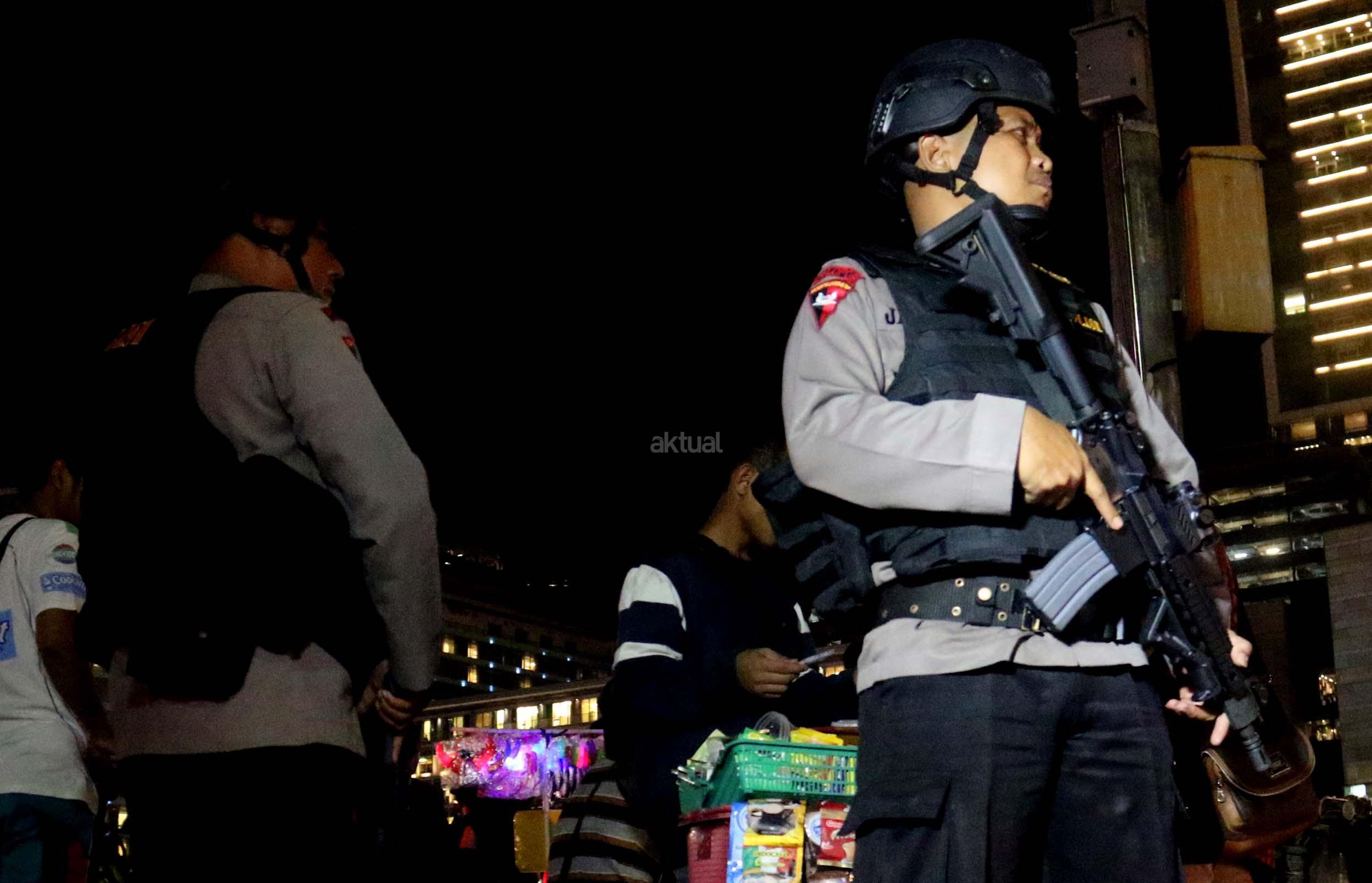 Petugas kepolisian bersenjata lengkap berjaga di kawasan Bundaran HI, Jakarta, Sabtu (31/12/2016). Meski Car Free Night dalam rangka perayaan pergantian tahun dibatalkan oleh Pemerintah Provinsi DKI Jakarta, namun sejumlah anggota Polisi tetap berjaga di sepanjang Sudirman – Thamrin demi menjaga keamanan malam pergantian tahun di Ibukota.