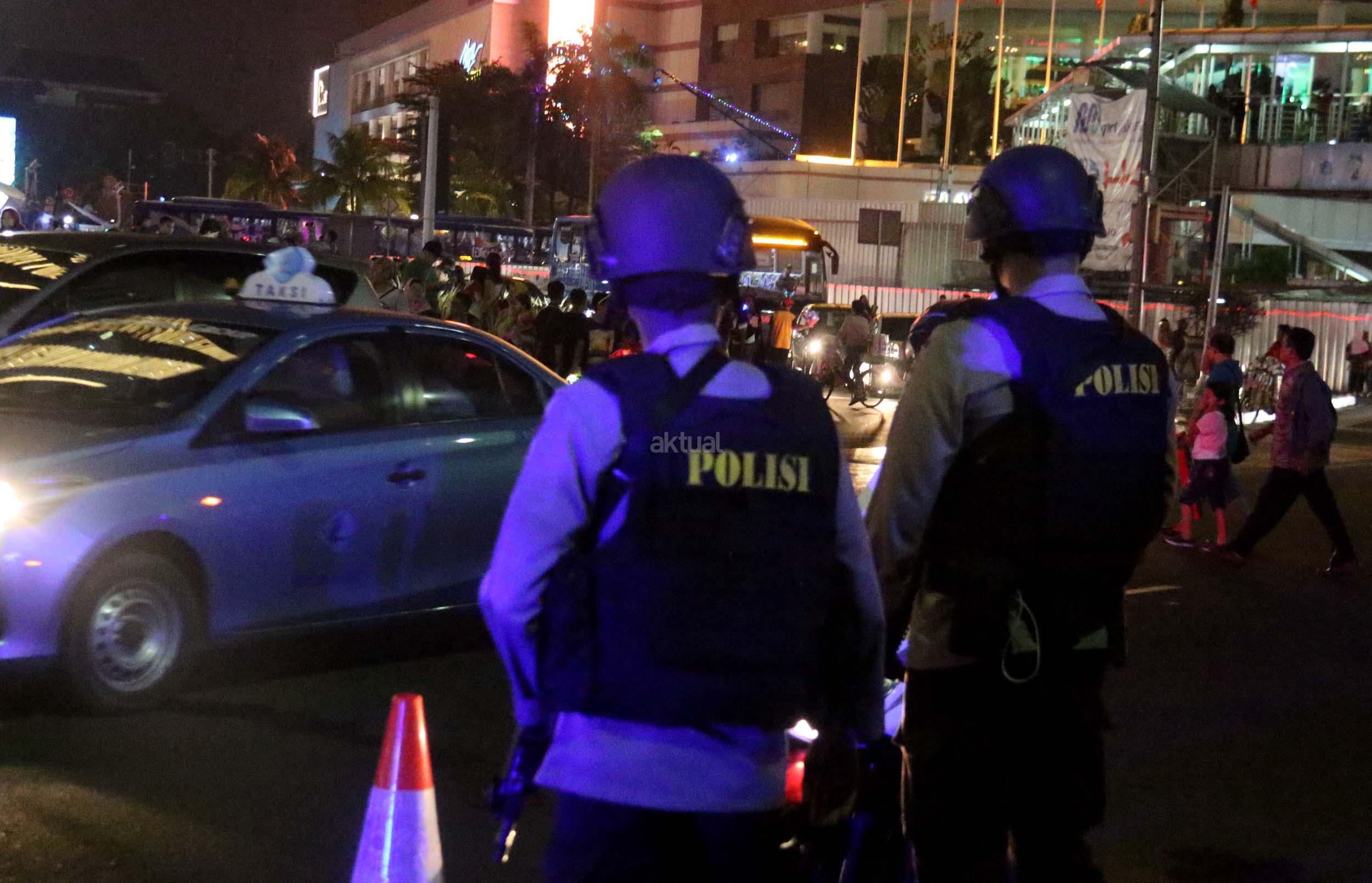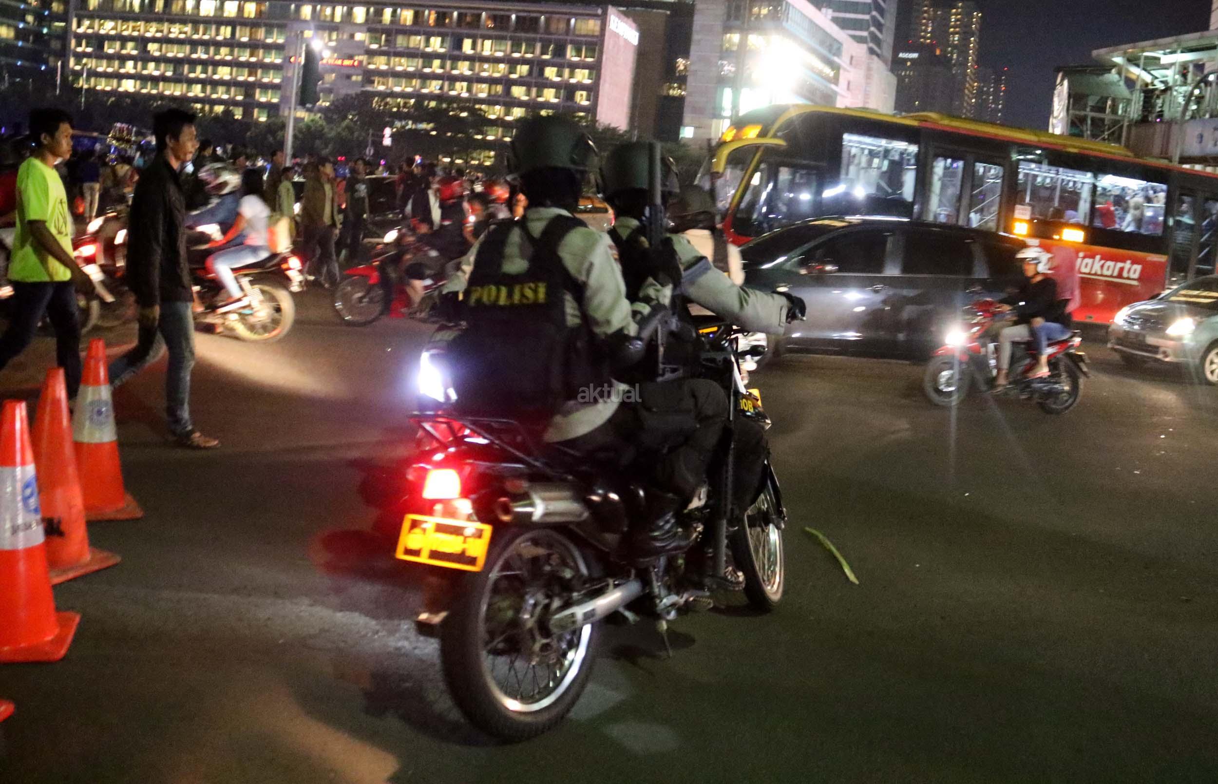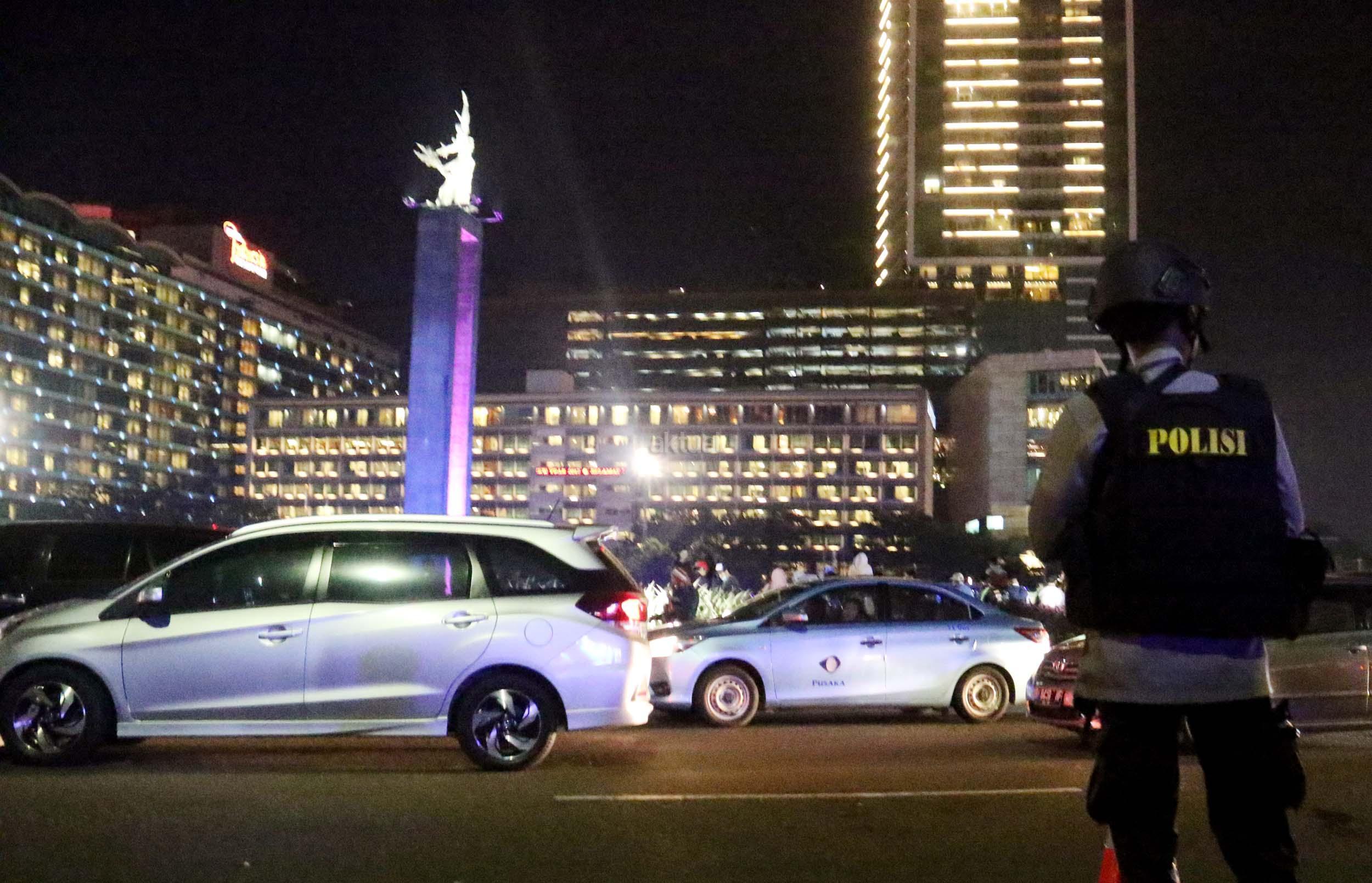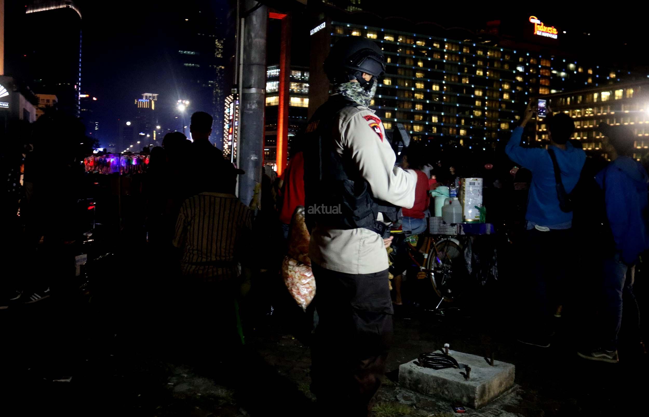 Petugas kepolisian berjaga di kawasan Bundaran HI, Jakarta, Sabtu (31/12/2016). Meski Car Free Night dalam rangka perayaan pergantian tahun dibatalkan oleh Pemerintah Provinsi DKI Jakarta, namun sejumlah anggota Polisi tetap berjaga di sepanjang Sudirman – Thamrin demi menjaga keamanan malam pergantian tahun di Ibukota.