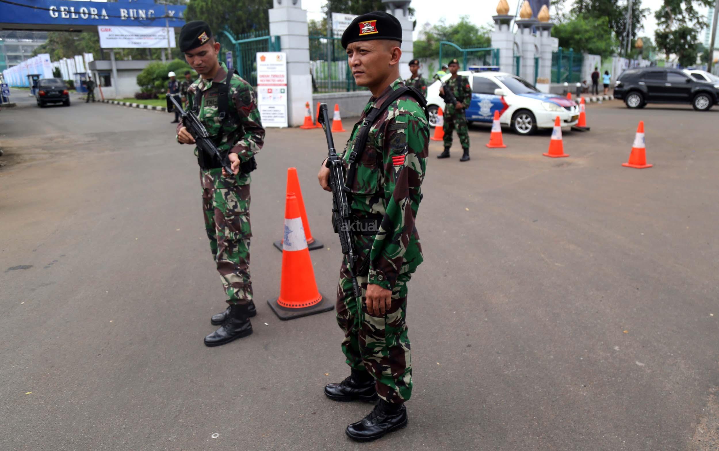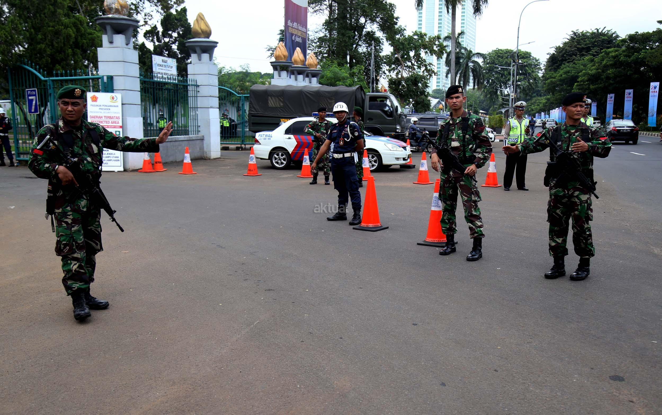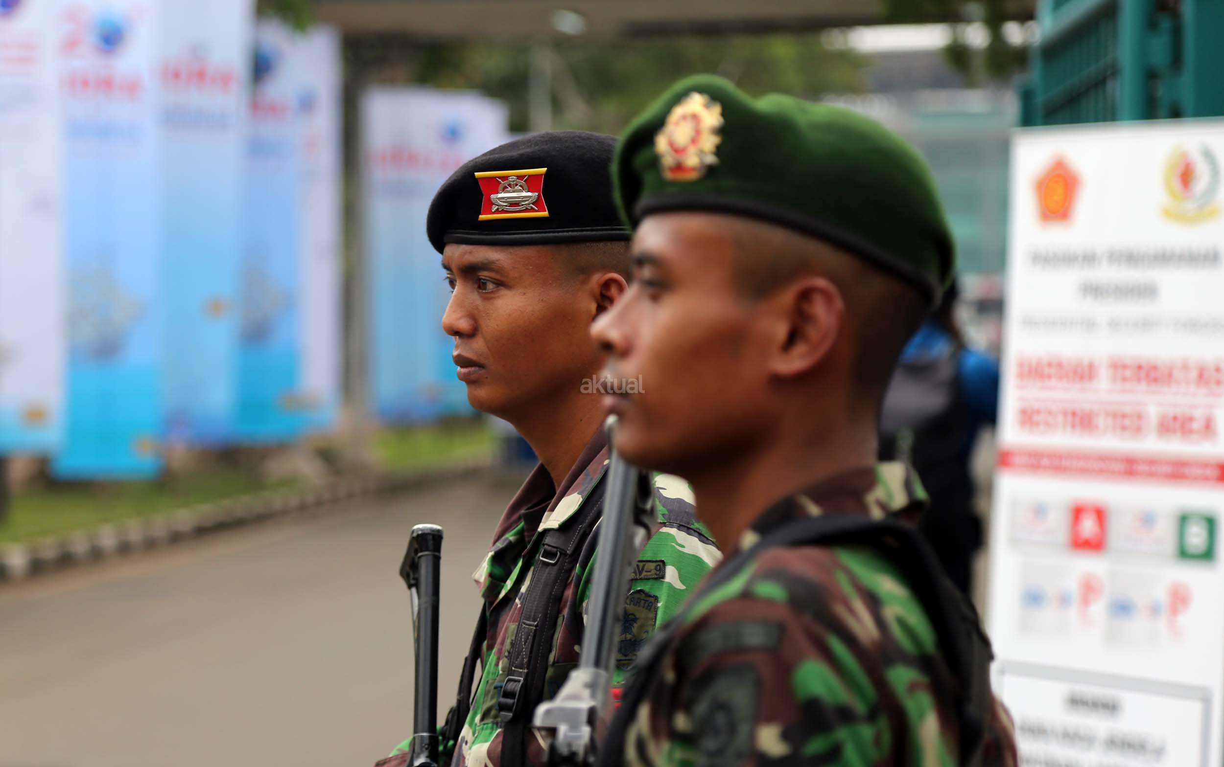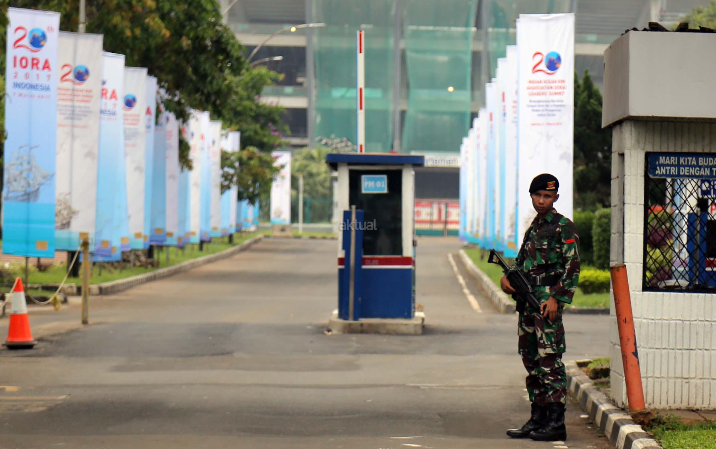 Personel TNI AD melakukan pengamanan di pintu gerbang menuju lokasi pelaksanaan KTT Indian Ocean Rim Association (IORA) ke-20 tahun 2017 di Kompleks Stadion Utama Gelora Bung Karno, Jakarta, Senin (6/3/2017). Sebanyak 12.000 personel gabungan TNI dan Polri disiagakan untuk pengamanan KTT IORA 2017 yang diikuti 21 negara, berlangsung 5-7 Maret 2017. AKTUAL/Munzir