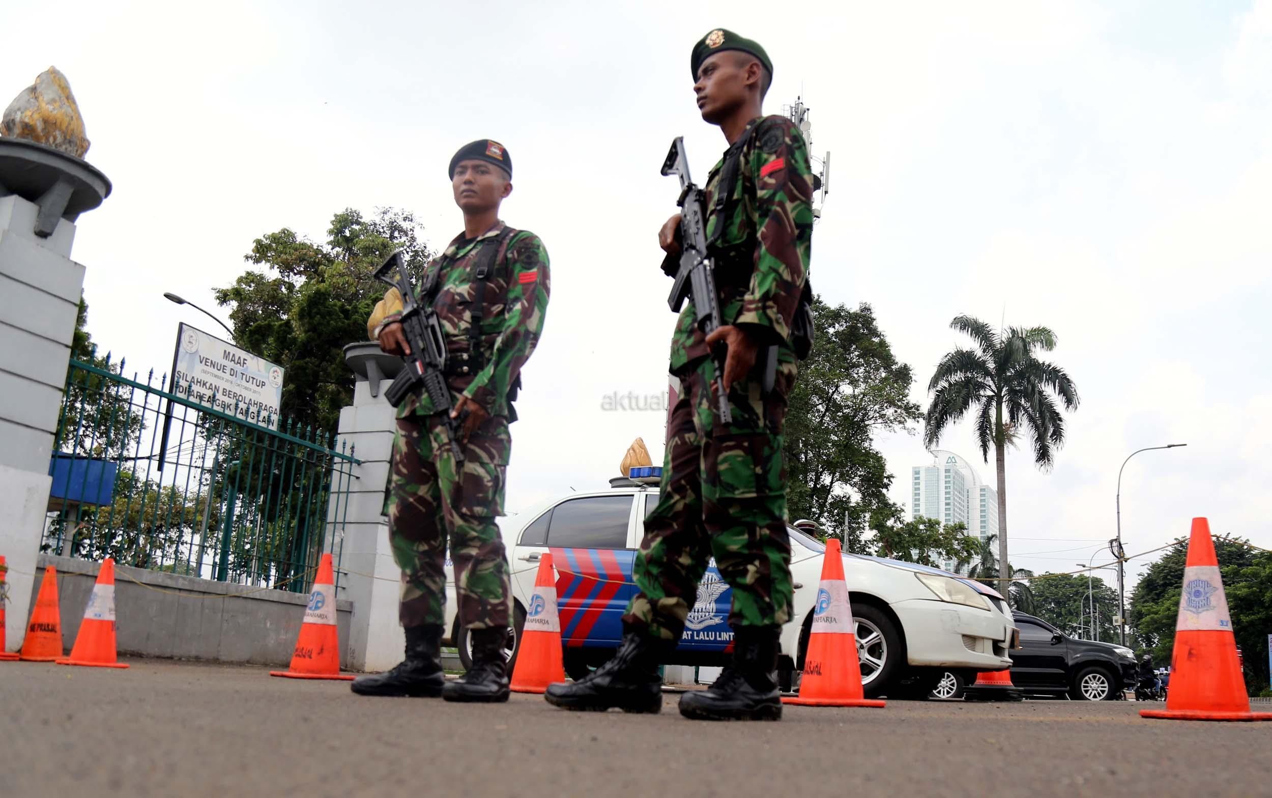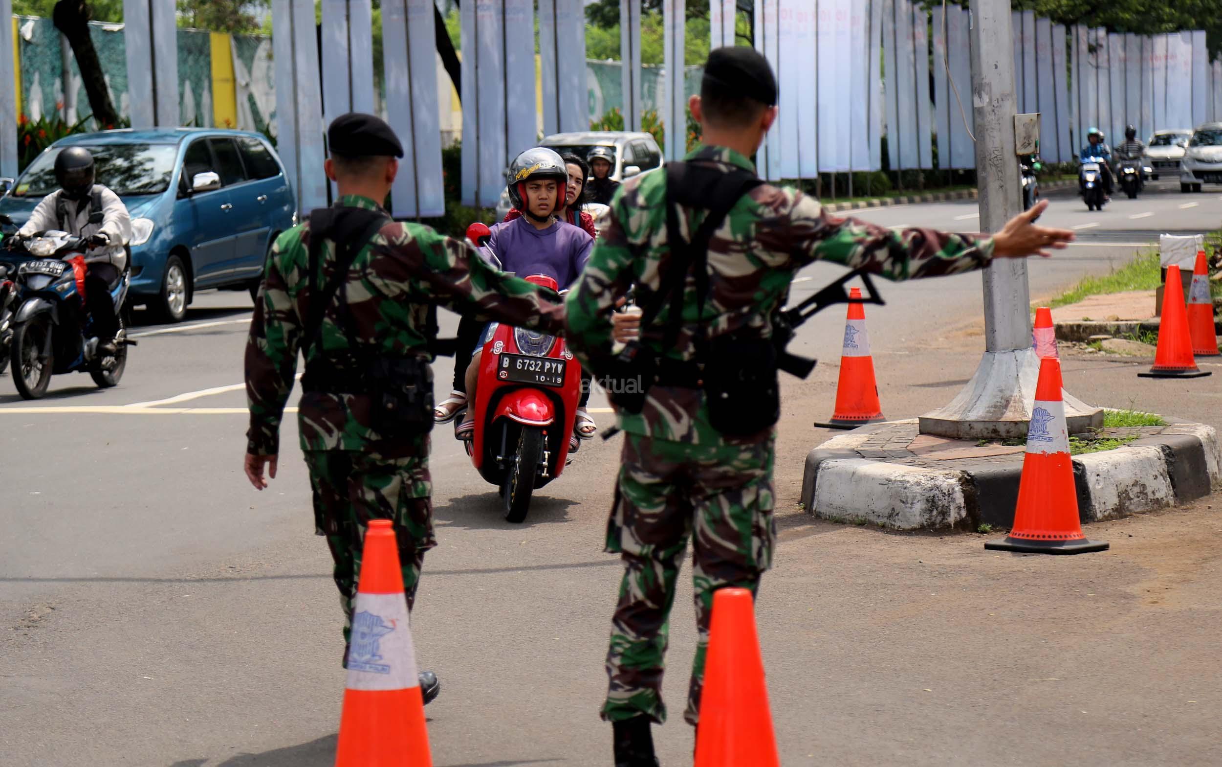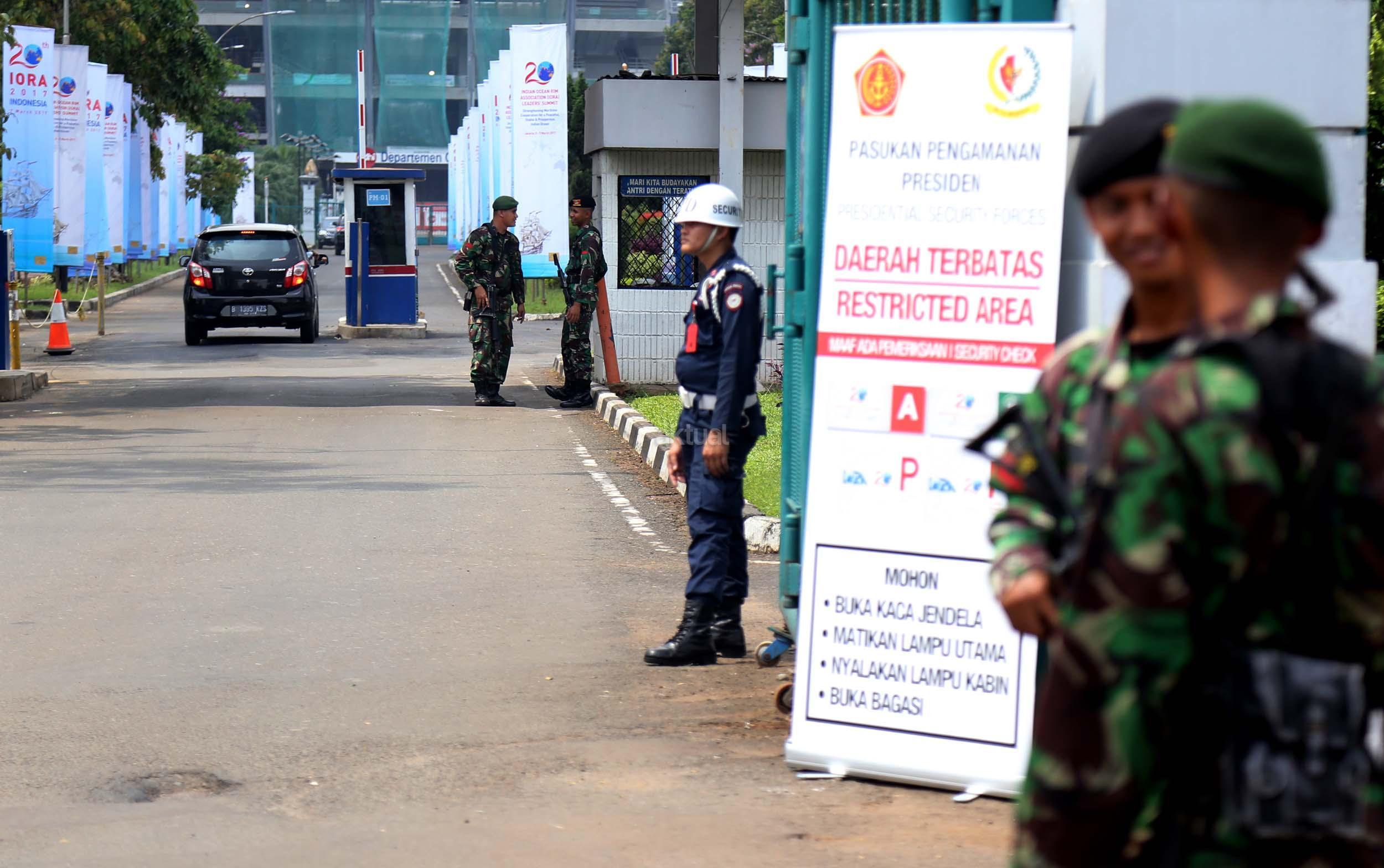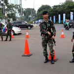 Personel TNI AD melakukan pengamanan di pintu gerbang menuju lokasi pelaksanaan KTT Indian Ocean Rim Association (IORA) ke-20 tahun 2017 di Kompleks Stadion Utama Gelora Bung Karno, Jakarta, Senin (6/3/2017). Sebanyak 12.000 personel gabungan TNI dan Polri disiagakan untuk pengamanan KTT IORA 2017 yang diikuti 21 negara, berlangsung 5-7 Maret 2017. AKTUAL/Munzir