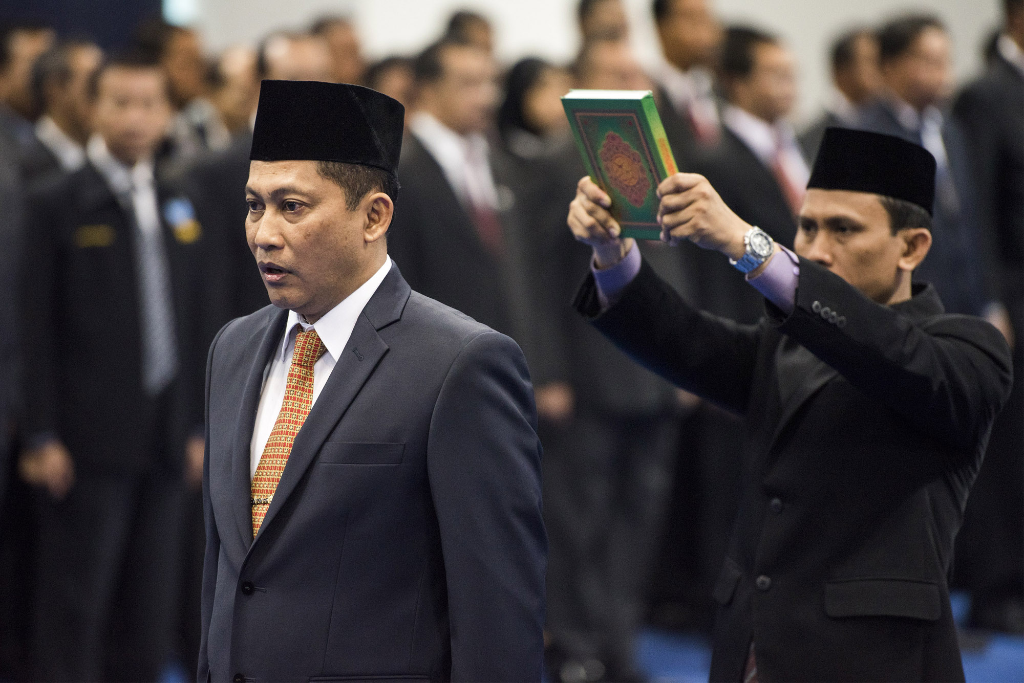 Kepala Badan Narkotika Nasional (BNN) Komjen Pol Budi Waseso (kiri) menerima ucapan selamat seusai upacara pengambilan sumpah jabatan di Kantor BNN, Jakarta, Selasa (8/9). Budi Waseso resmi menjabat sebagai Kepala BNN menggantikan Anang Iskandar yang menjadi Kabareskrim Polri. ANTARA FOTO/M Agung Rajasa/aww/15.