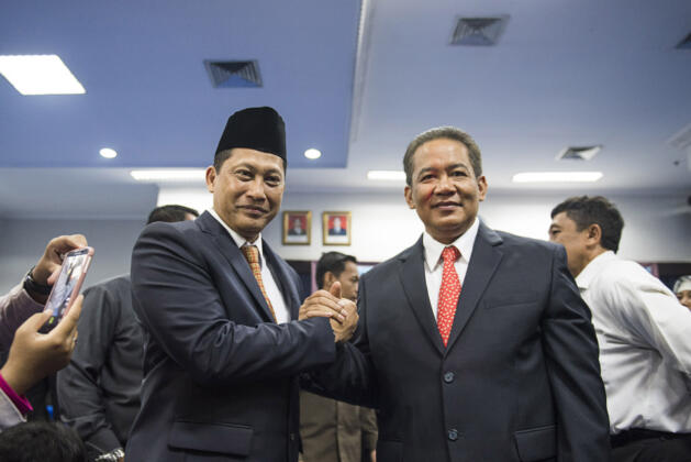 Kepala Badan Narkotika Nasional (BNN) Komjen Pol Budi Waseso (kiri) berjabat tangan ala salam komando dengan Kepala Bareskrim Mabes Polri Komjen Pol Anang Iskandar (kanan) seusai upacara pengambilan sumpah jabatan di Kantor BNN, Jakarta, Selasa (8/9). Budi Waseso resmi menjabat sebagai Kepala BNN menggantikan Anang Iskandar yang menjadi Kabareskrim Polri. ANTARA FOTO/M Agung Rajasa/aww/15.