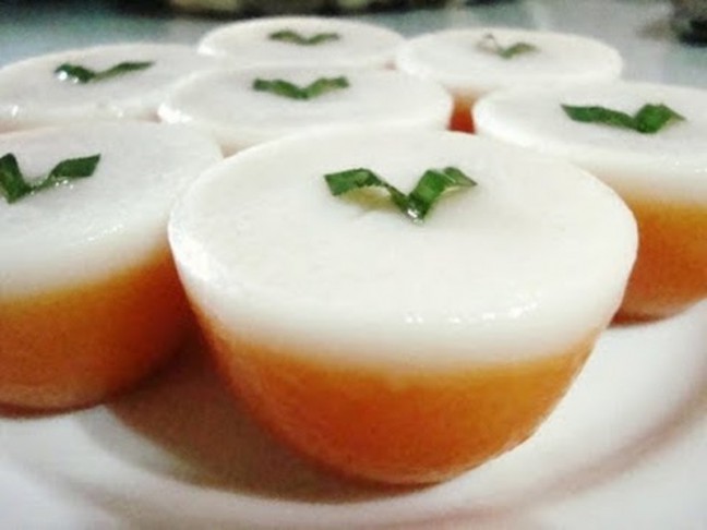 4. Tuang satu lapis adonan cokelat ke dalam cetakan mangkok kue talam, kukus selama 10 menit. Tuang adonan adonan putih di atasnya, kukus lagi selama 10 menit. Angkat, keluarkan kue talam dari cetakan, sajikan.