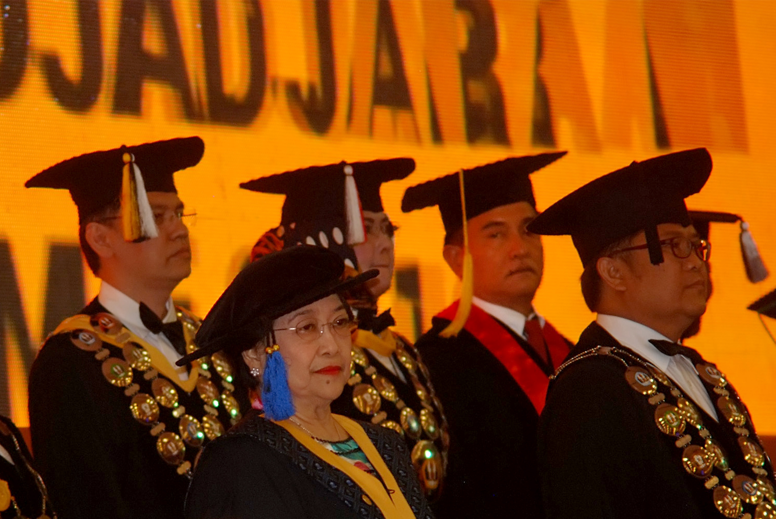 Ketum Partai Demokrasi Indonesia-Perjuangan (PDIP) Megawati Soekarnoputri (tengah) mengikuti prosesi Penganugerahan Gelar Doktor Honoris Causa (Dr.H.C) Megawati Soekarnoputri Bidang Politik dan Pemerintahan di Kampus Unpad, Bandung, Jawa Barat, Rabu (25/5). Universitas Padjadjaran (Unpad) memberikan gelar DHC kepada Megawati atas pemikiran, prestasi, dan jasa-jasanya terhadap negara dan luar negeri di bidang politik serta pemerintahan. ANTARA FOTO/Fahrul Jayadiputra/foc/16.