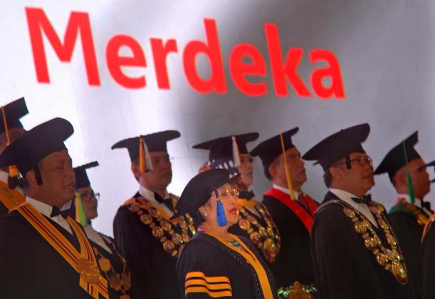 Ketum Partai Demokrasi Indonesia-Perjuangan (PDIP) Megawati Soekarnoputri (tengah) menyanyikan lagu Indonesia Raya saat mengikuti prosesi Penganugerahan Gelar Doktor Honoris Causa (Dr.H.C) Megawati Soekarnoputri Bidang Politik dan Pemerintahan di Kampus Unpad, Bandung, Jawa Barat, Rabu (25/5). Universitas Padjadjaran (Unpad) memberikan gelar DHC kepada Megawati atas pemikiran, prestasi, dan jasa-jasanya terhadap negara dan luar negeri di bidang politik serta pemerintahan. ANTARA FOTO/Fahrul Jayadiputra/foc/16.