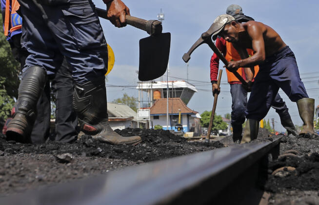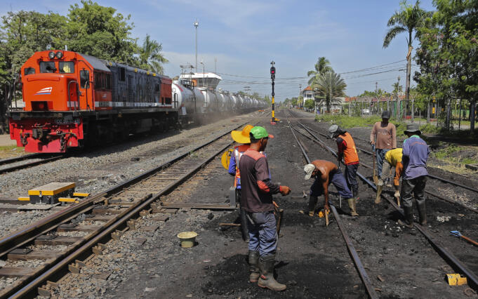 Sejumlah petugas memperbaiki rel kereta api di Stasiun Kertapati, Palembang, Sumatera Selatan, Selasa (21/6). Perbaikan dan pengecekan kondisi rel digelar PT KAI Drive III Sumsel guna meningkatkan keamanan serta kenyamanan pengguna jasa kereta api, terutama menjelang peningkatan arus mudik/balik Lebaran 2016. ANTARA FOTO/Nova Wahyudi/foc/16.