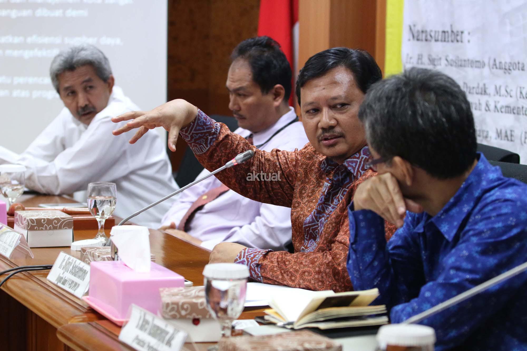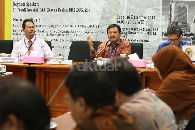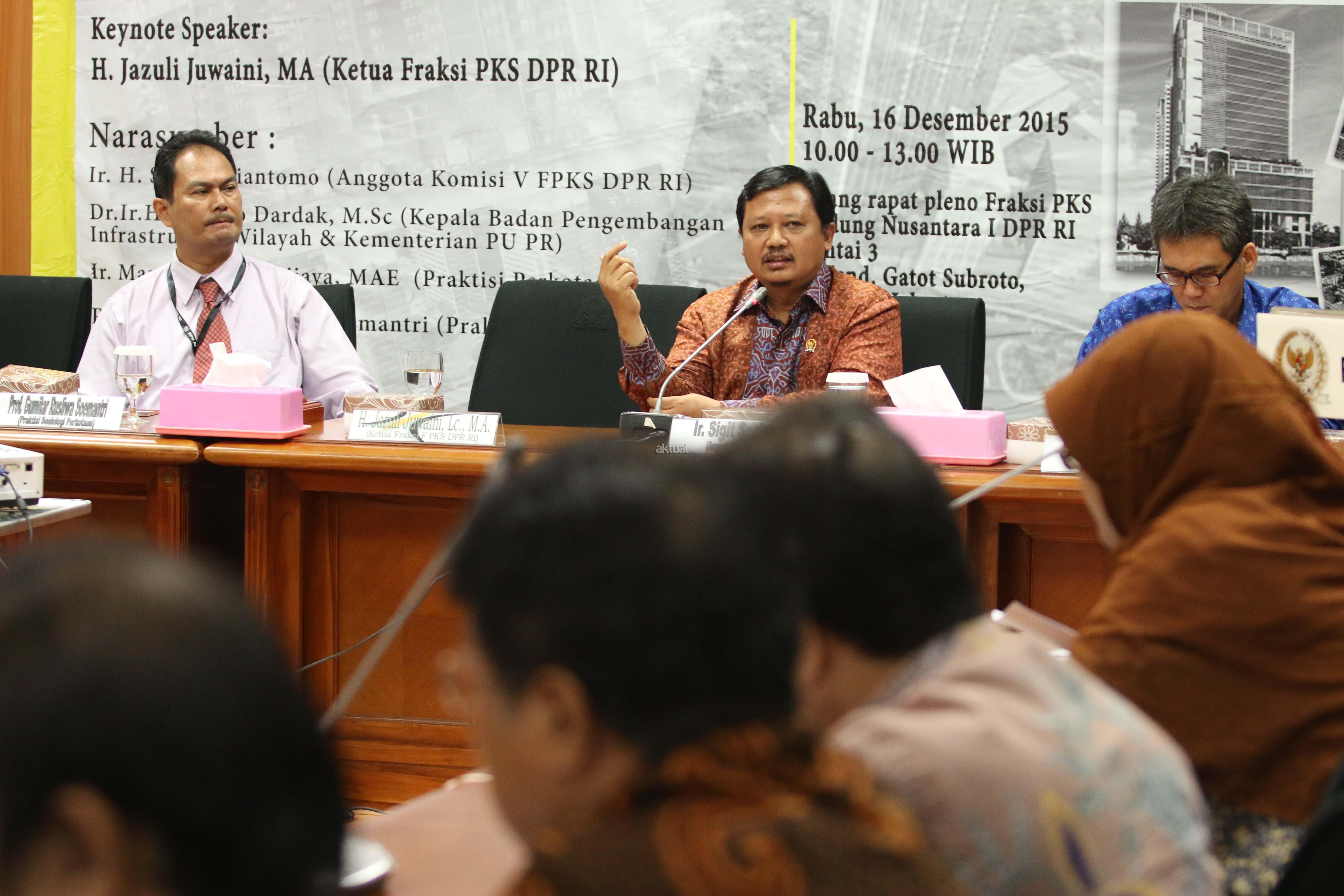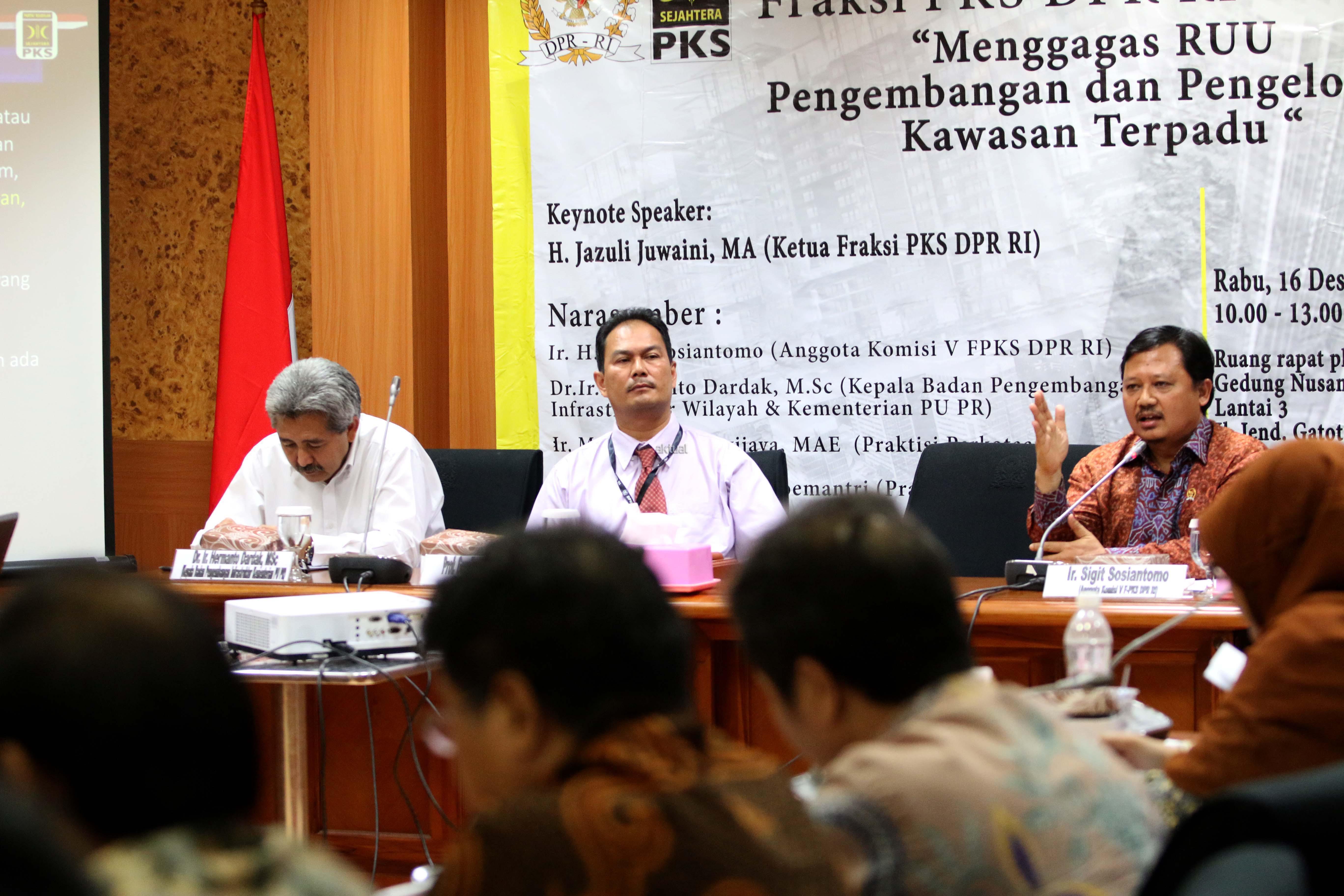 Anggota Komisi V DPR RI, Sigit Sosiantomo (kanan) bersama dari kiri, Kepala Badan Pengembangan Infrastruktur Wilayah Kementerian PUPR, Hermanto Dardak, Guru Besar Departemen Sosiologi FISIP UI, Gumilar Rusliwa Somantri menjadi pembicara pada Diskusi bertema "Menggagas RUU Pengembangan dan Pengelolaan Kawasan Terpadu" di Ruang Rapat Pleno PKS di Komplek Parlemen Senayan, Rabu (16/12). Pesatnya arus urbanisasi di kota-kota besar, meniscayakan kehadiran kawasan untuk pemukiman, perdagangan, perkantoran, pendidikan dan rekreasi dalam satu wilayah khusus (Superblok). Konsep ini, idealnya,dapat berdampak signifikan terhadap penurunan tingkat polusi udara, juga mewujudkan ruang kehidupan yang layak bagi masyarakat yang tinggal di perkotaan. AKTUAL/HO