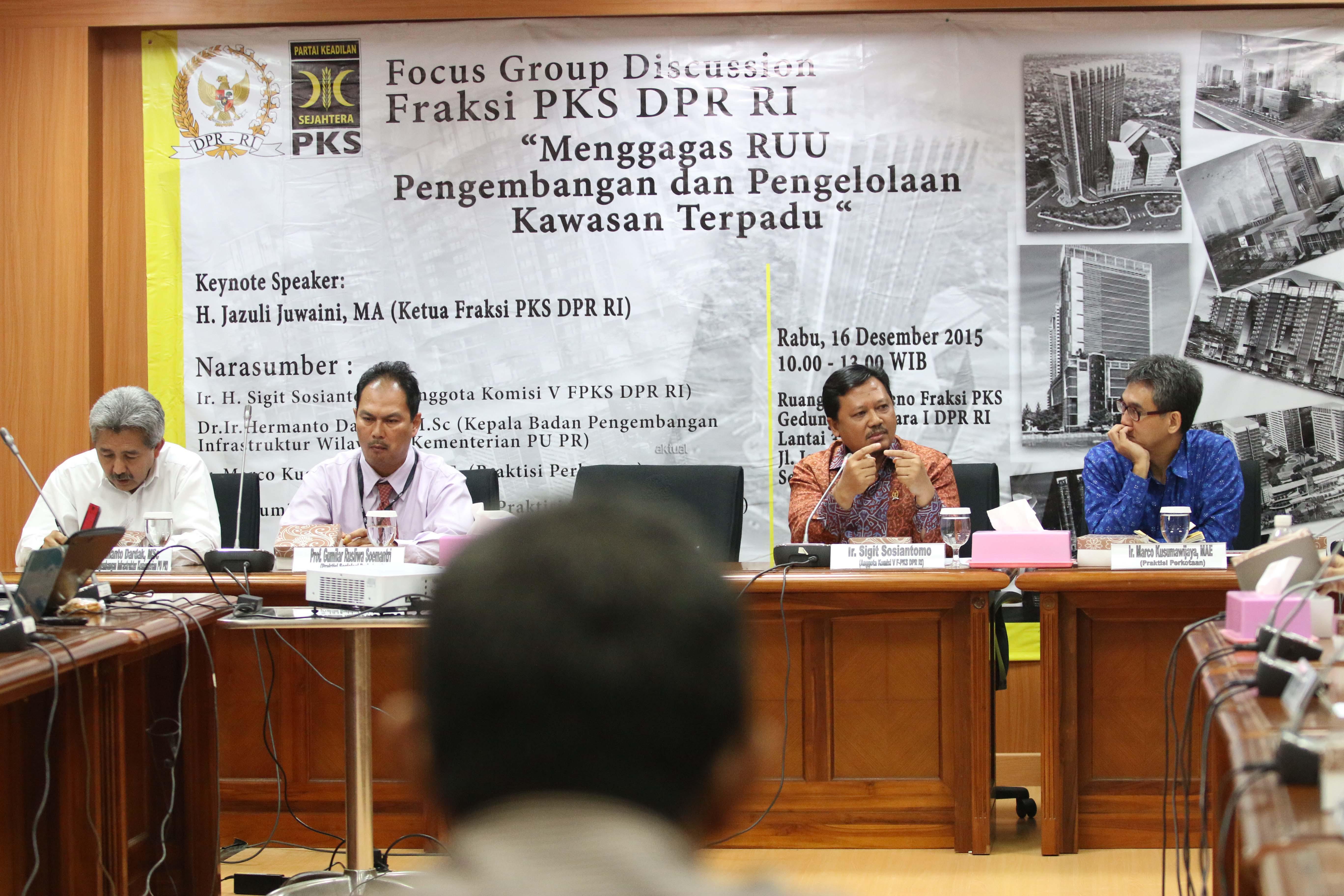 Anggota Komisi V DPR RI, Sigit Sosiantomo (kedua kanan) bersama dari kiri, Kepala Badan Pengembangan Infrastruktur Wilayah Kementerian PUPR, Hermanto Dardak, Guru Besar Departemen Sosiologi FISIP UI, Gumilar Rusliwa Somantri dan Aktivis dan pengamat perkotaan, Marco Kusumawijaya menjadi pembicara pada Diskusi bertema "Menggagas RUU Pengembangan dan Pengelolaan Kawasan Terpadu" di Ruang Rapat Pleno PKS di Komplek Parlemen Senayan, Rabu (16/12). Pesatnya arus urbanisasi di kota-kota besar, meniscayakan kehadiran kawasan untuk pemukiman, perdagangan, perkantoran, pendidikan dan rekreasi dalam satu wilayah khusus (Superblok). Konsep ini, idealnya,dapat berdampak signifikan terhadap penurunan tingkat polusi udara, juga mewujudkan ruang kehidupan yang layak bagi masyarakat yang tinggal di perkotaan. AKTUAL/HO