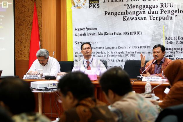 Anggota Komisi V DPR RI, Sigit Sosiantomo (tengah) bersama Guru Besar Departemen Sosiologi FISIP UI, Gumilar Rusliwa Somantri (kiri) dan Aktivis dan pengamat perkotaan, Marco Kusumawijaya menjadi pembicara pada Diskusi bertema "Menggagas RUU Pengembangan dan Pengelolaan Kawasan Terpadu" di Ruang Rapat Pleno PKS di Komplek Parlemen Senayan, Rabu (16/12). Pesatnya arus urbanisasi di kota-kota besar, meniscayakan kehadiran kawasan untuk pemukiman, perdagangan, perkantoran, pendidikan dan rekreasi dalam satu wilayah khusus (Superblok). Konsep ini, idealnya,dapat berdampak signifikan terhadap penurunan tingkat polusi udara, juga mewujudkan ruang kehidupan yang layak bagi masyarakat yang tinggal di perkotaan. AKTUAL/HO
