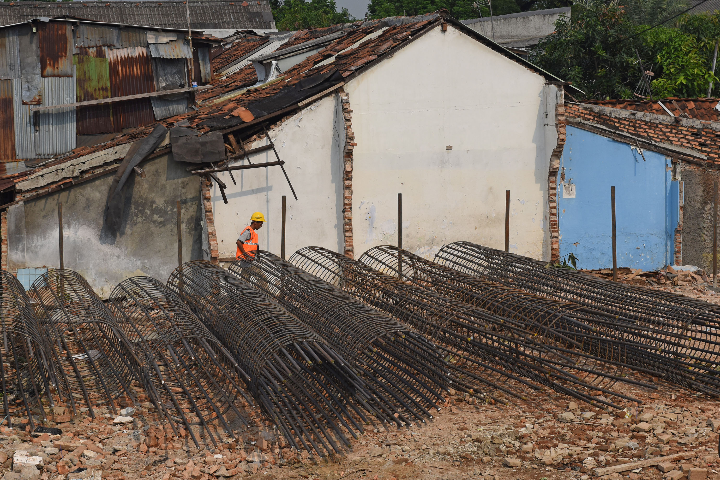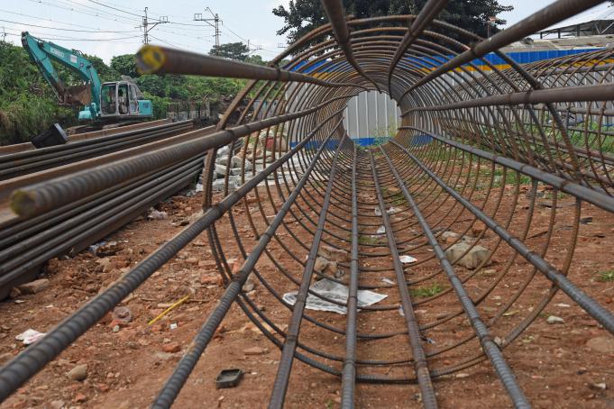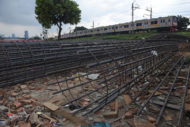 Seorang pekerja melintasi pondasi besi yang disiapkan untuk proyek pembangunan pengerjaan rel ganda Manggarai-Jatinegara di Manggarai, Jakarta, Rabu (1/6). Pengerjaan proyek rel ganda Manggarai-Jatinegara yang terbagi dalam lima paket senilai Rp 363,26 miliar untuk meningkatkan pelayanan PT KAI itu ditargetkan selesai pada desember 2017. ANTARA FOTO/Wahyu Putro A/ama/16