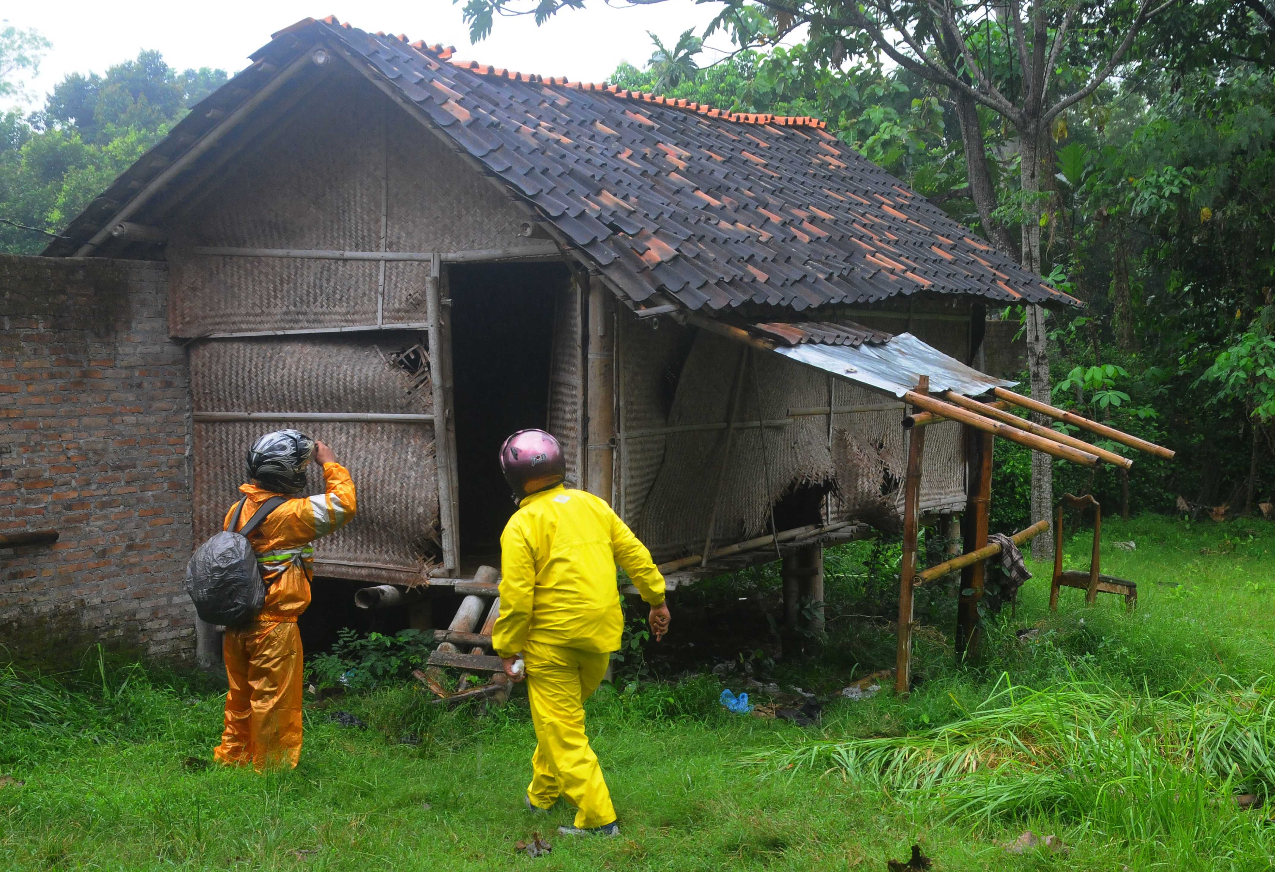Dua orang warga melihat sebuah gubuk yang diduga untuk tempat tinggal Nur Rohman pasca olah TKP disebuah kandang peternakan ayam di Gedong Jetis, Tulung, Klaten, Jawa Tengah, Selasa (26/7). Densus 88 melakukan olah TKP di sebuah area kandang peternakan ayam yang diduga sebagai tempat tinggal Nur Rohman, untuk pengembangan terduga jaringan terorisme Nur Rohman pelaku kasus bom bunuh diri di Mapolresta Solo beberapa waktu lalu. ANTARA FOTO/ Aloysius Jarot Nugroho/foc/16.