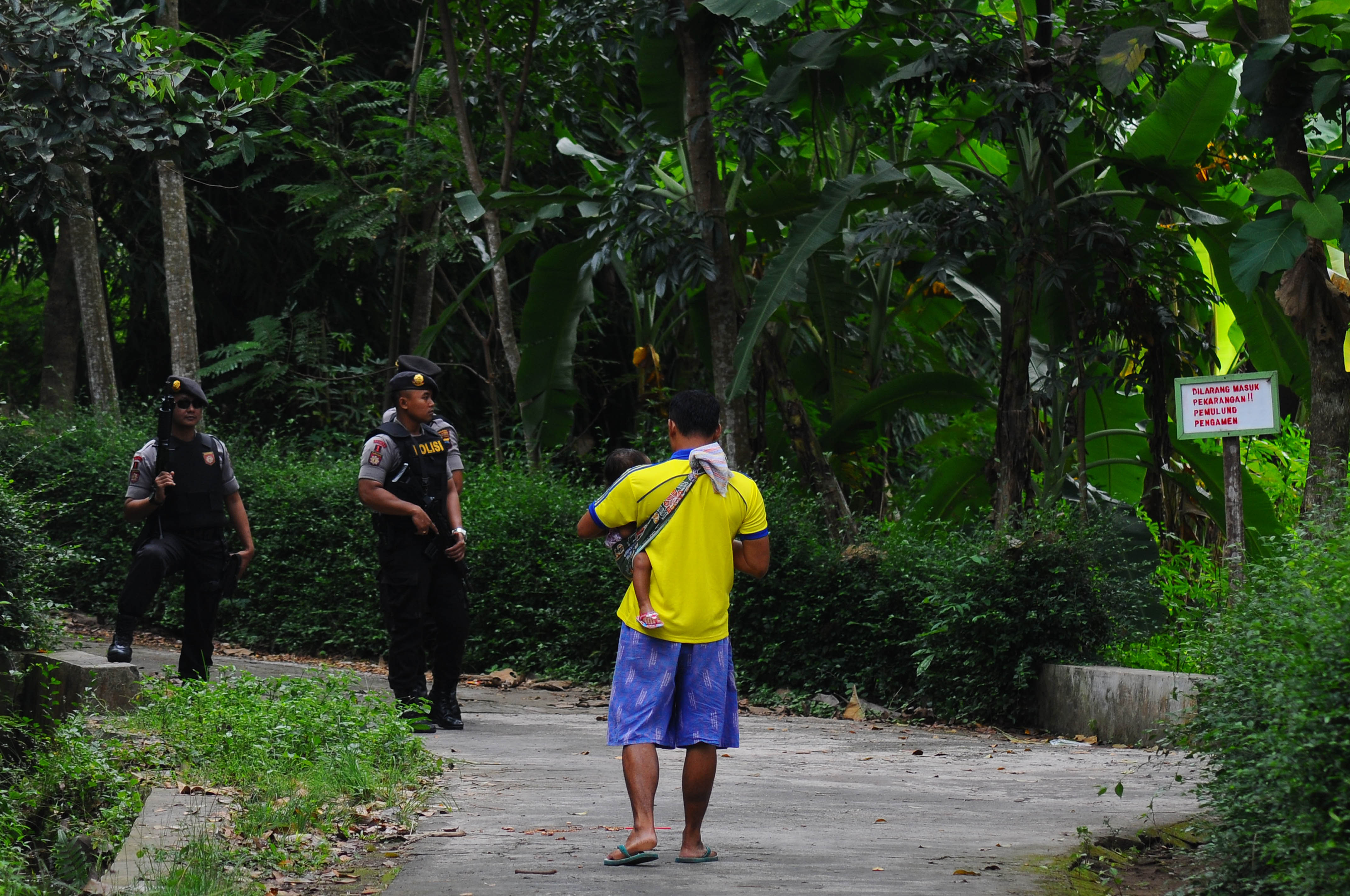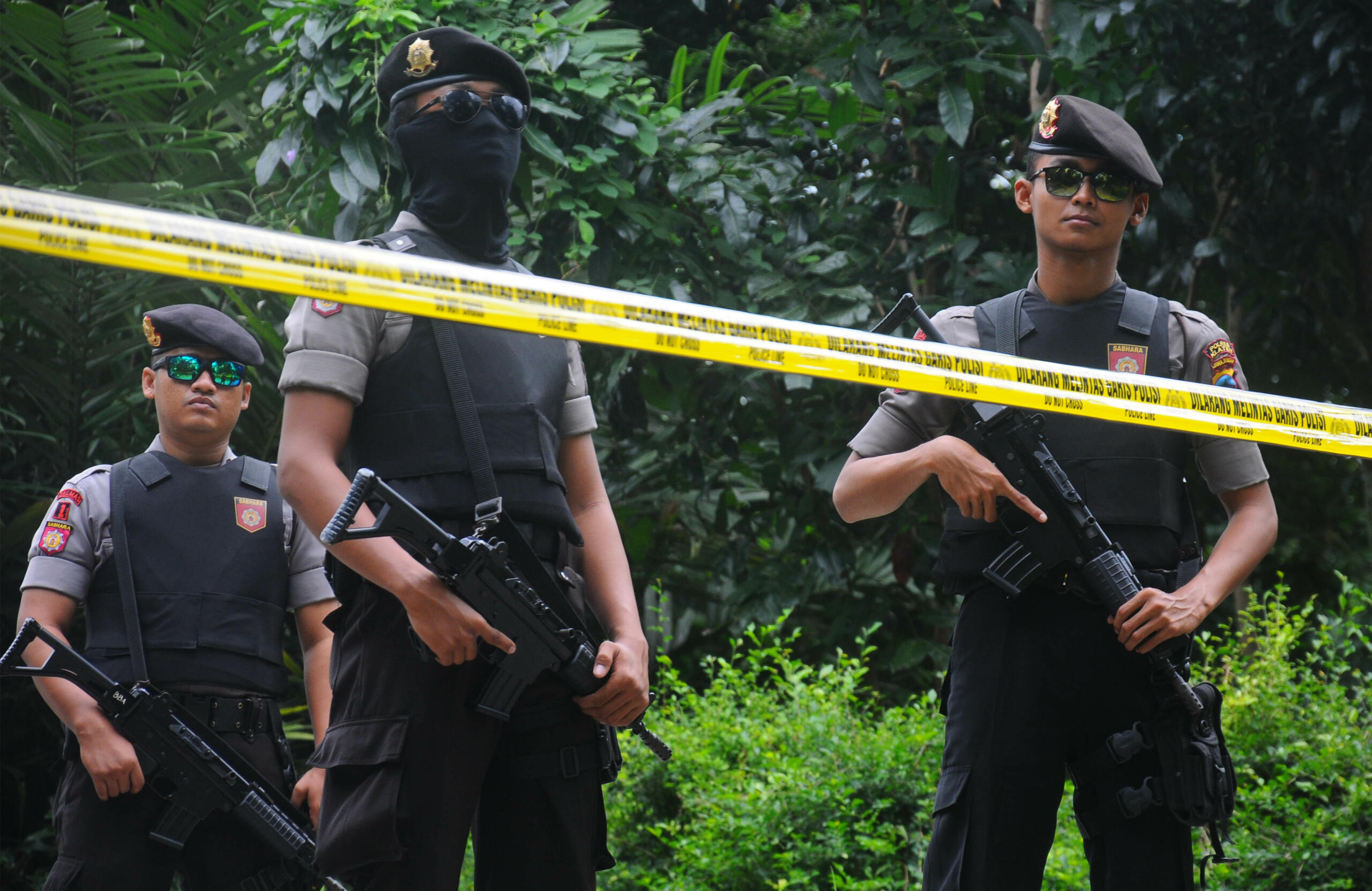 Seorang anggota polisi Sabhara lengkap dengan senjata berjaga saat mengawal olah TKP di sebuah kandang peternakan ayam milik terduga anggota jaringan Nur Rohman di Gedong Jetis, Tulung, Klaten, Jawa Tengah, Selasa (26/7). Densus 88 melakukan olah TKP di sebuah area kandang peternakan ayam yang diduga sebagai tempat tinggal Nur Rohman, untuk pengembangan terduga jaringan terorisme Nur Rohman pelaku kasus bom bunuh diri di Mapolresta Solo beberapa waktu lalu. ANTARA FOTO/ Aloysius Jarot Nugroho/foc/16.