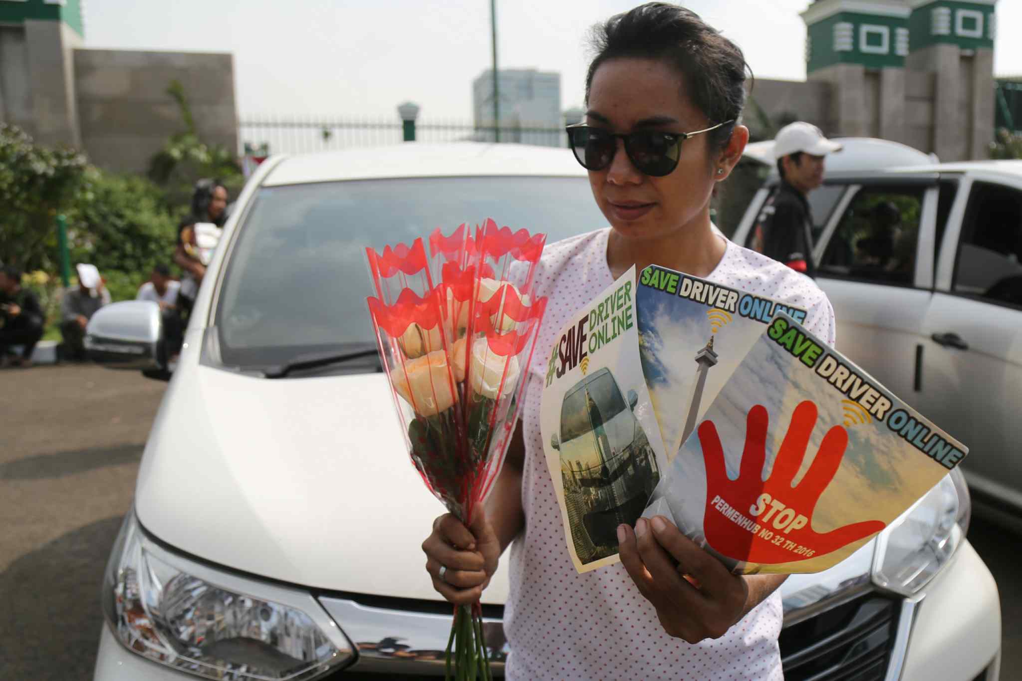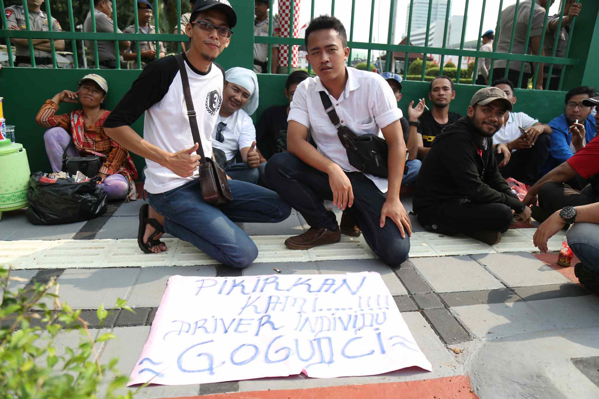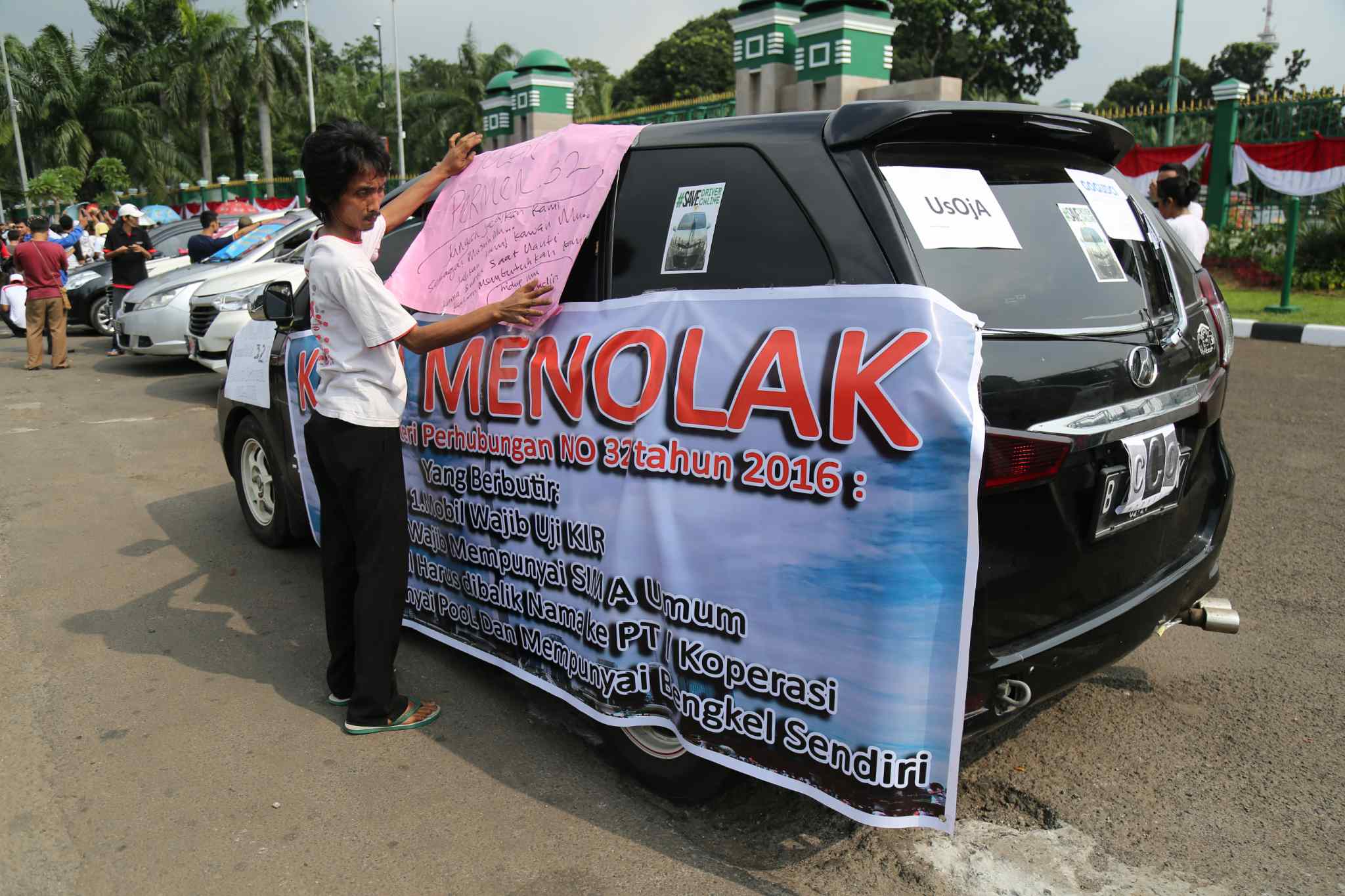 Sejumlah pengedara taksi online melakukan aksi di depan gedung DPR, Jakarta, Senin (22/8). Mereka menuntut untuk mencabut Peraturan Menteri Perhubungan (Permenhub) Nomor 32 Tahun 2016 tentang Penyelenggaraan Angkutan Orang dengan Kendaraan Bermotor Umum Tidak dalam Trayek. AKTUAL/TINO OKTAVIANO