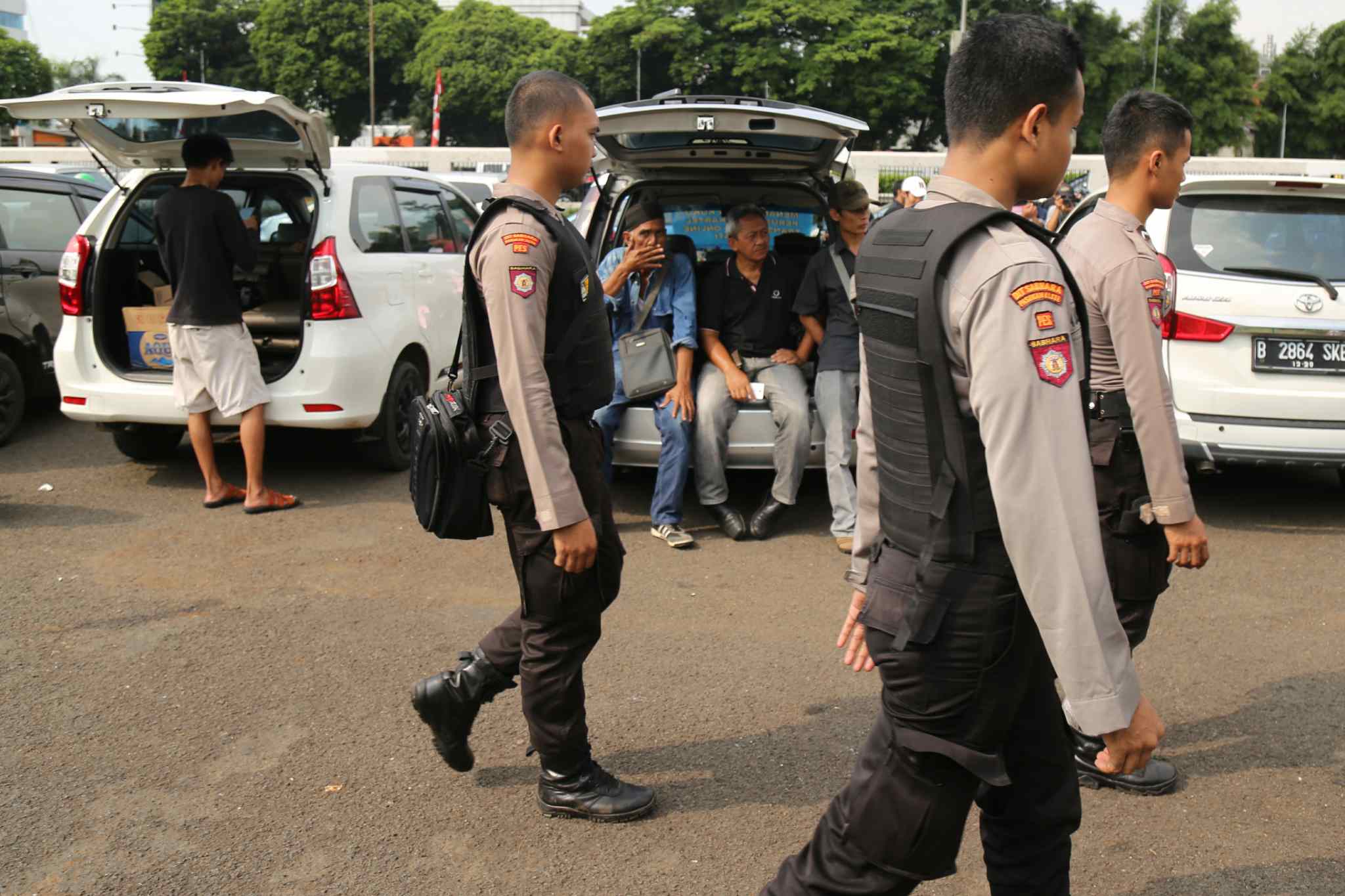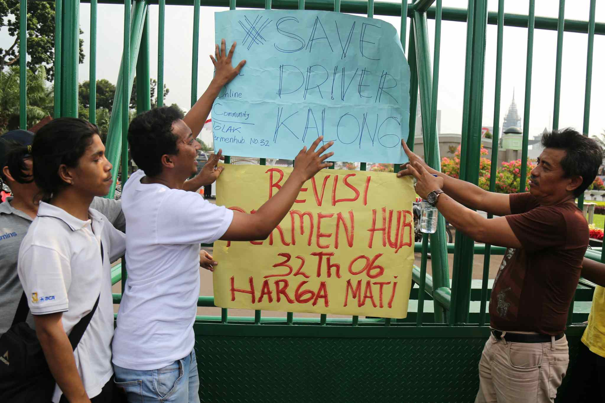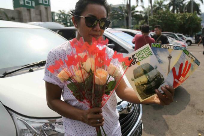 Sejumlah pengedara taksi online melakukan aksi di depan gedung DPR, Jakarta, Senin (22/8). Mereka menuntut untuk mencabut Peraturan Menteri Perhubungan (Permenhub) Nomor 32 Tahun 2016 tentang Penyelenggaraan Angkutan Orang dengan Kendaraan Bermotor Umum Tidak dalam Trayek. AKTUAL/TINO OKTAVIANO
