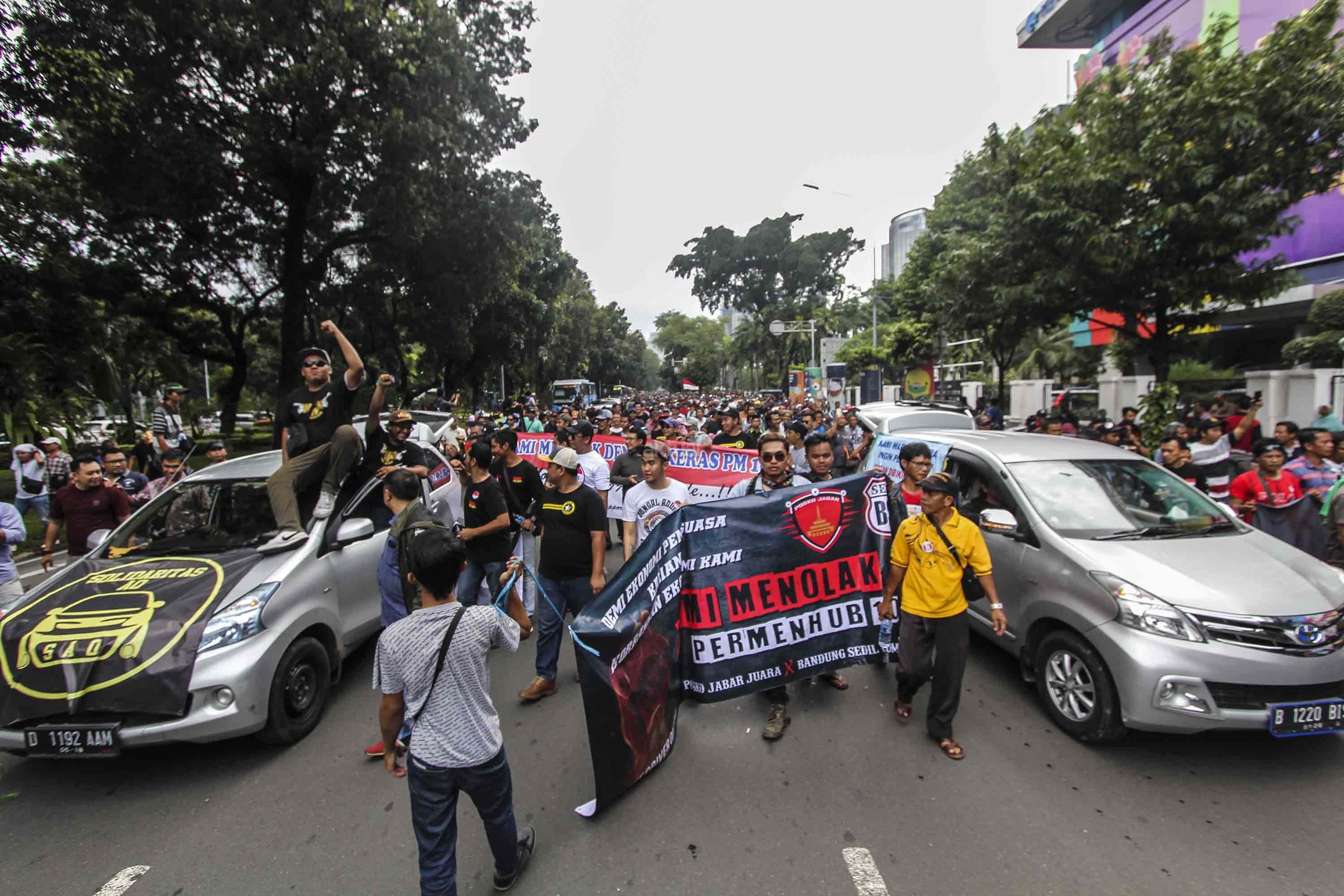 Pengemudi taksi online mengikuti aksi menolak Permenhub No.108 Tahun 2017 tentang Penyelenggaraan Angkutan Orang Dengan Kendaraan Bermotor Umum Tidak Dalam Trayek di depan Kantor Kementerian Perhubungan, Jakarta, Senin (29/1). Aksi tersebut menolak dilakukannya Uji KIR kendaraan dan juga membuat SIM A Umum, serta menolak pembentukan koperasi. AKTUAL/Tino Oktaviano