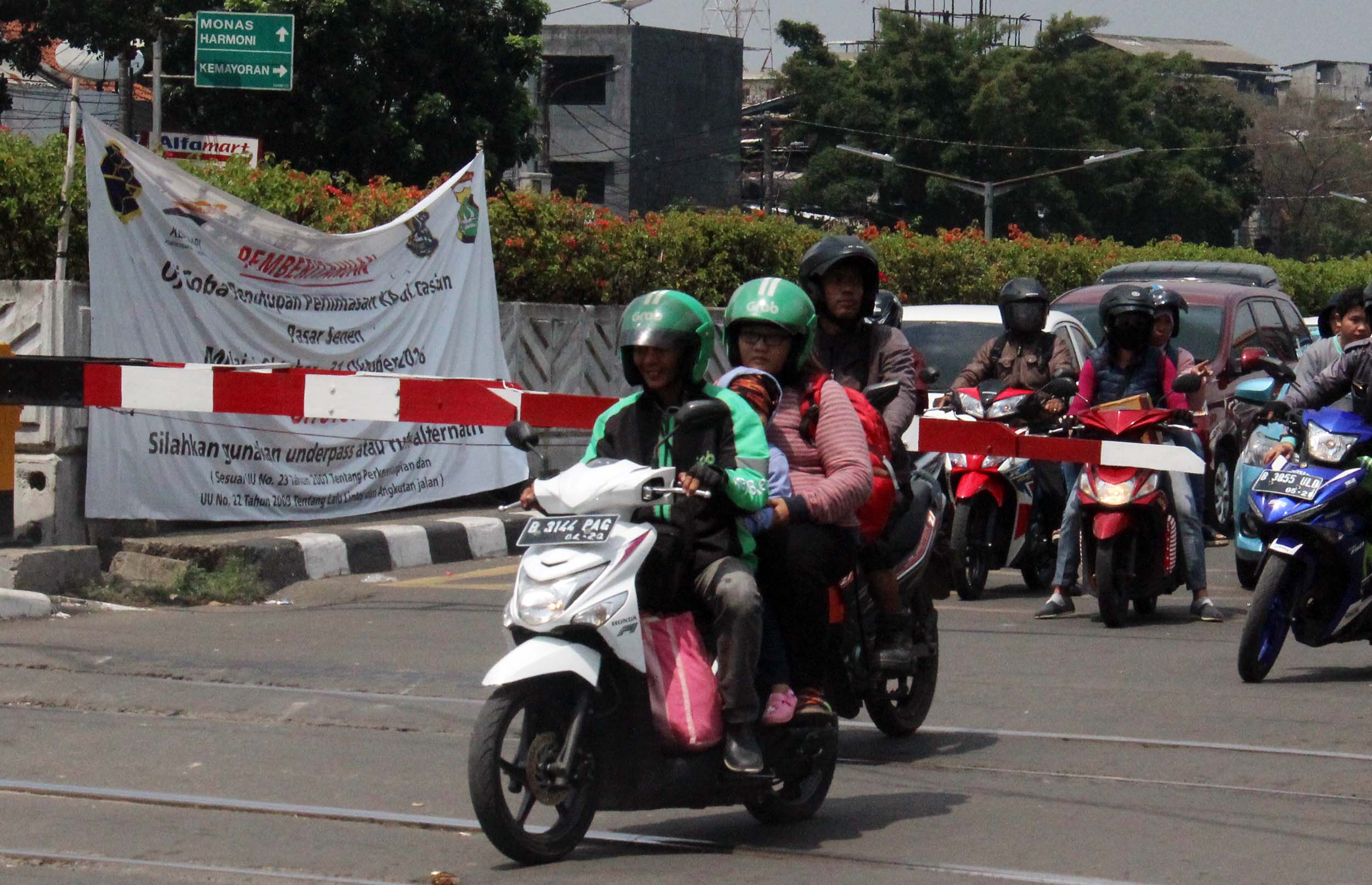 Pengendara sepeda motor menerobos palang pintu perlintasan kereta api Stasiun Pasar Senen, Jakarta Pusat, Jumat (9/9/2016). Perilaku pengguna jalan yang tidak tertib seperti ini berisiko menimbulkan kecelakaan lalu lintas.