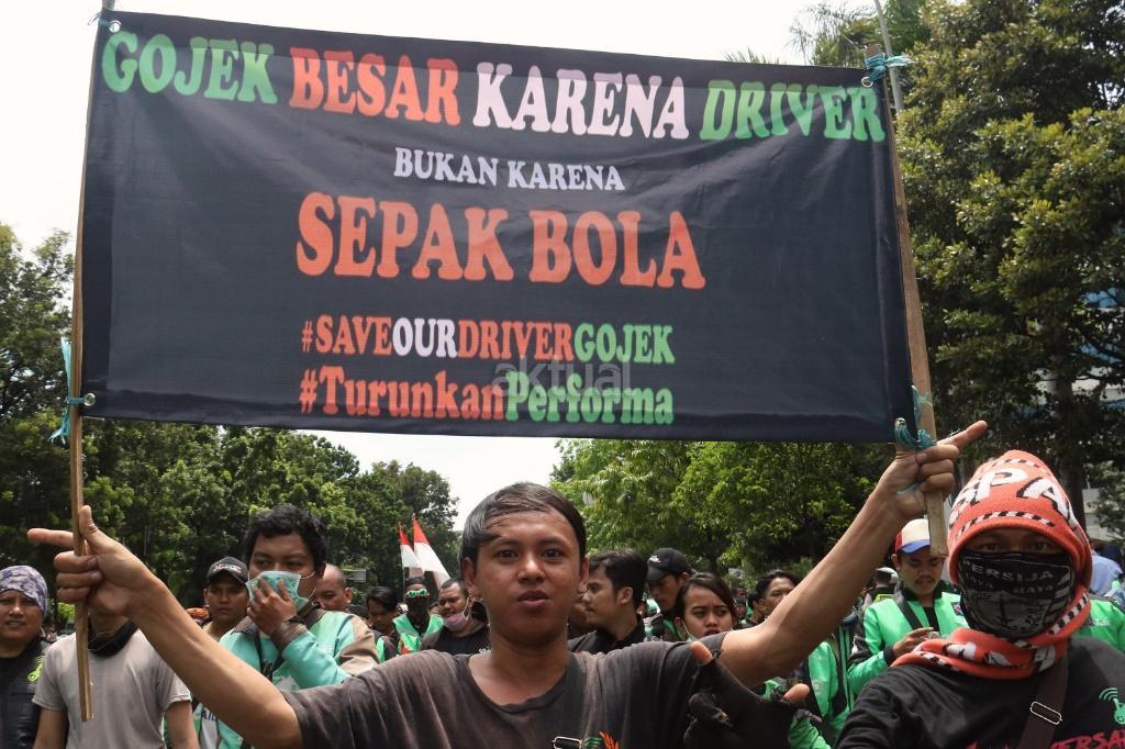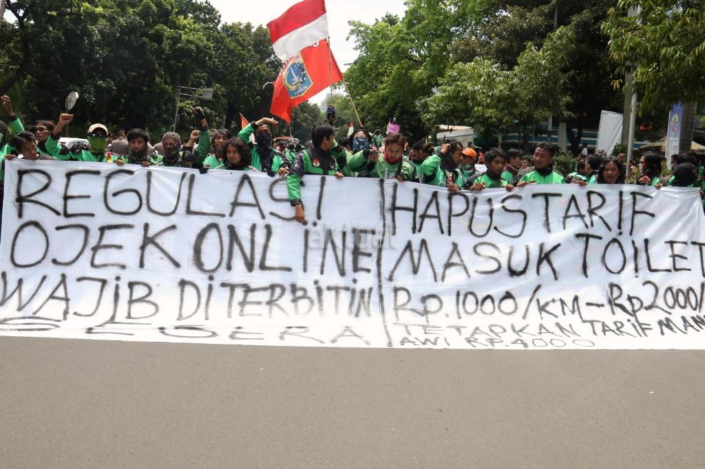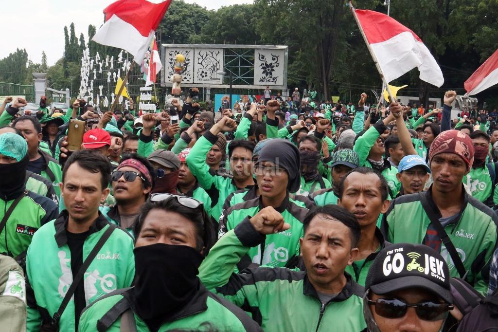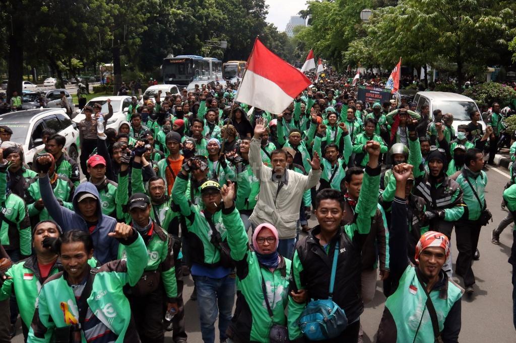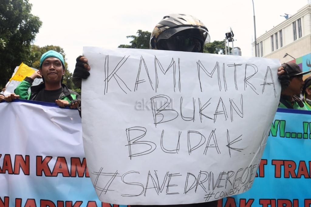 Ratusan driver ojek online melakukan aksi didepan Istana Merdeka, Jakarta, Kamis (23/11/2017). Dalam aksinya ratusan driver ojek online mendesak pemerintah mengeluarkan regulasi ojek online yang mengatur soal tarif. AKTUAL/Munzir