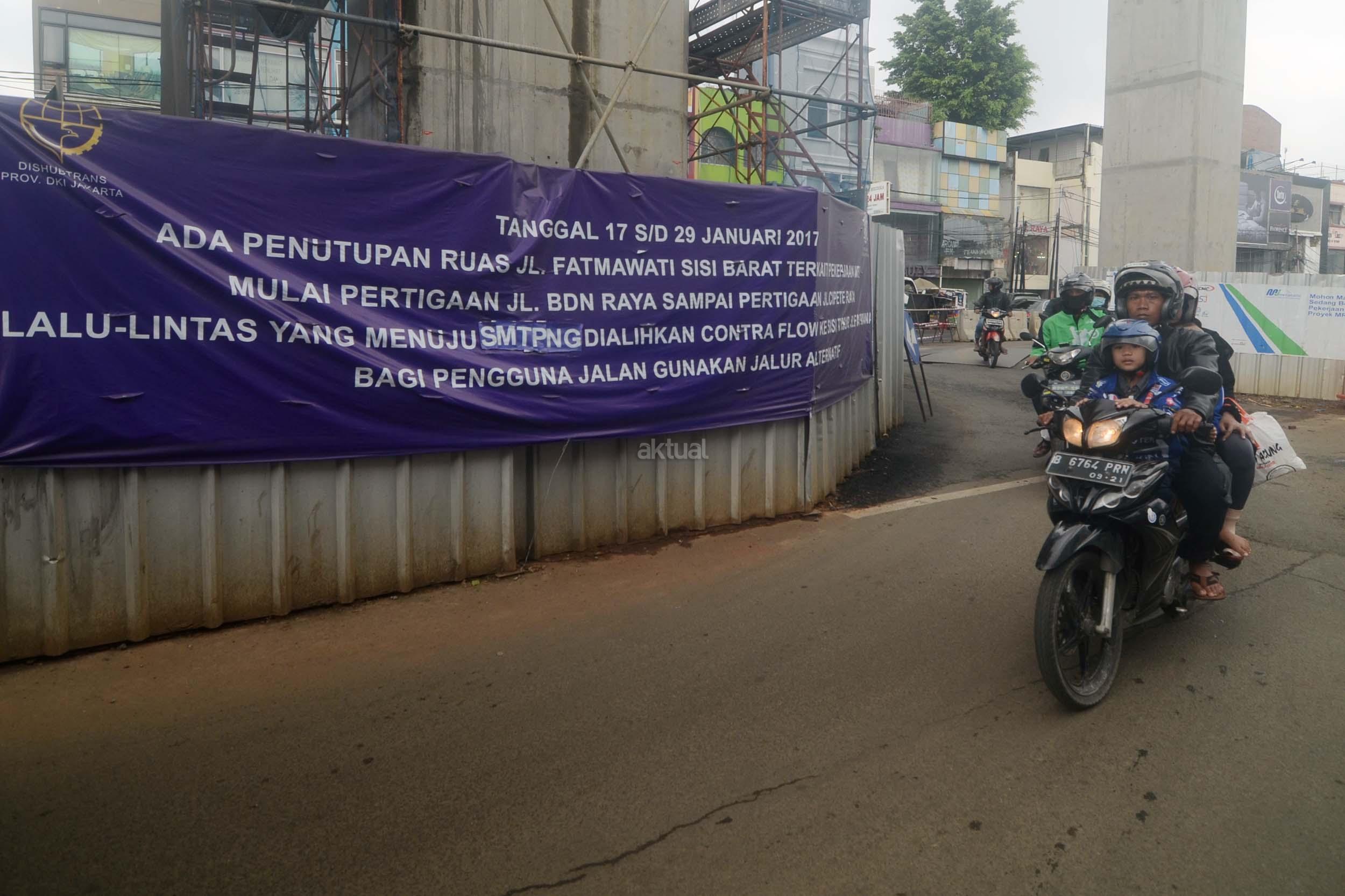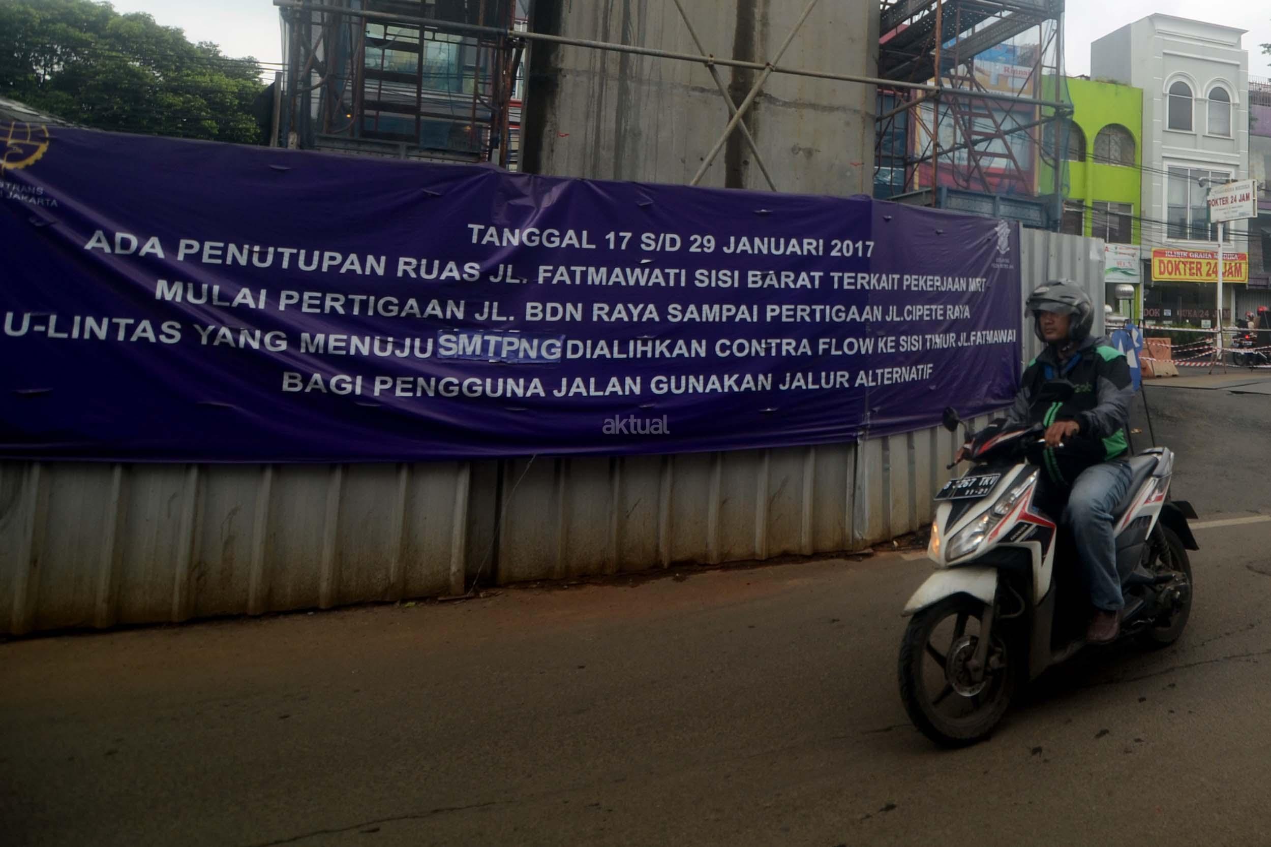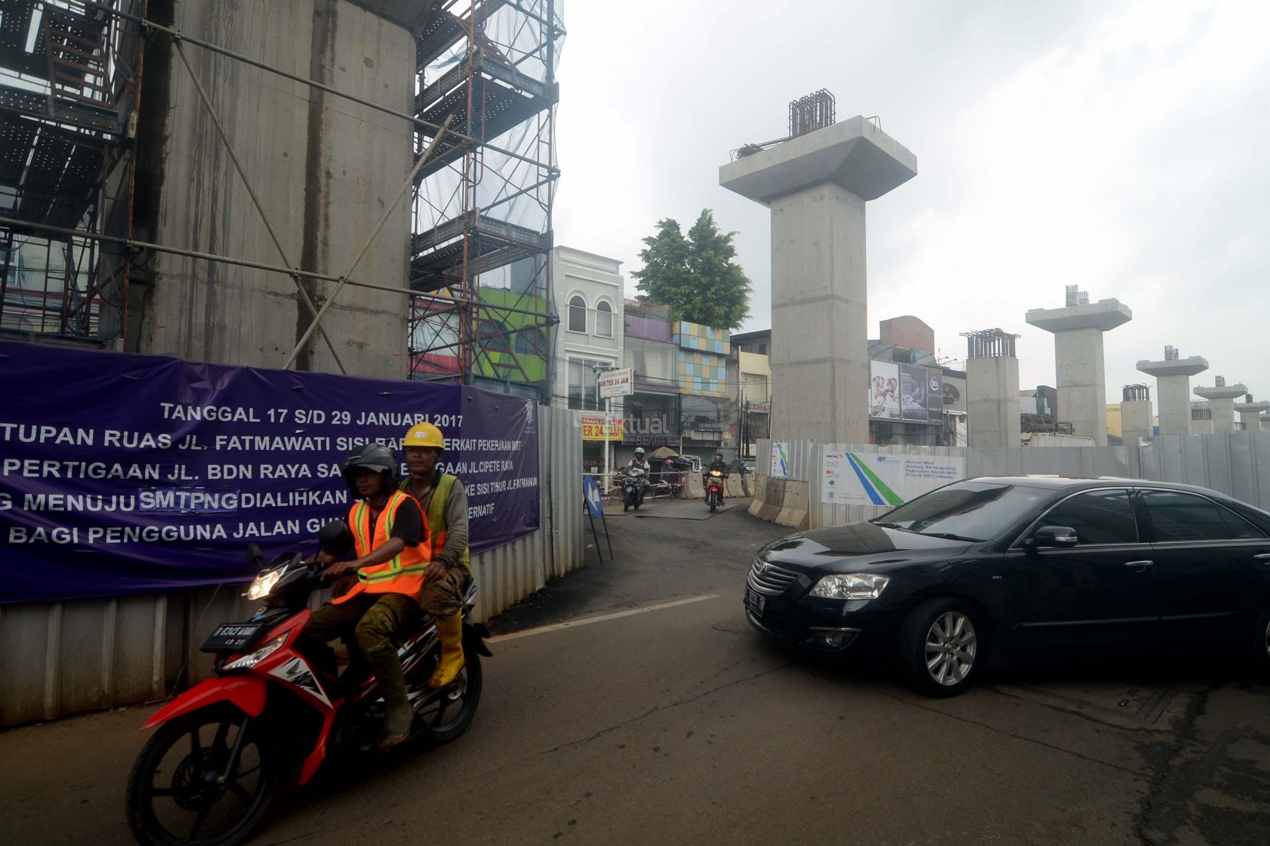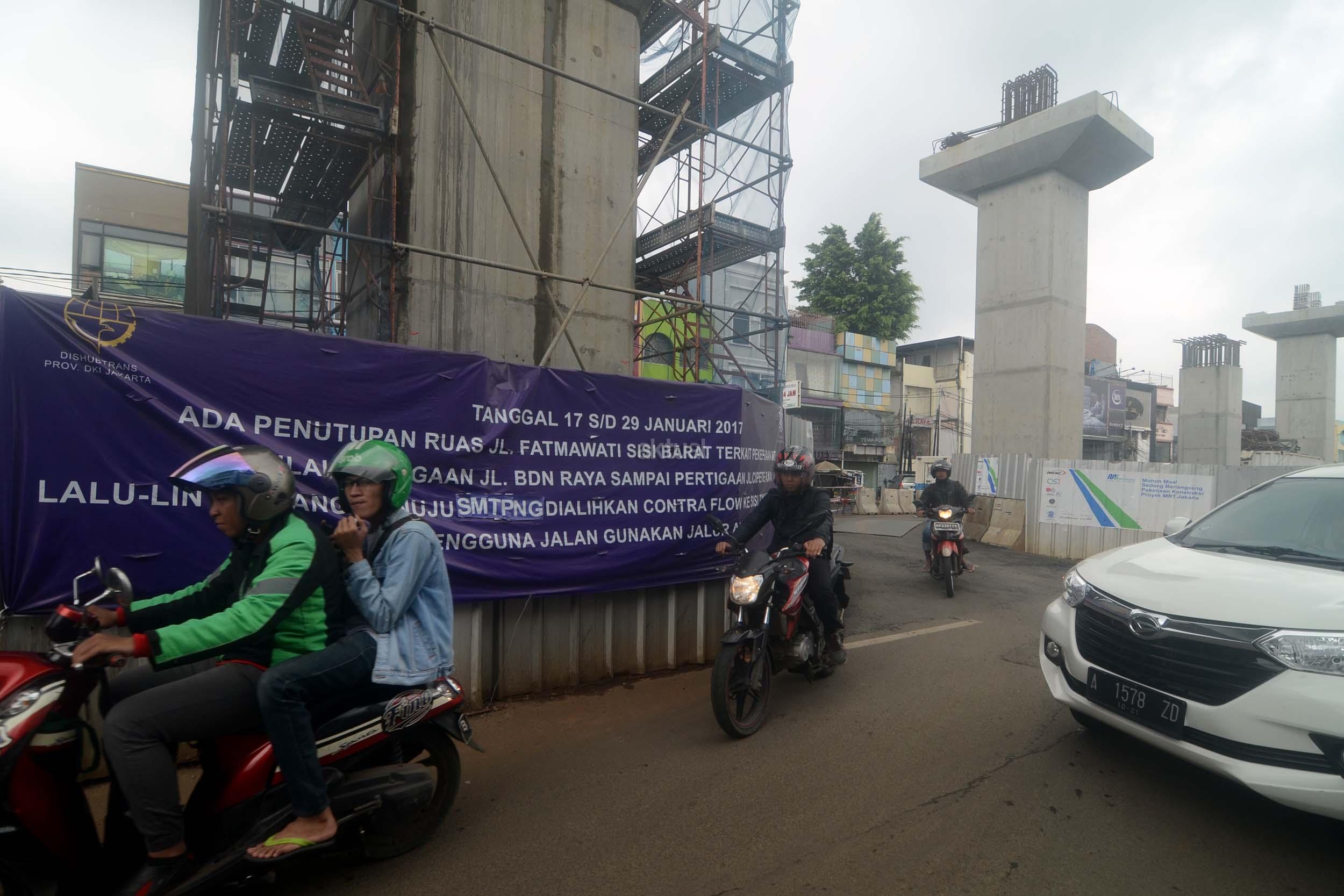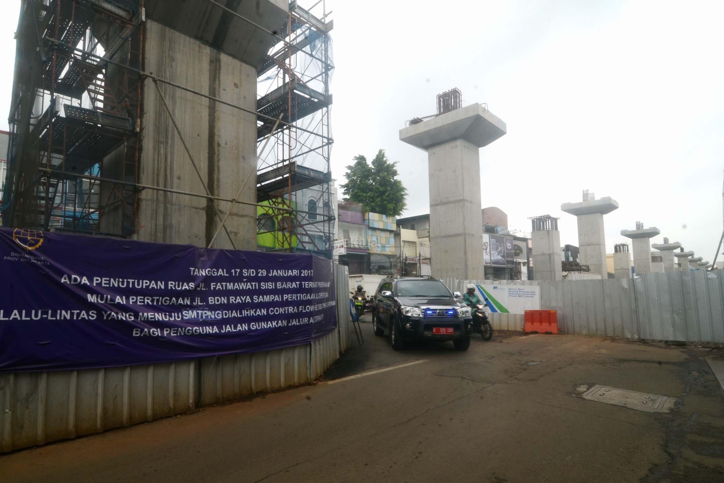 Sejumlah kendaraan melintas di dekat proyek Mass Rapid Transit (MRT) di Jalan Fatmawati, Jakarta. Senin (30/1/2017). PT MRT Jakarta berkordinasi dengan Dinas Perhubungan dan Transportasi Provinsi DKI Jakarta dan Ditlantas Polda Metro Jaya, akan melakukan penutupan Jalan Fatmawati mulai 4 Februari hingga 11 Agustus 2017 untuk pembangunan stasiun MRT Haji Nawi yang berlokasi di jalan tersebut. AKTUAL/Munzir