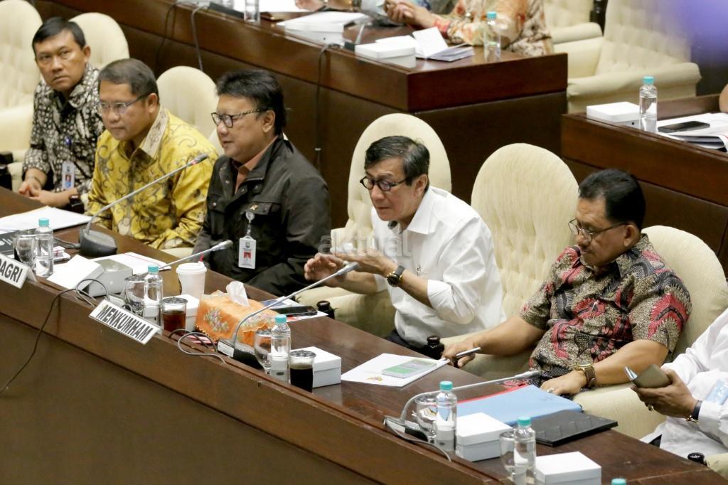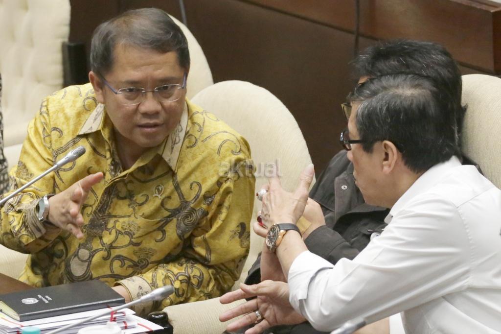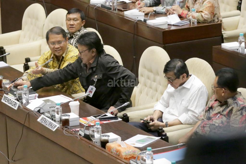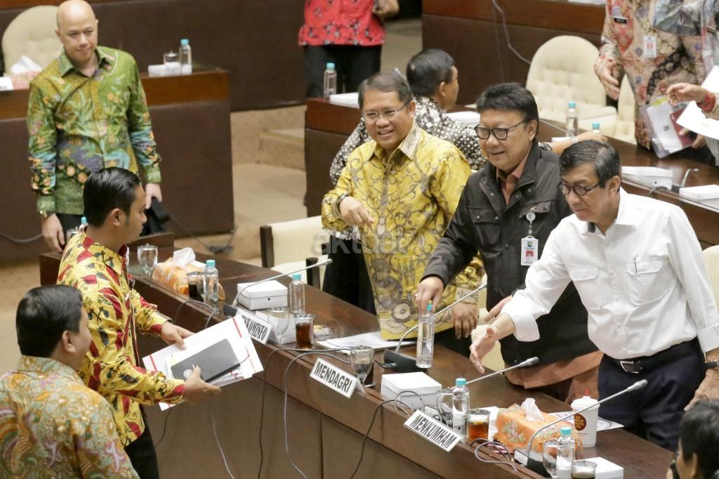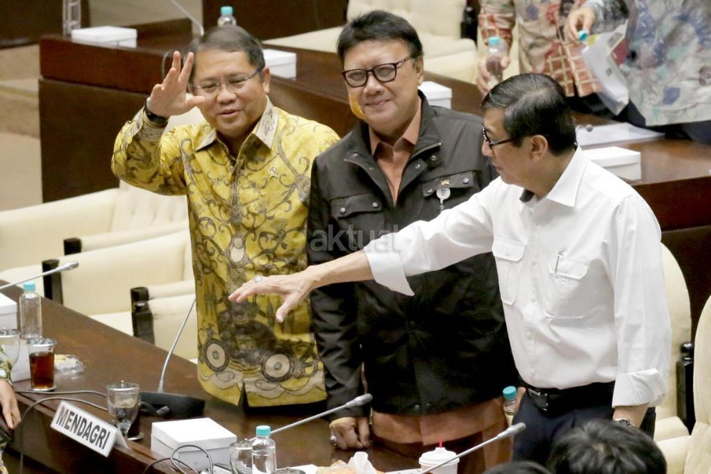 Menkominfo Rudiantara (kiri) berbincang dengan Mendagri Tjahjo Kumolo (tengah) dan Menkumham Yasonna Laoly ketika mengikuti rapat kerja di Kompleks Parlemen, Senayan, Jakarta, Jumat (20/10). Pemerintah dan Komisi II DPR menyepakati pengunduran pengesahan RUU Ormas tingkat satu pada Senin (23/10). AKTUAL/Tino Oktaviano