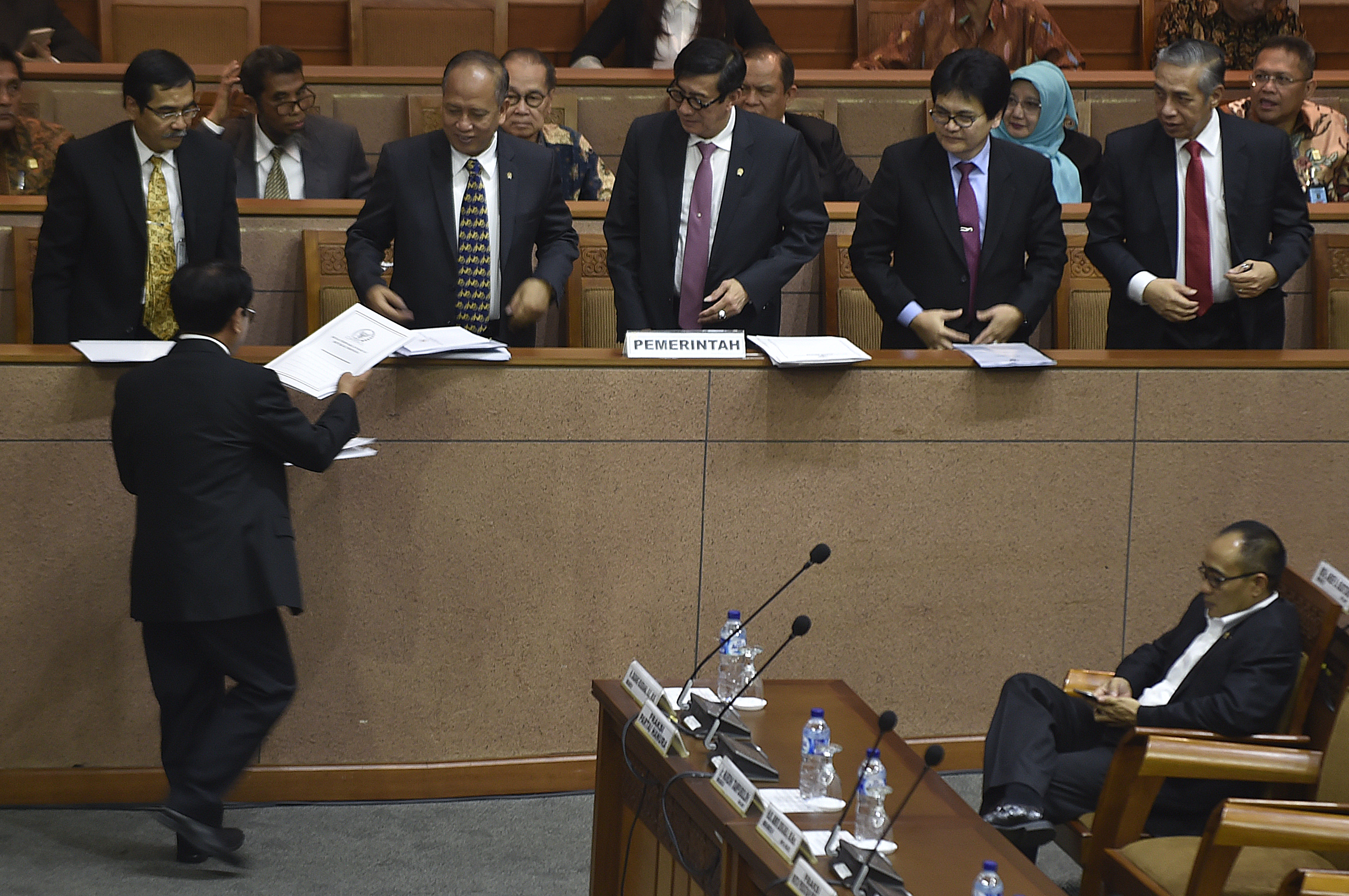 Ketua Pansus RUU Paten John Kenedy Azis (kiri) menyerahkan berkas kepada Menristek Dikti M Nasir (kedua kiri) dan Menteri Hukum dan HAM Yasonna Laoly (tengah) dalam sidang paripurna ke-35 masa sidang V tahun 2015-2016 di Komplek Parlemen Senayan, Jakarta, Kamis (28/7). DPR mengesahkan RUU tentang Paten menjadi Undang-Undang yang akan melindungi kesejahteraan dan keselamatan rakyat pada bidang kesehatan, keselamatan lingkungan dan pertahanan keamanan negara. ANTARA FOTO/Puspa Perwitasari/ama/16