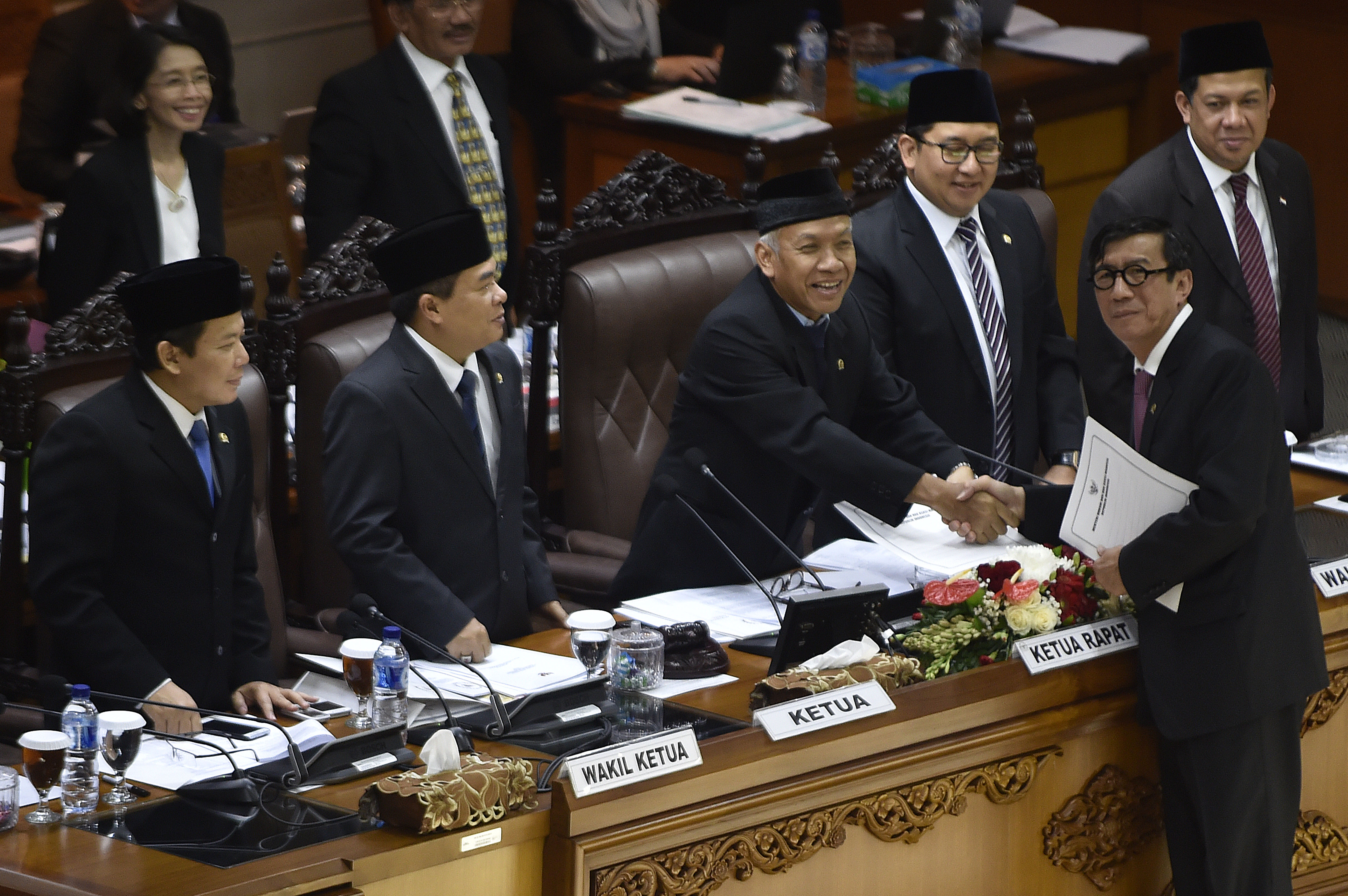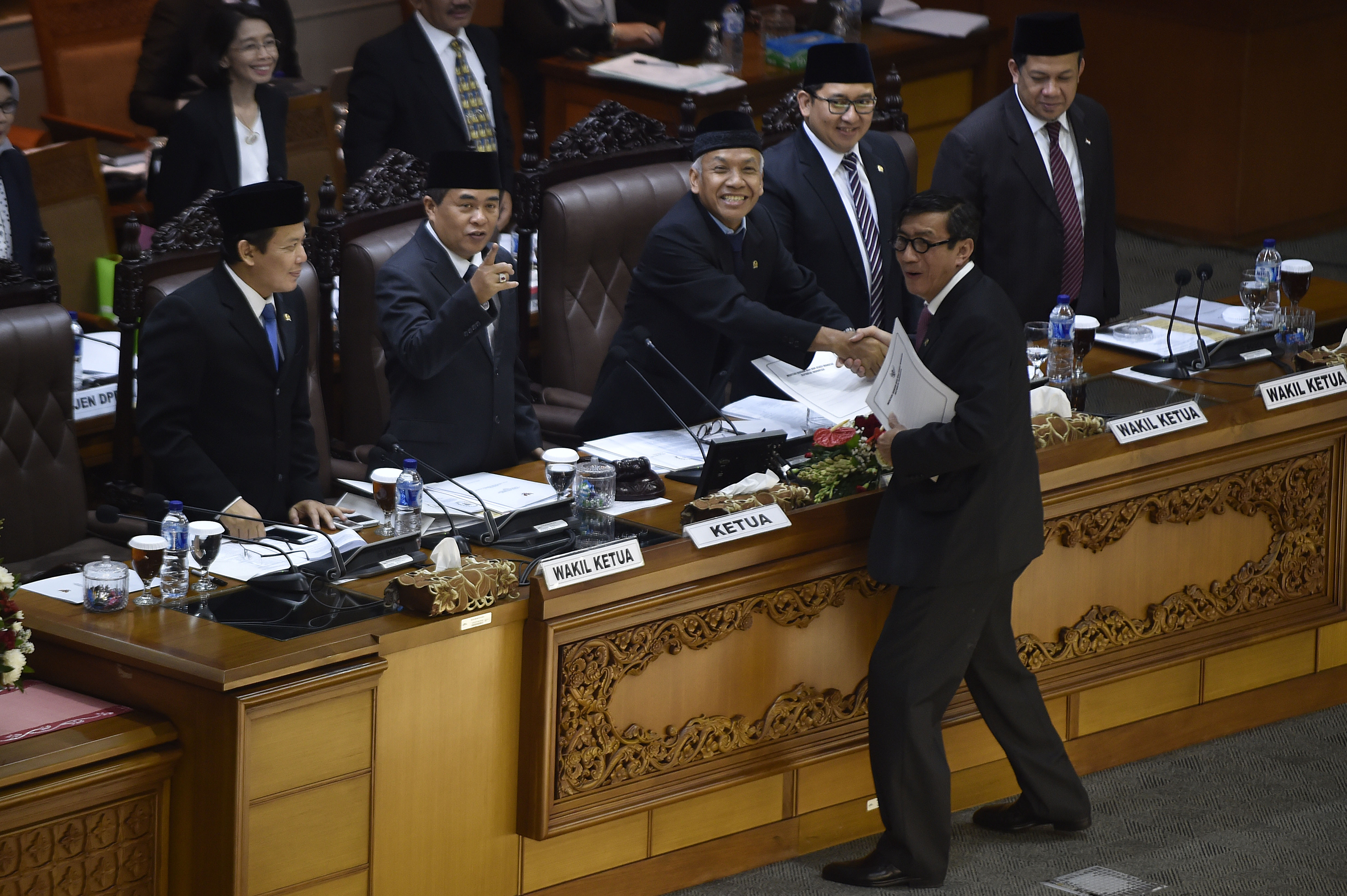 Menteri Hukum dan HAM Yasonna Laoly menyerahkan berkas tanggapan pemerintah tentang RUU Paten kepada pimpinan DPR dalam sidang paripurna ke-35 masa sidang V tahun 2015-2016 di Komplek Parlemen Senayan, Jakarta, Kamis (28/7). DPR mengesahkan RUU tentang Paten menjadi Undang-Undang yang akan melindungi kesejahteraan dan keselamatan rakyat pada bidang kesehatan, keselamatan lingkungan dan pertahanan keamanan negara. ANTARA FOTO/Puspa Perwitasari/ama/16