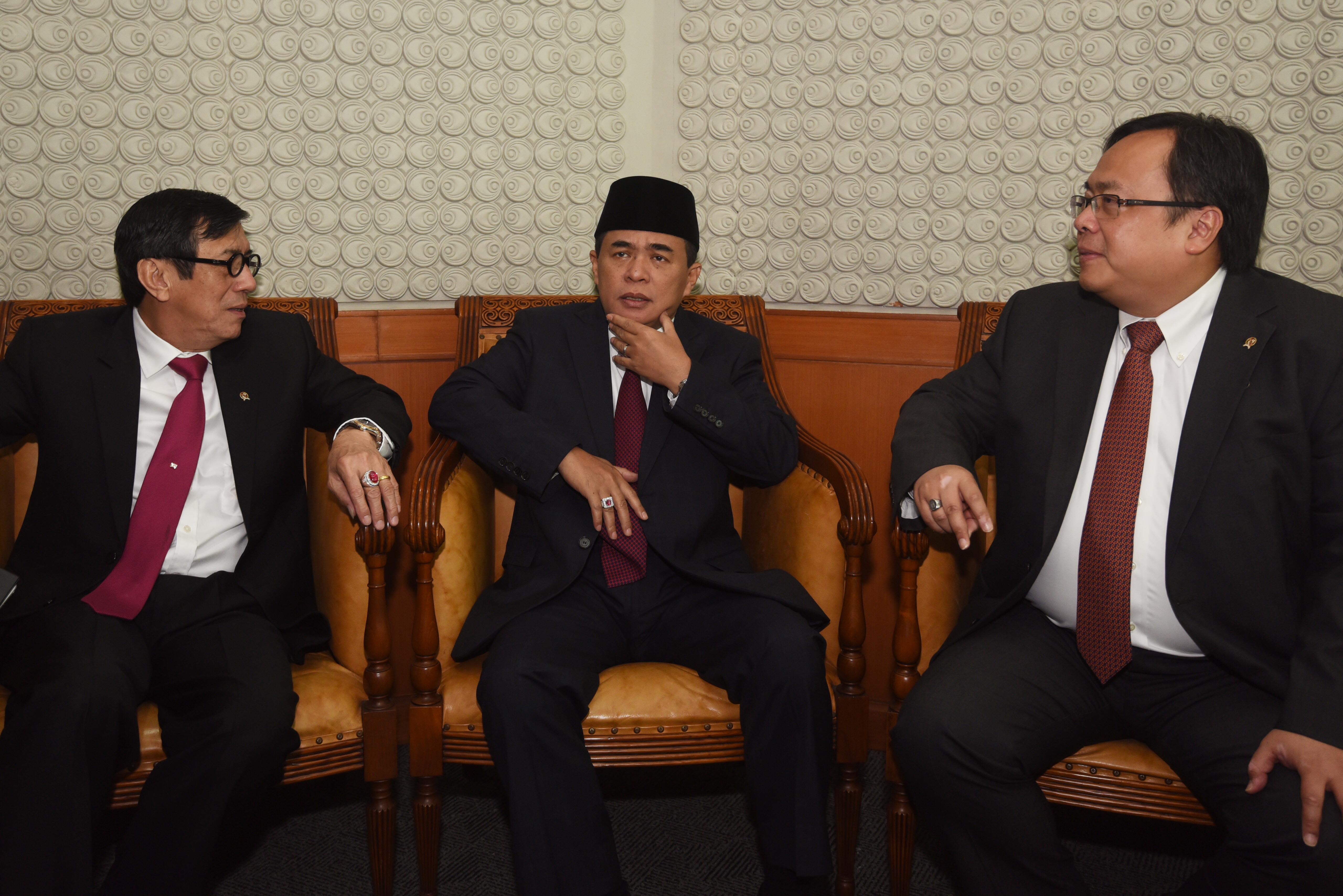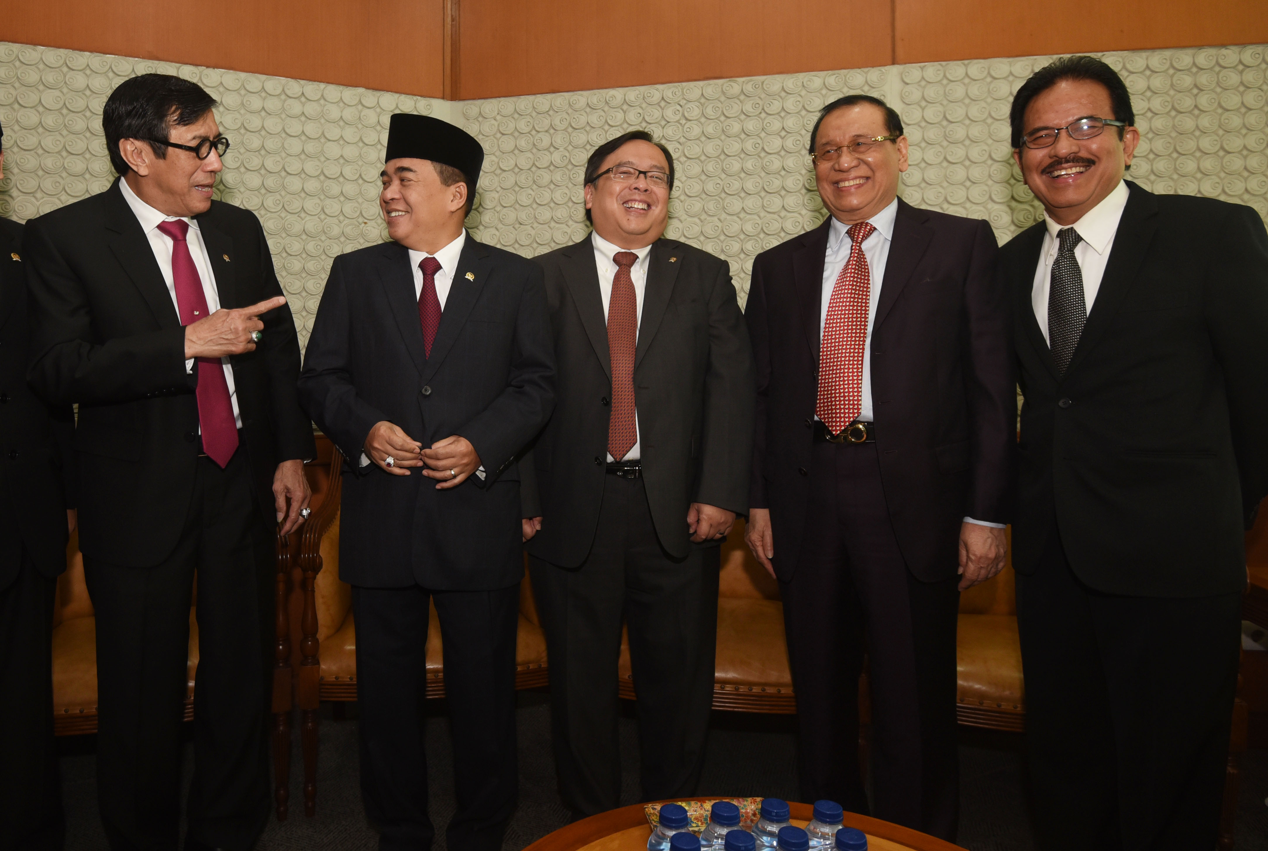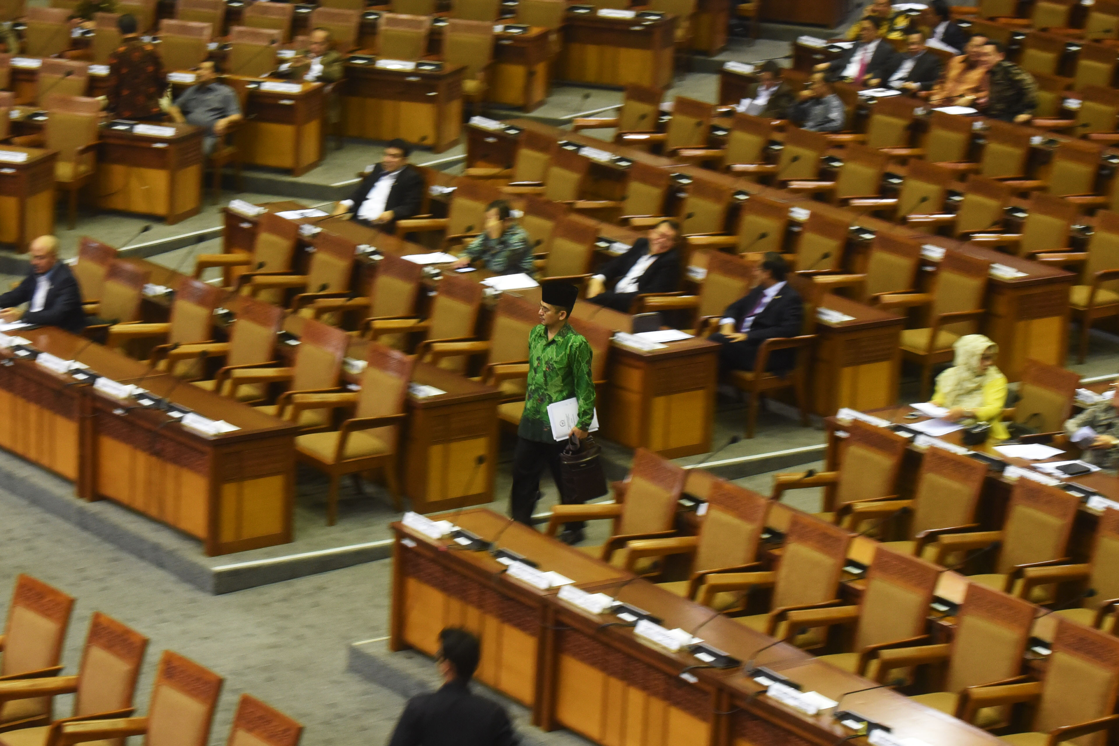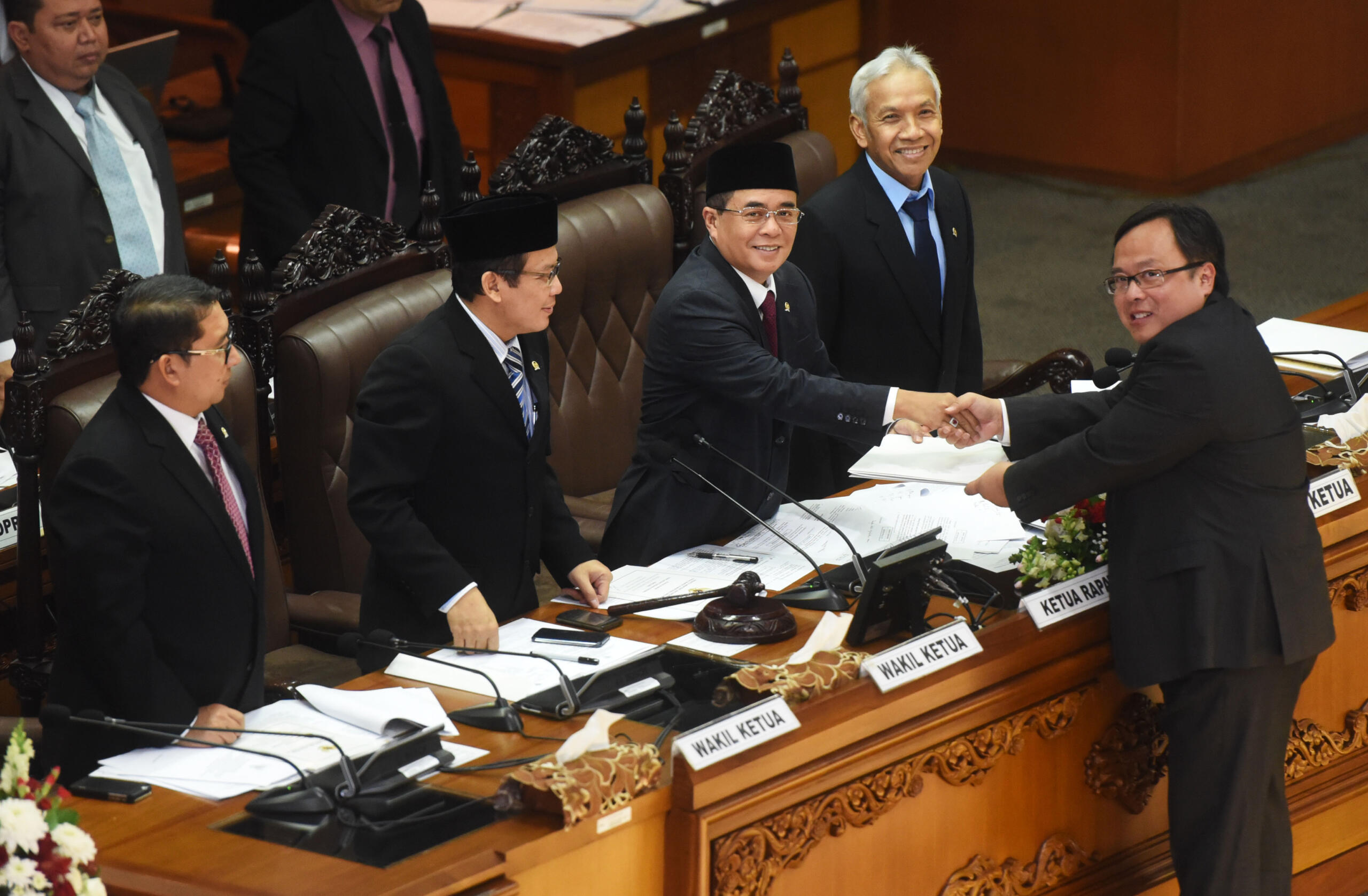 Menkeu Bambang Brodjonegoro (kanan) menyerahkan pandangan pemerintah kepada Ketua DPR Ade Komarudin (tengah), disaksikan Wakil Ketua Fadli Zon (kiri), Taufik Kurniawan (kedua kiri) dan Agus Hermanto dalam Rapat Paripurna di Kompleks Parlemen Senayan, Jakarta, Selasa (28/6). Dalam rapat itu DPR menyetujui RUU tentang Pengampunan Pajak dan RUU tentang APBN Perubahan tahun 2016 disahkan menjadi Undang-Undang. ANTARA FOTO/Akbar Nugroho Gumay/foc/16.