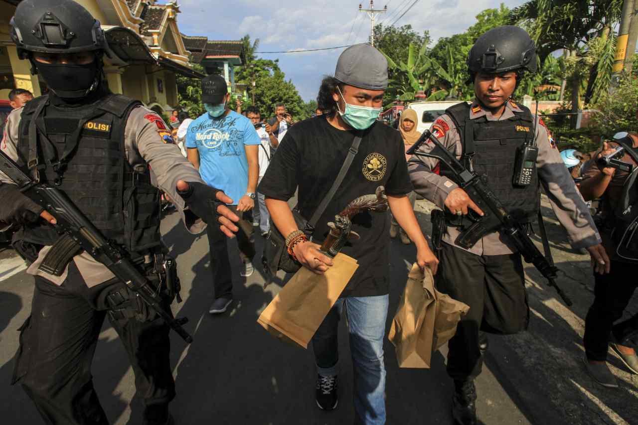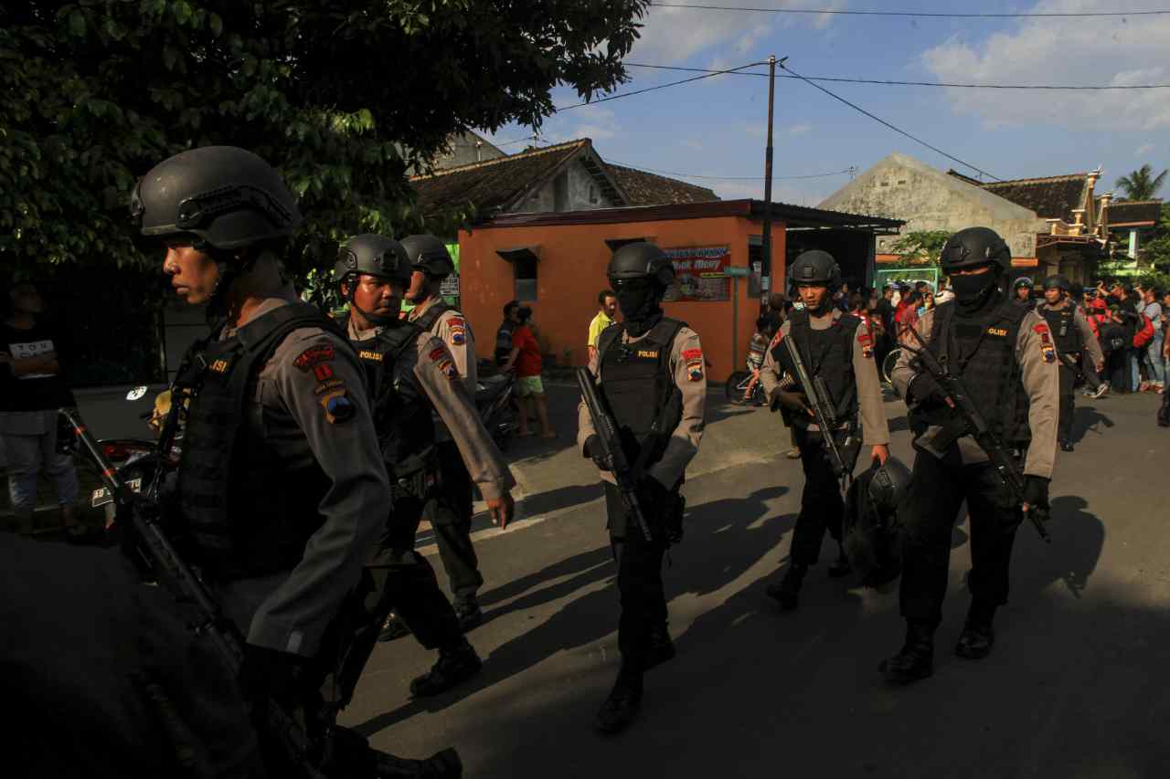 Anggota Datasemen Khusus (Densus) 88 antiteror Mabes Polri membawa barang bukti milik terduga teroris jaringan Nur Rohman, Haryanto alias Hasan di Makam Haji, Sukoharjo, Jawa Tengah, Selasa (19/7). Penggeledahan tersebut masih terkait dalam pengembangan kasus bom bunuh diri di Mapolresta Solo yang dilakukan oleh Nur Rohman beberapa waktu lalu. ANTARA FOTO/Maulana Surya/Spt/16.